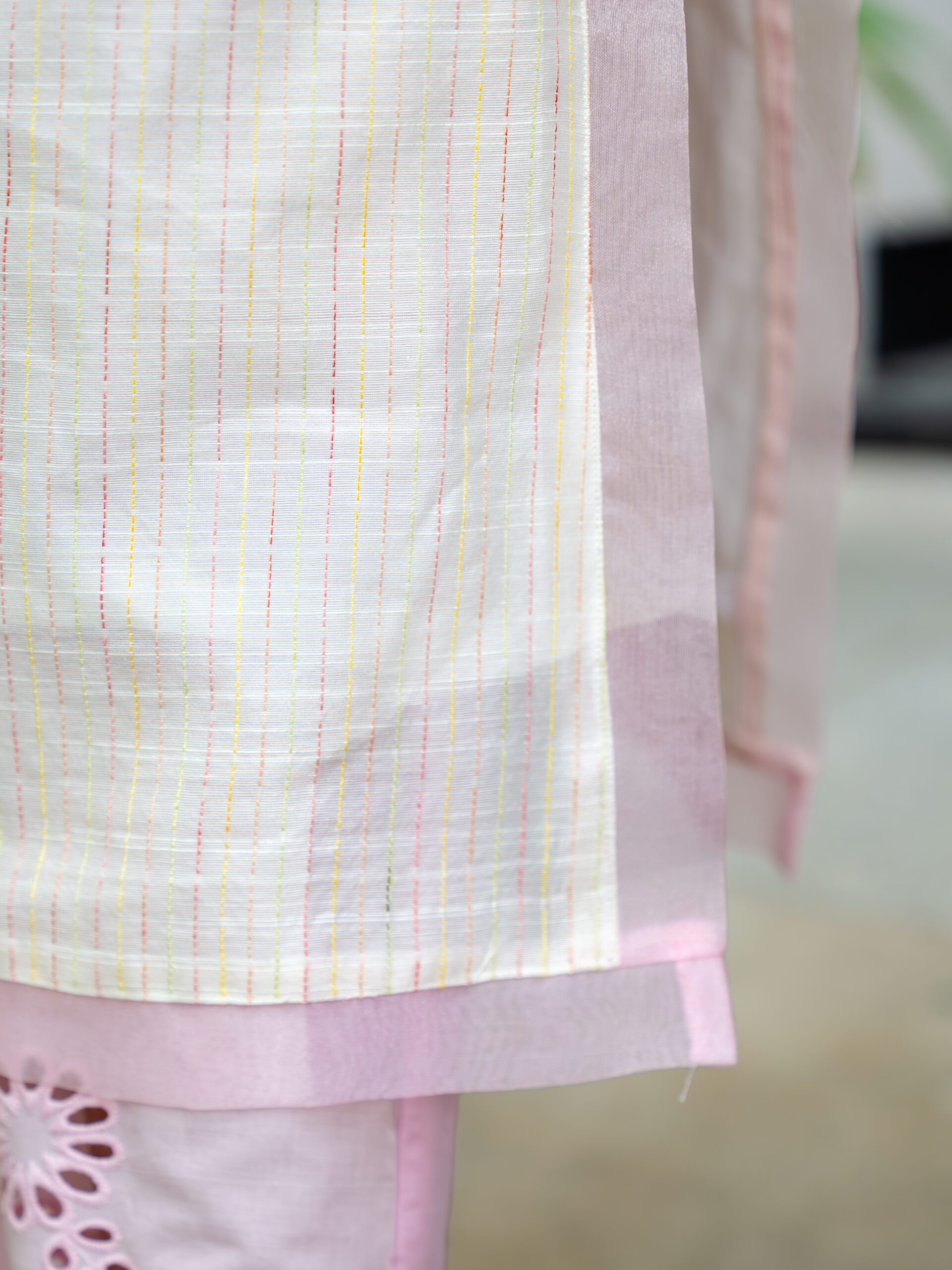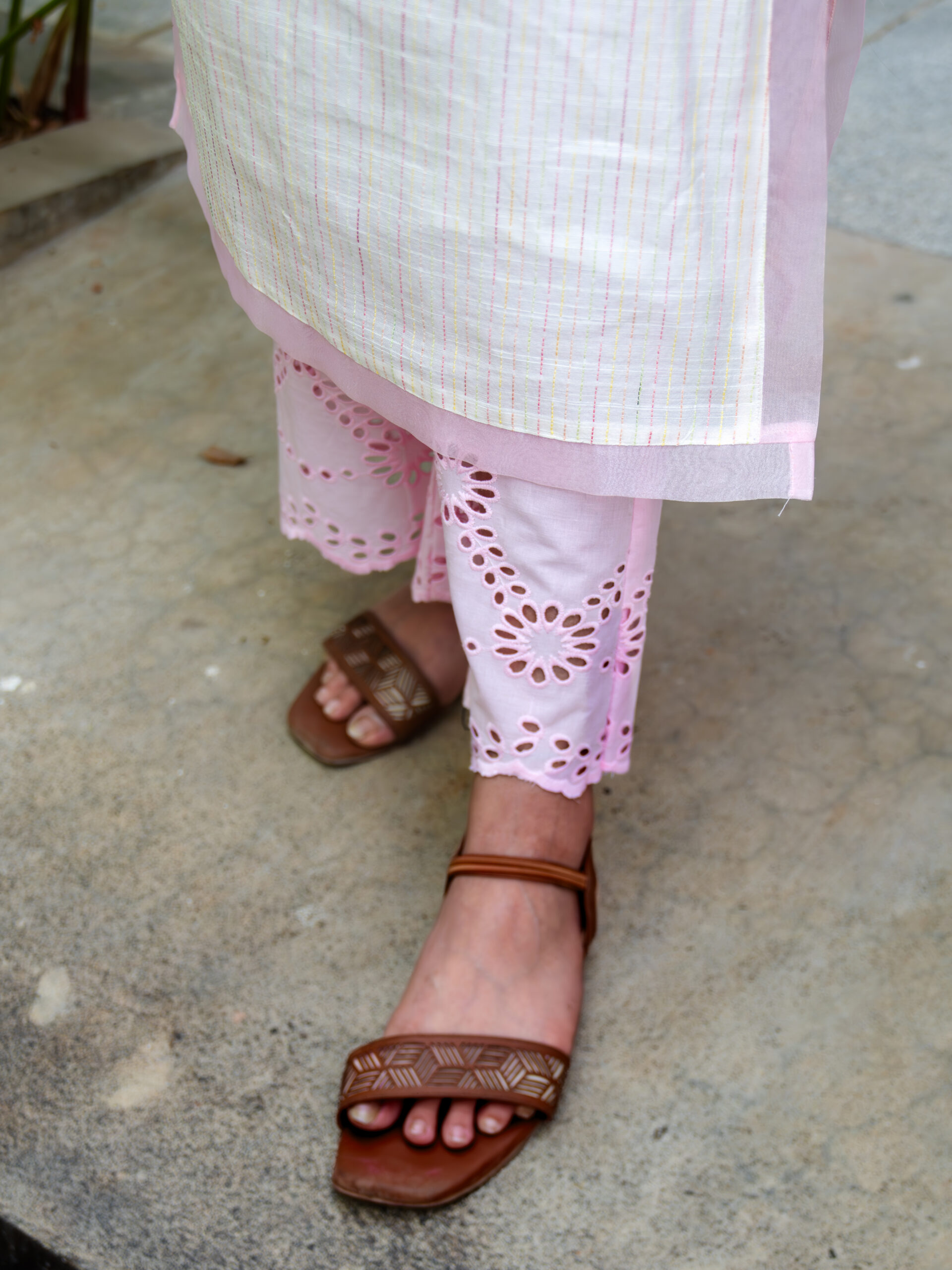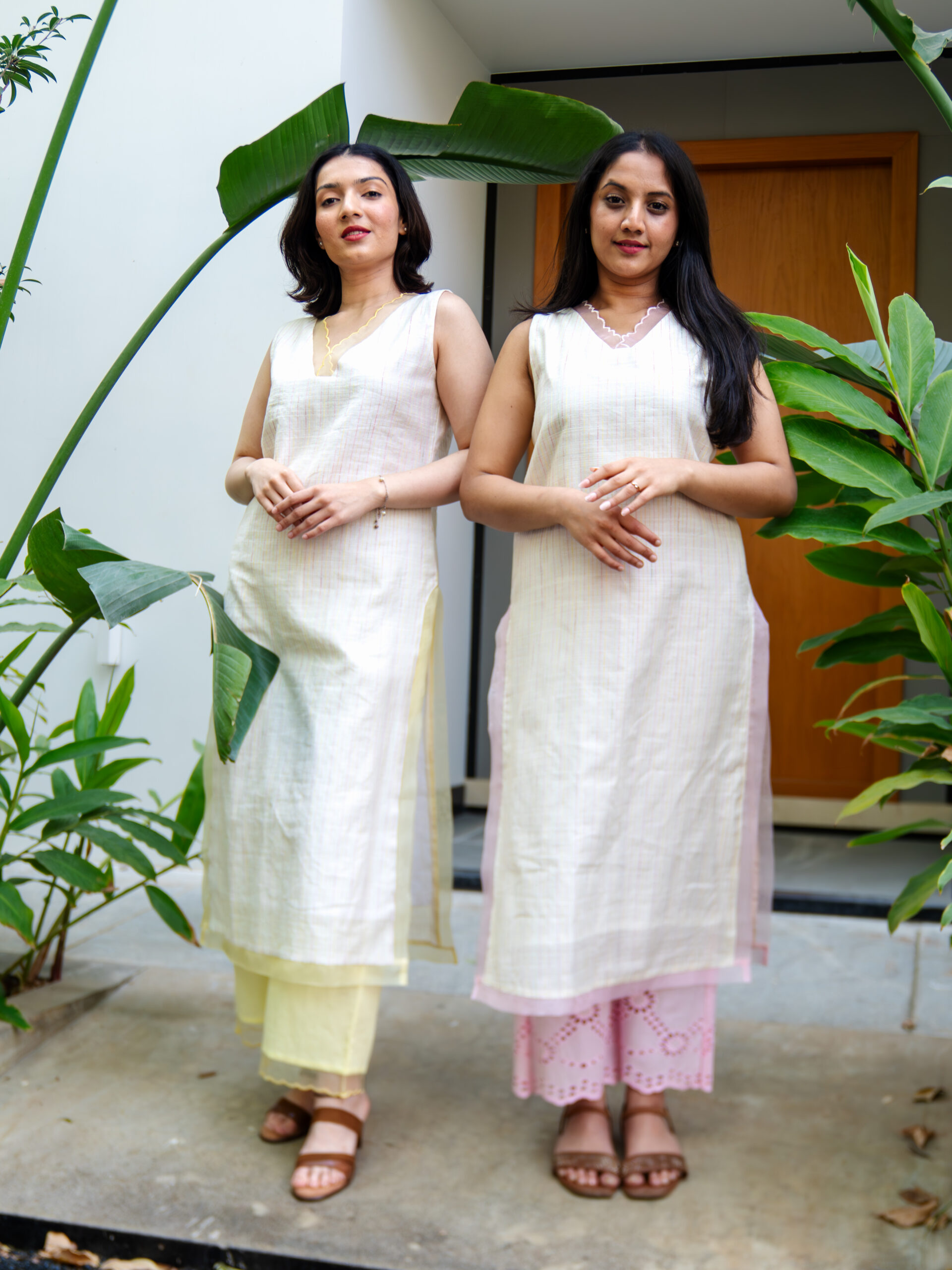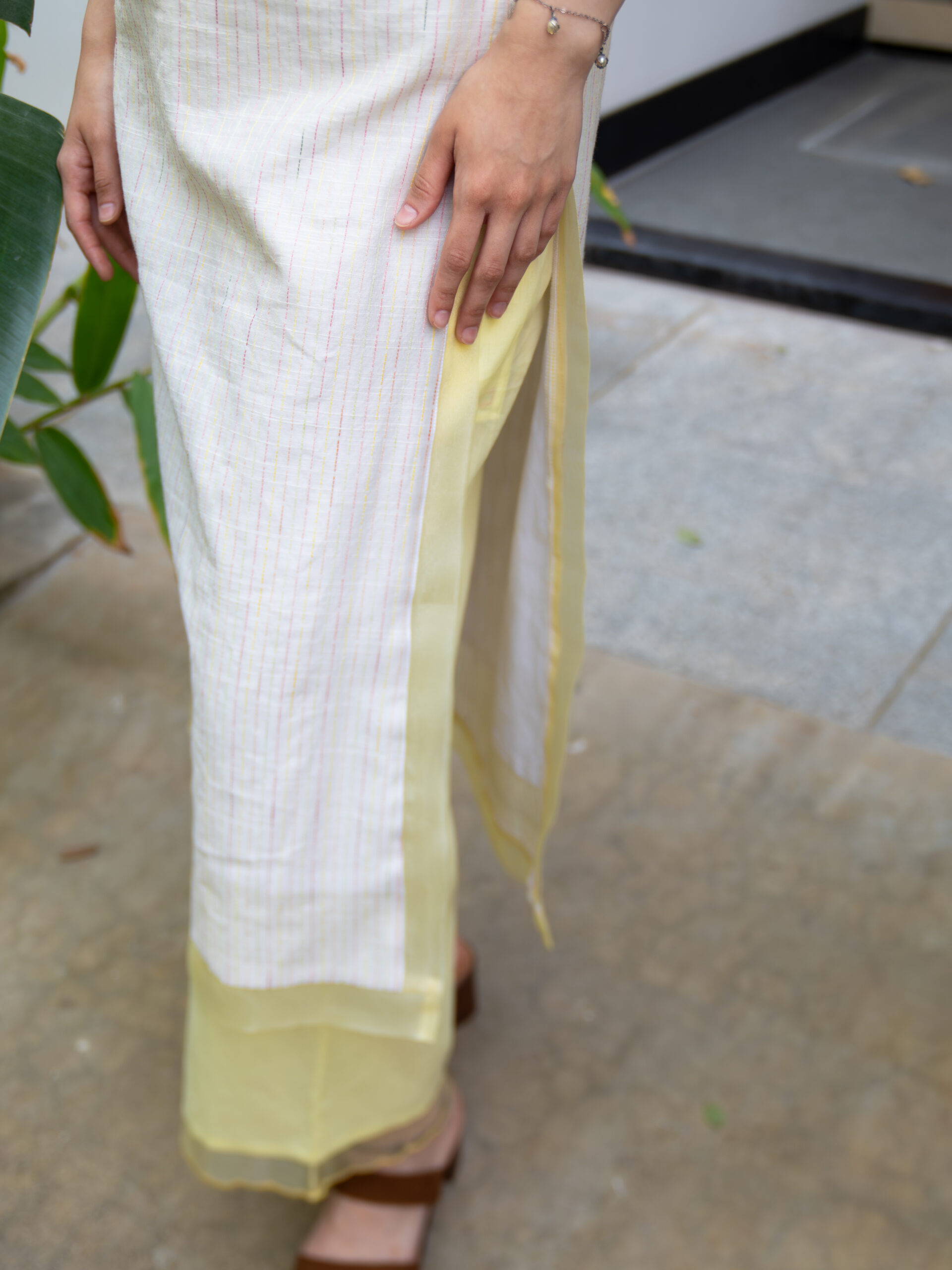 Introducing our intricately crafted kurta set—made in textured slubby cotton, enriched with delicate, colourful Kantha stitches that lend it a handcrafted, artisanal character. The kurta features a soft, breathable silhouette designed for all-day comfort, while celebrating traditional detailing with a modern sensibility.A standout element is the scalloped sheer organza panel at the neckline—gracefully extending to both the front and back—adding a light, ethereal touch.This detailing is echoed along the hemline and side slits, creating a cohesive, feminine finish.Designed with versatility in mind, the kurta comes with attachable sleeves, allowing you to style it your way. It is paired with cotton pants featuring a scalloped hem and an elasticated waistband for ease and comfort.