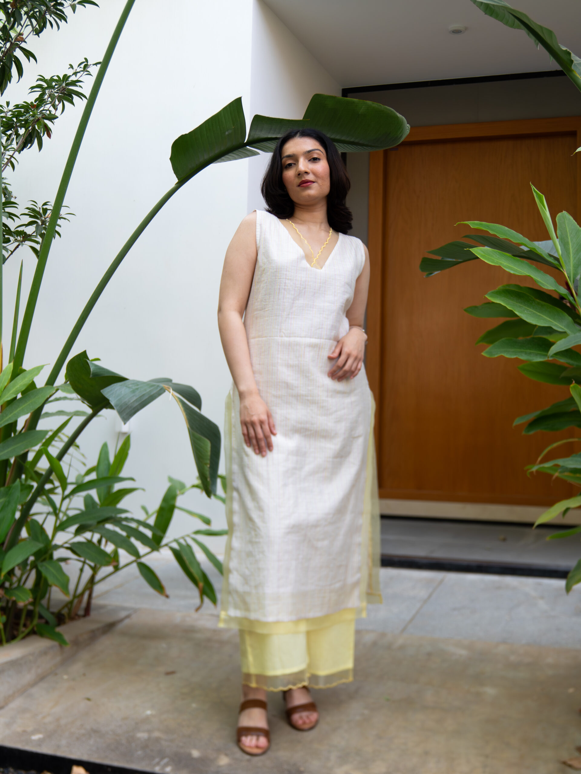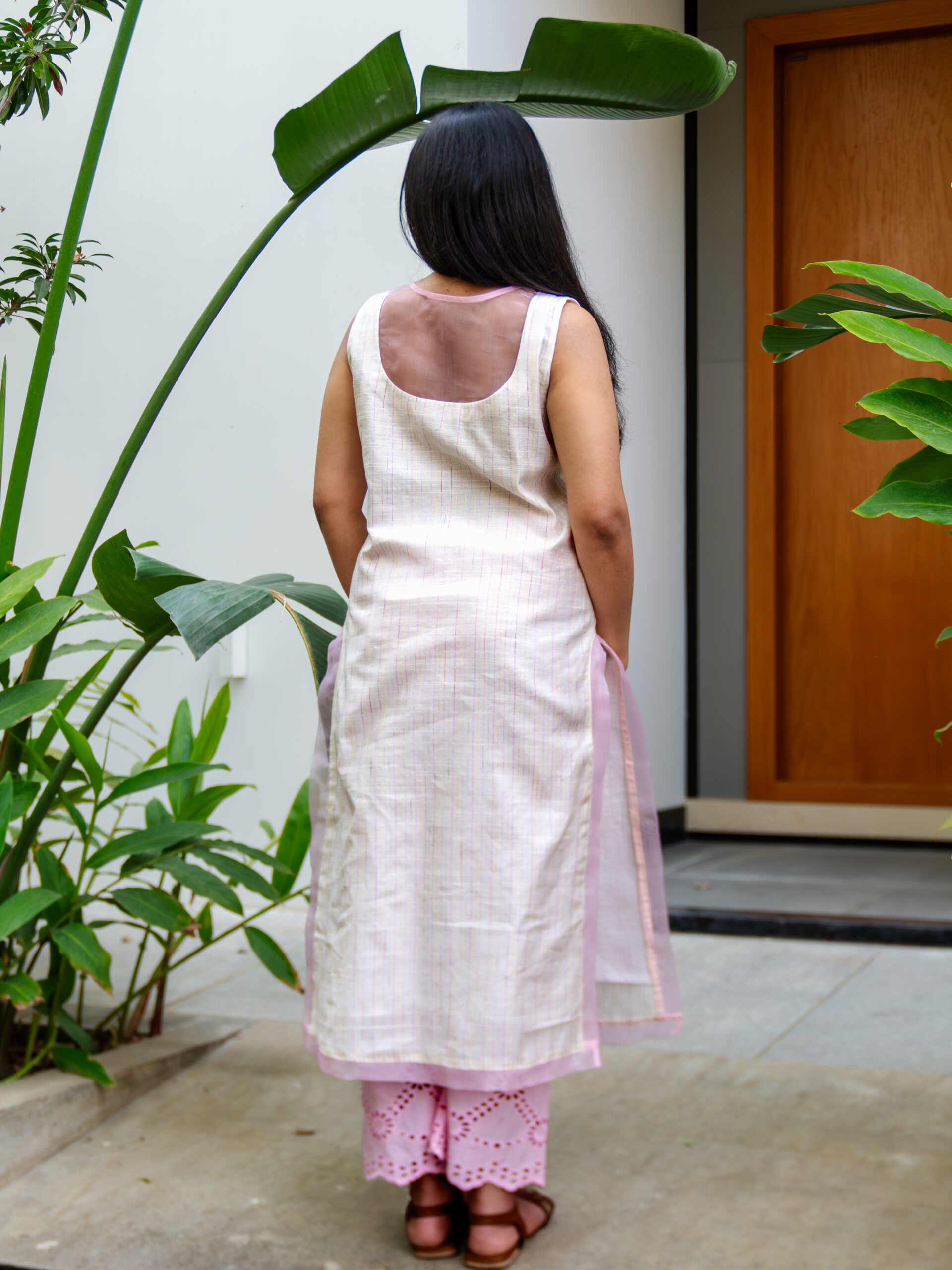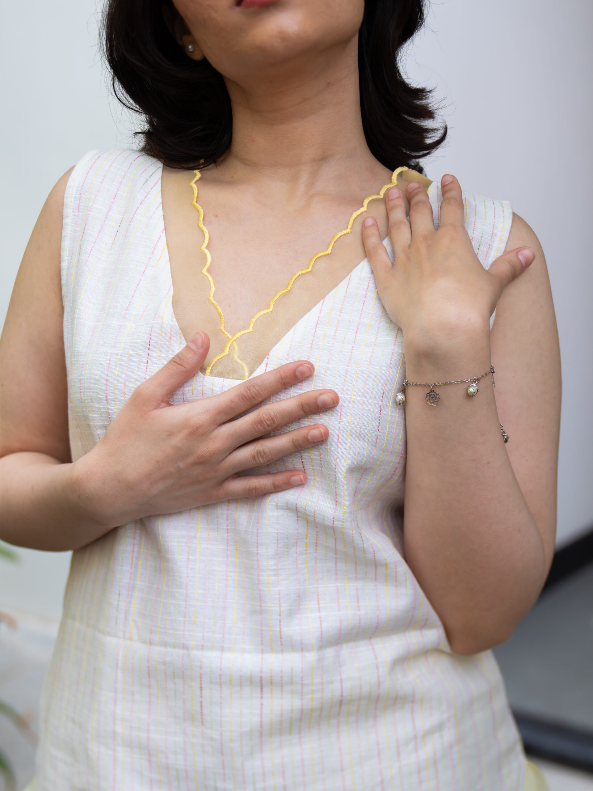 Introducing our intricately crafted kurta set—made in textured slubby cotton, enriched with delicate, colourful Kantha stitches that lend it a handcrafted, artisanal character. The kurta features a soft, breathable silhouette designed for all-day comfort, while celebrating traditional detailing with a modern sensibility.A standout element is the scalloped sheer organza panel at the neckline—gracefully extending to both the front and back—adding a light, ethereal touch.This detailing is echoed along the hemline and side slits, creating a cohesive, feminine finish.Designed with versatility in mind, the kurta comes with attachable sleeves, allowing you to style it your way. It is paired with cotton pants featuring a scalloped hem and an elasticated waistband for ease and comfort.