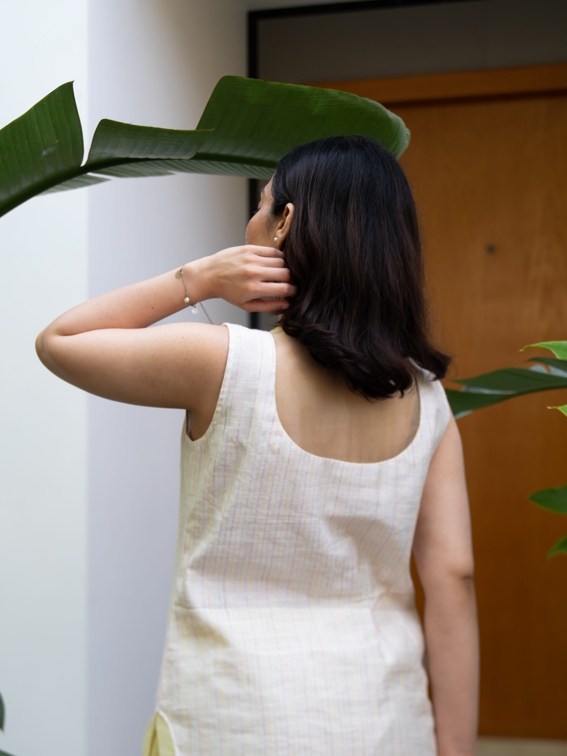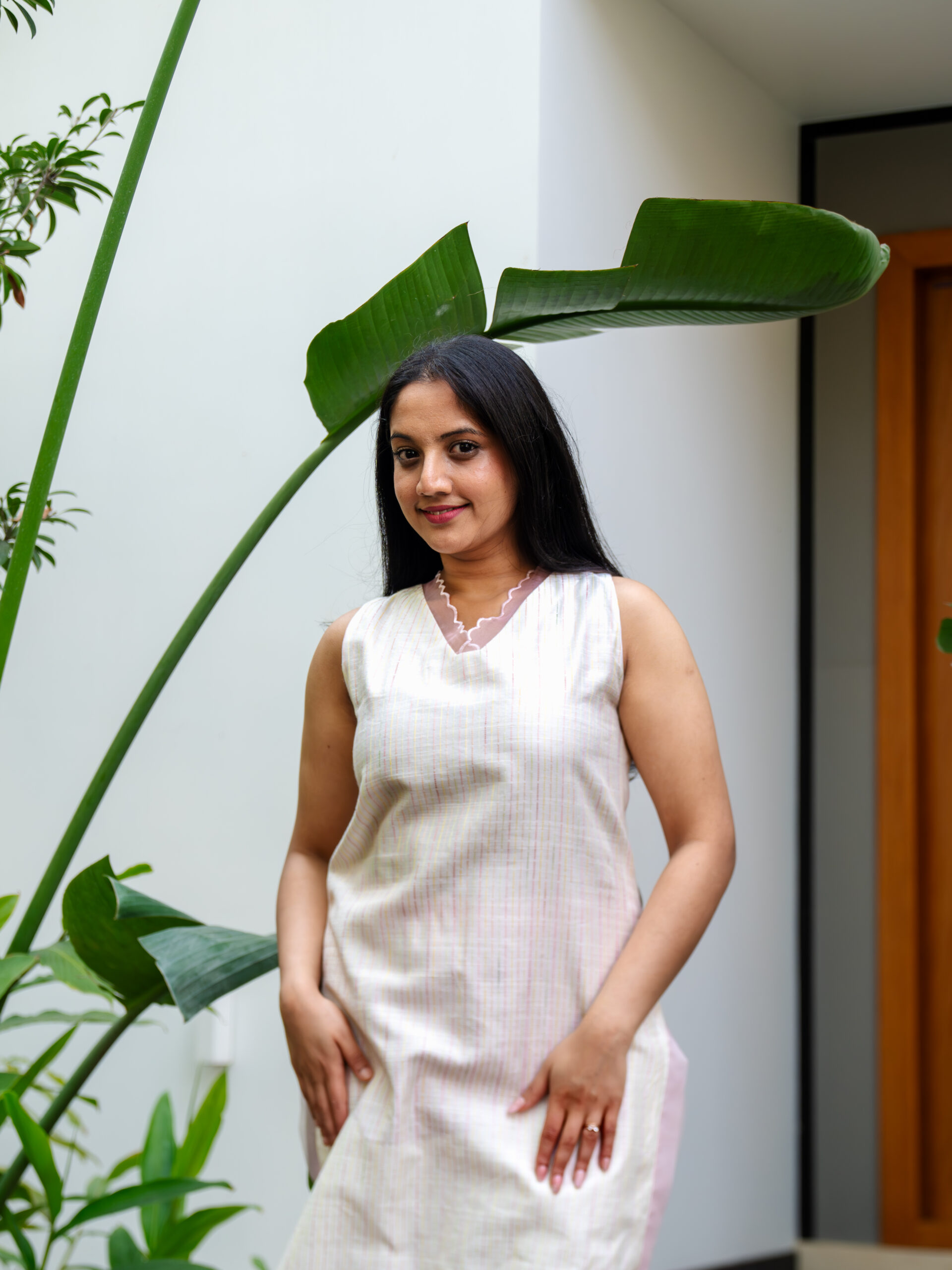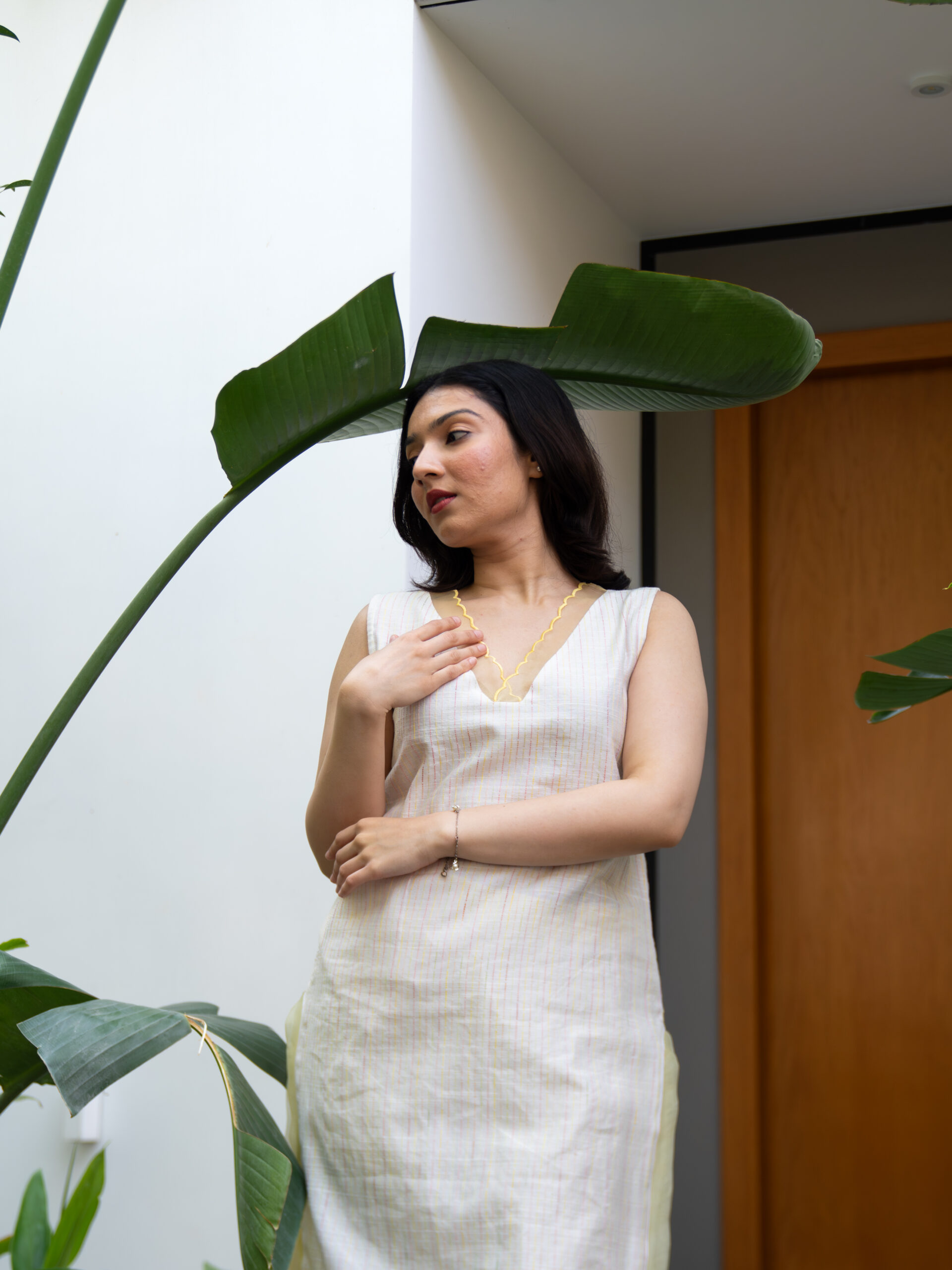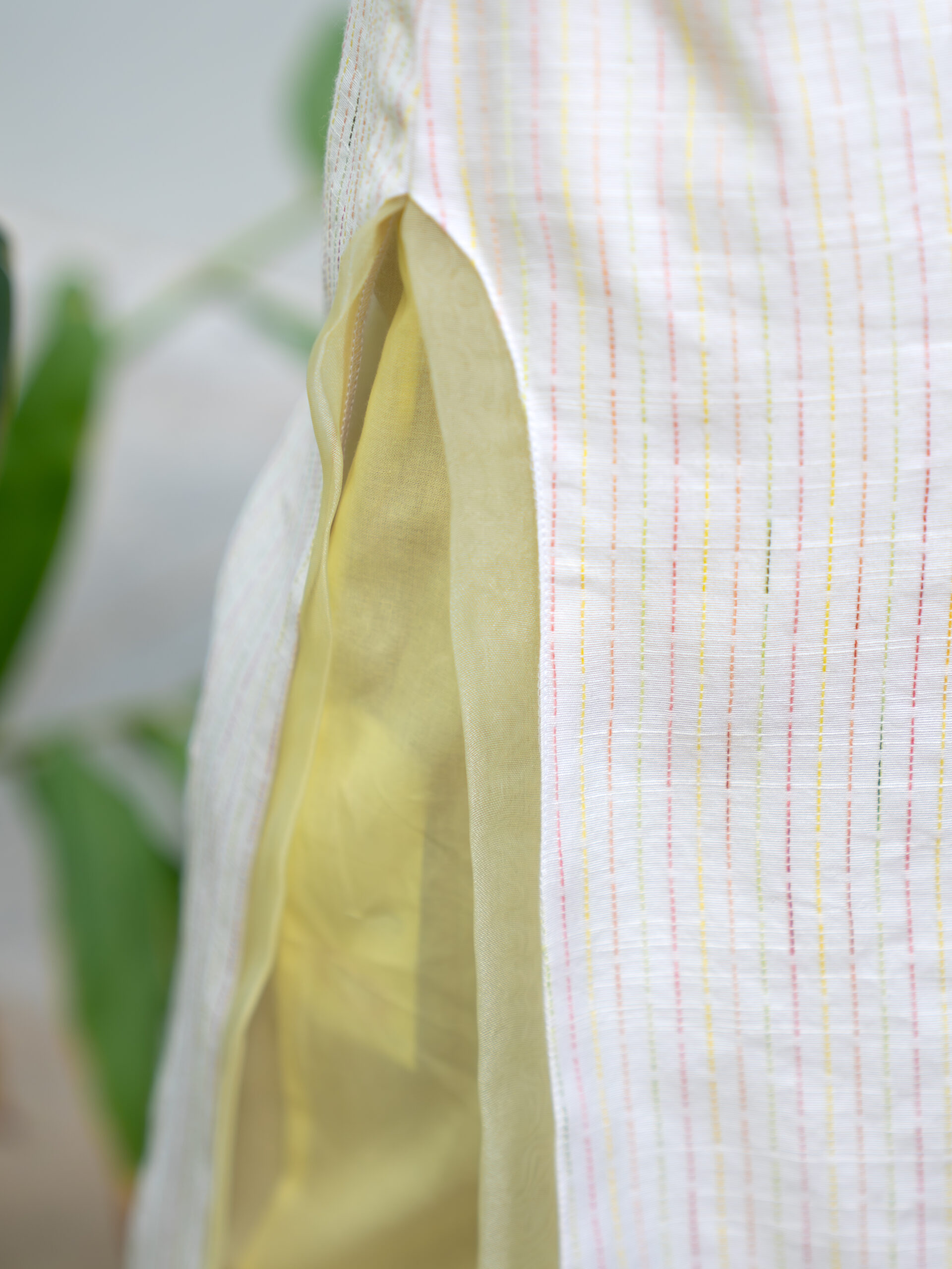 Introducing our intricately crafted kurta set—made in textured slubby cotton, enriched with delicate, colourful Kantha stitches that lend it a handcrafted, artisanal character. The kurta features a soft, breathable silhouette designed for all-day comfort, while celebrating traditional detailing with a modern sensibility.A standout element is the scalloped sheer organza panel at the neckline—gracefully extending to both the front and back—adding a light, ethereal touch.This detailing is echoed along the hemline and side slits, creating a cohesive, feminine finish.Designed with versatility in mind, the kurta comes with attachable sleeves, allowing you to style it your way. It is paired with cotton pants featuring a scalloped hem and an elasticated waistband for ease and comfort.