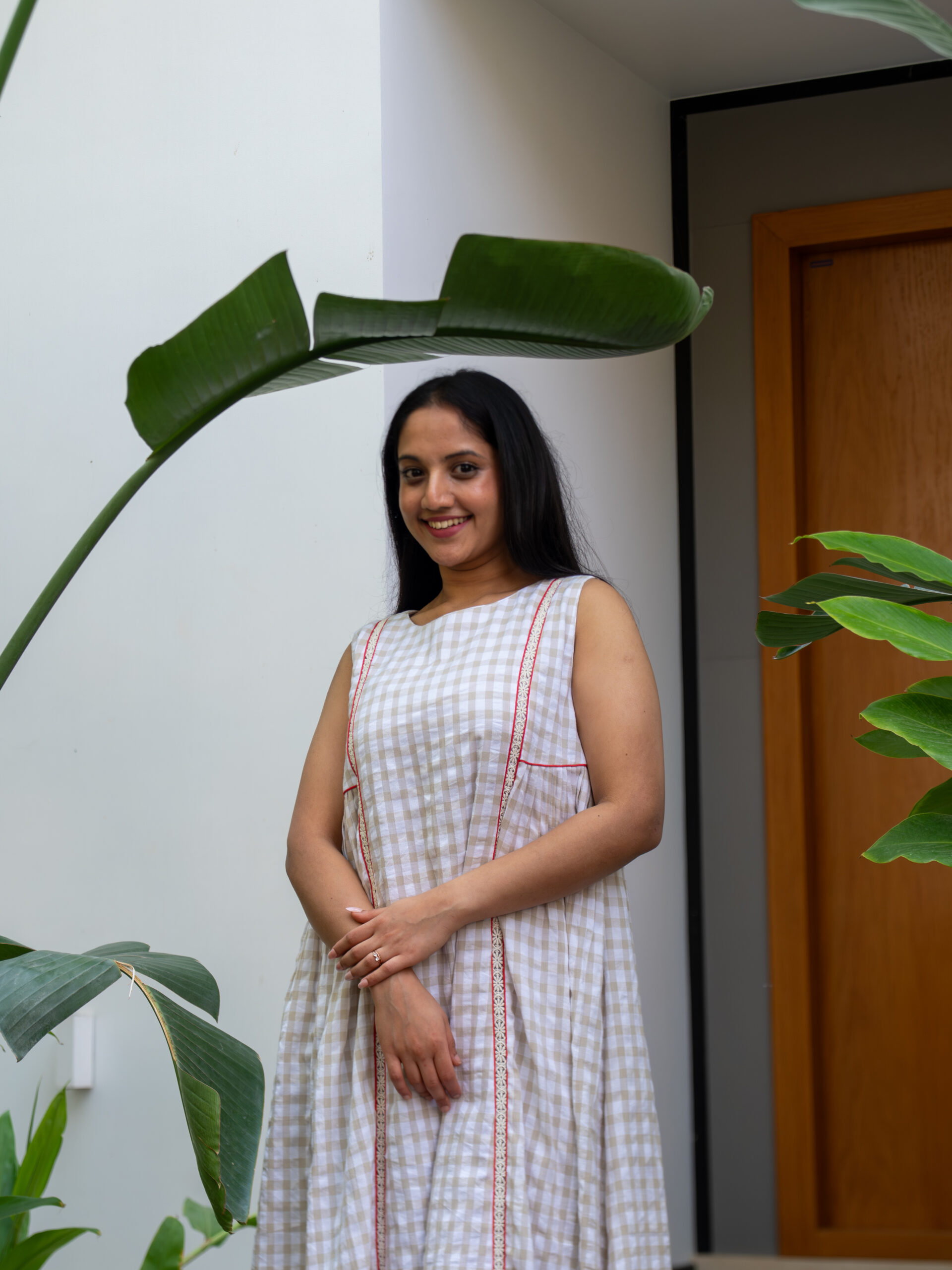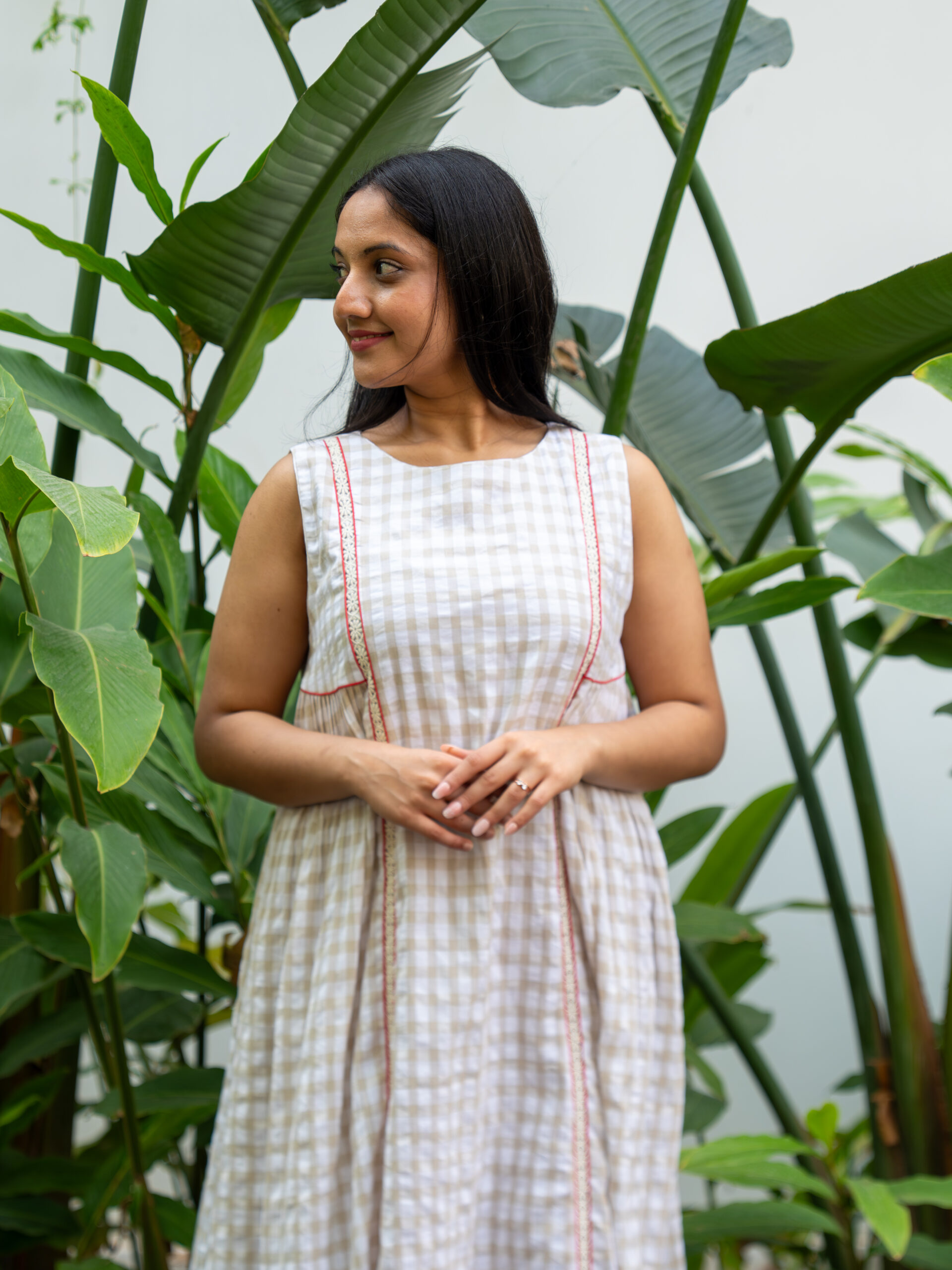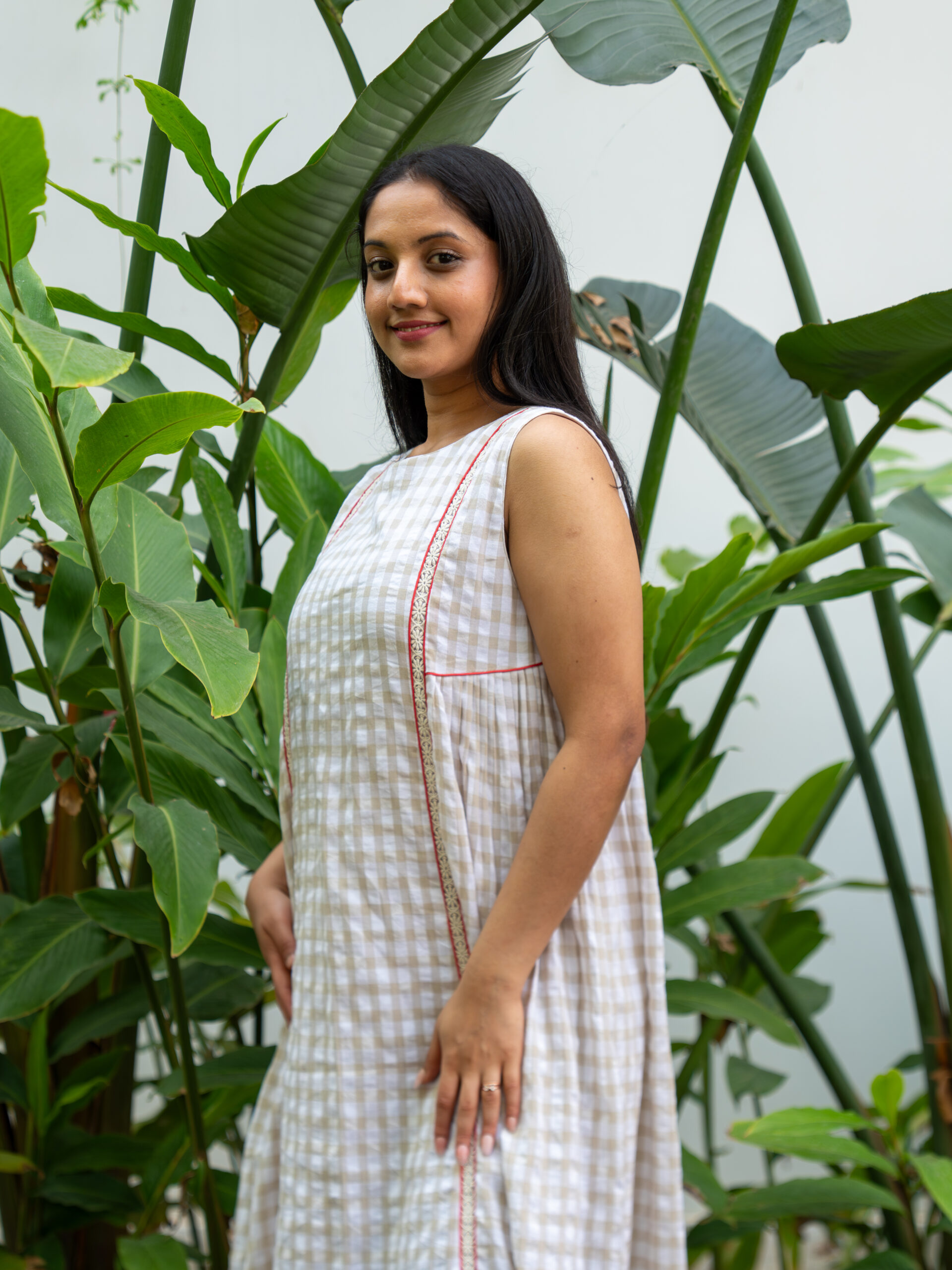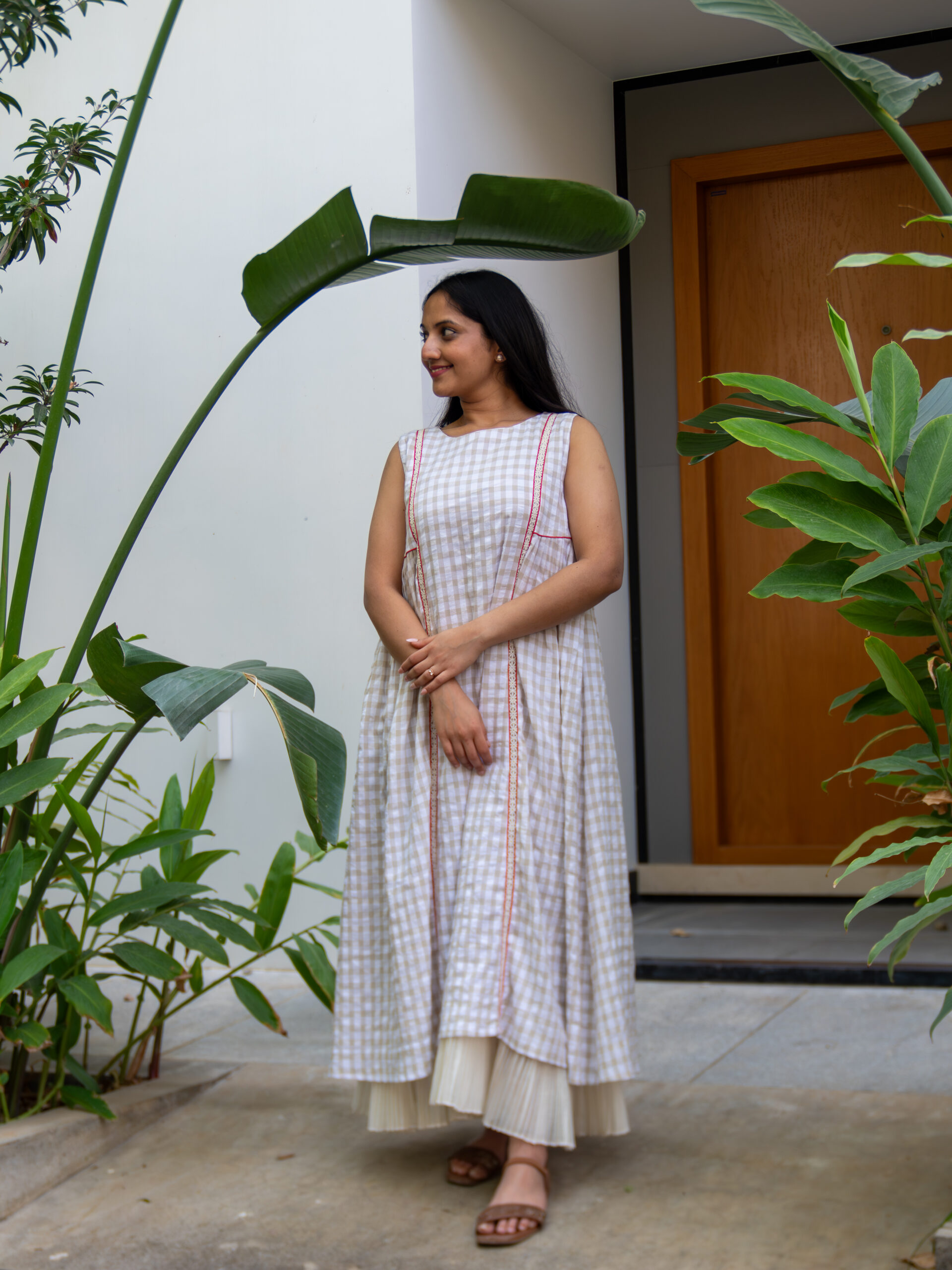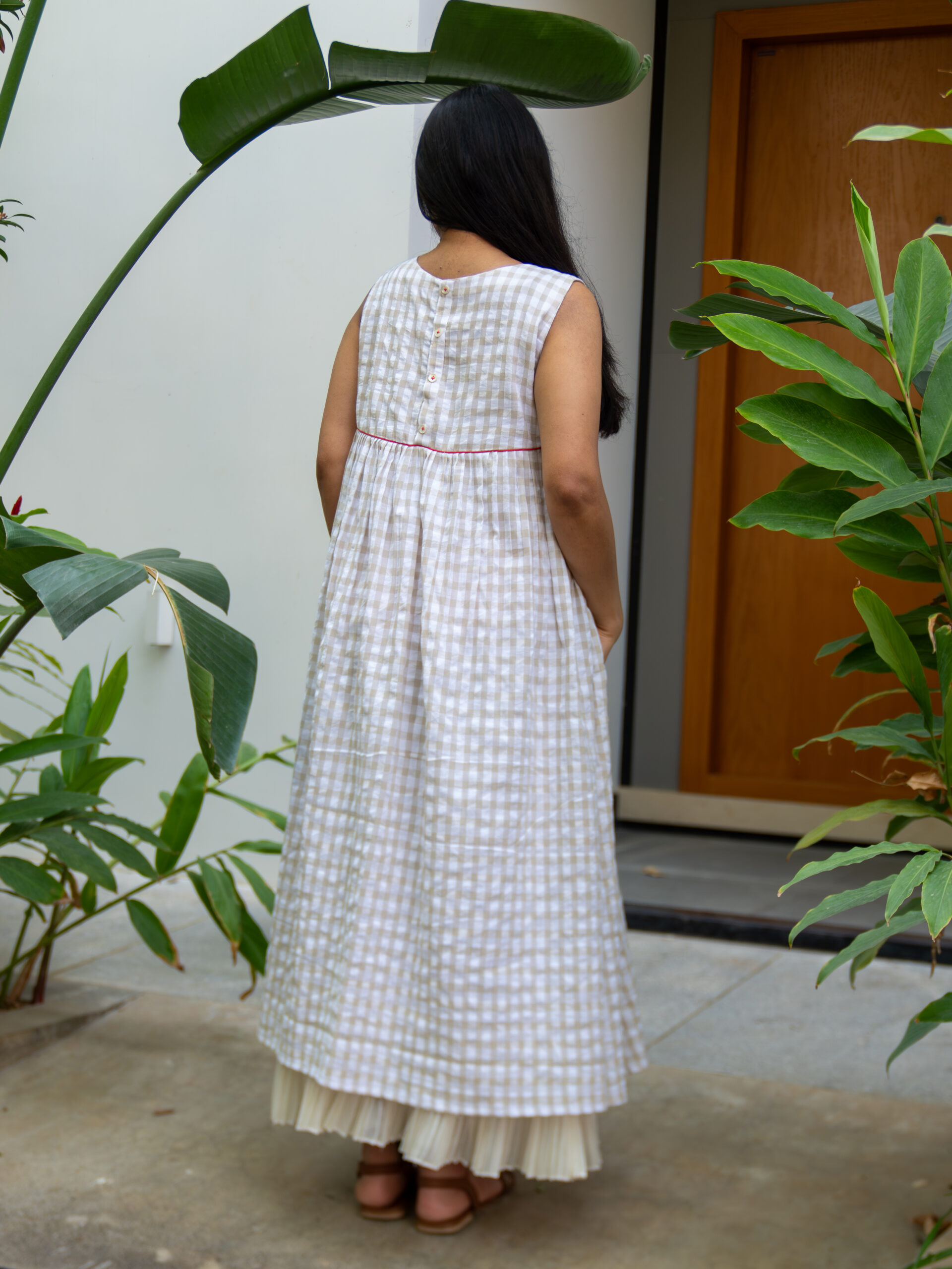 Introducing our charming beige gingham A-line dress—crafted in breathable cotton and designed to move with effortless grace. The softly gathered silhouette creates a gentle flow, while delicate Chanderi pleats peek through at the hem as an underlayer, adding depth and a dreamy sense of movement with every step.