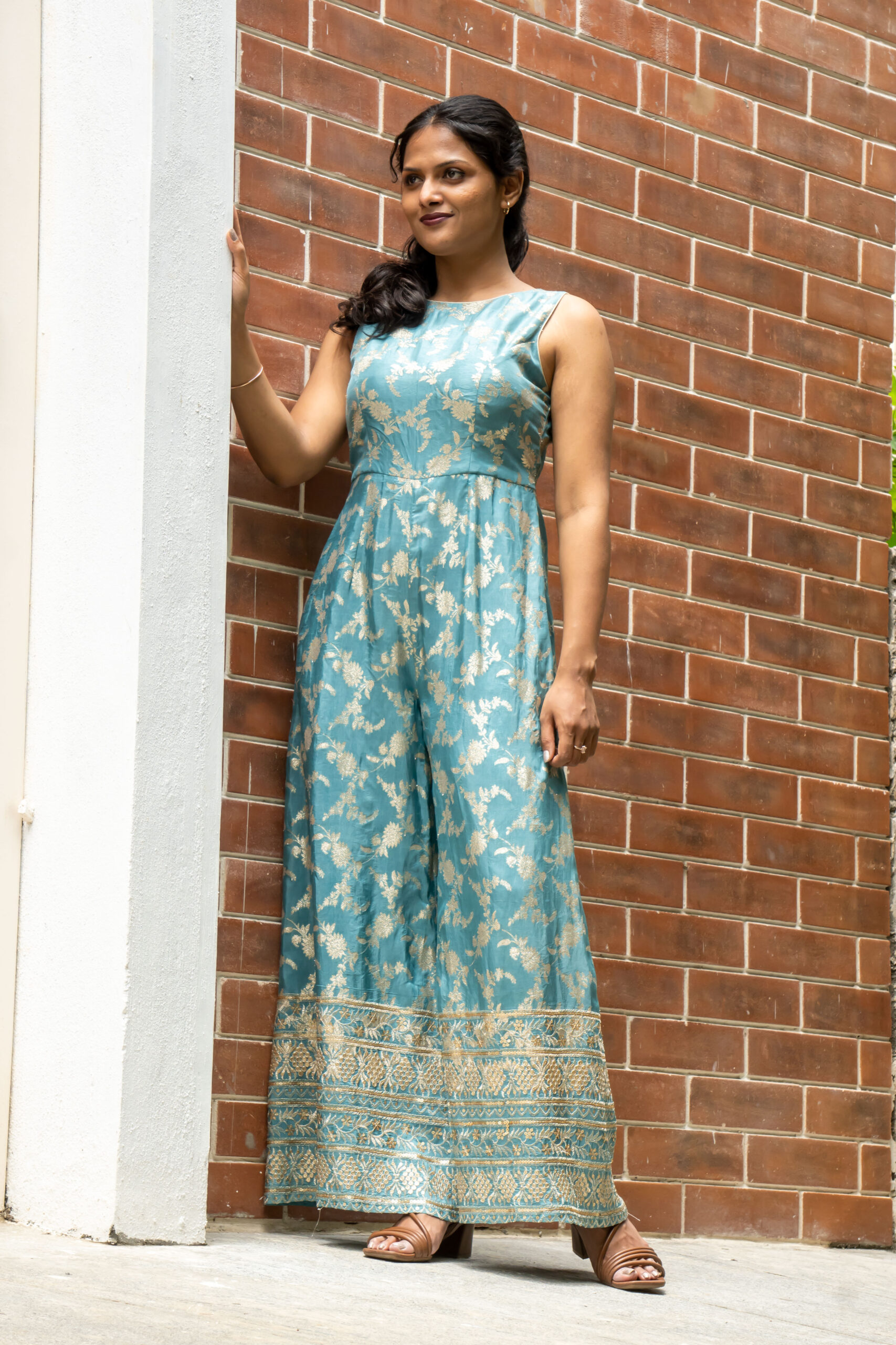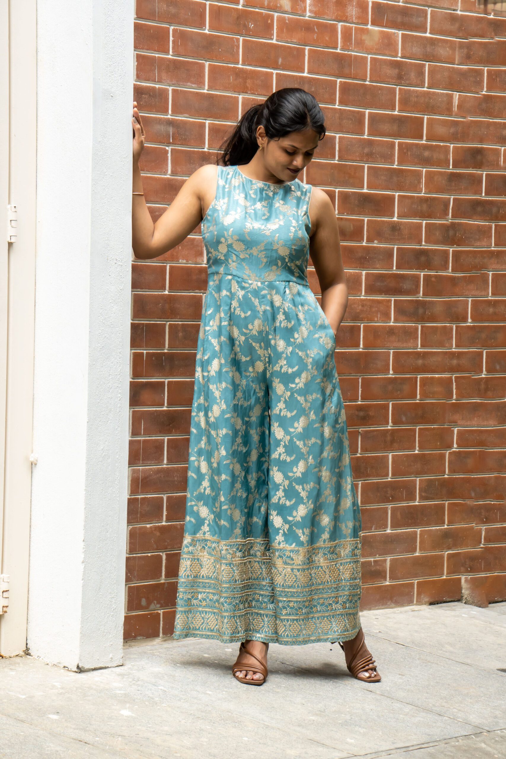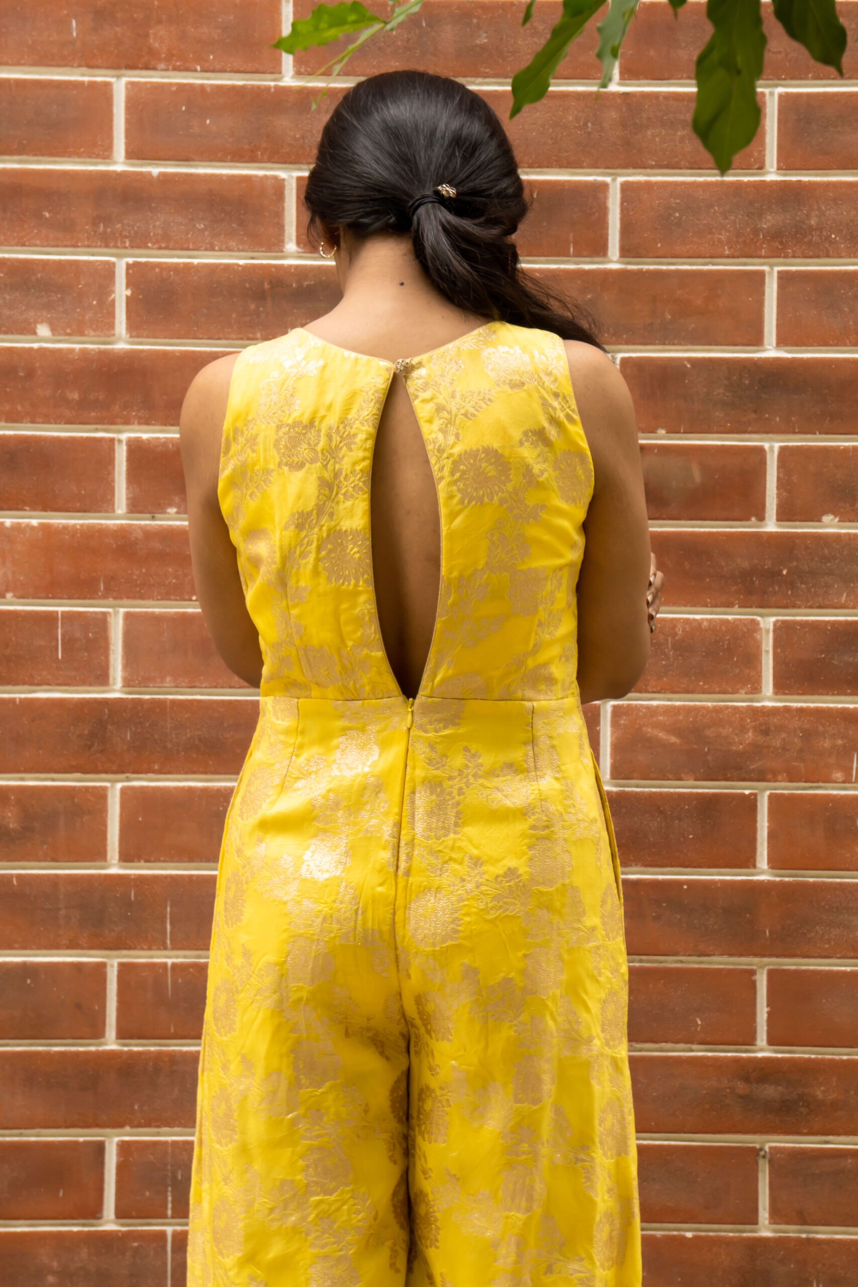 Make a statement in our stunning jumpsuit, crafted from rich Banarasi fabric. Featuring functional pockets and dramatic back keyhole slit with concealed zipper, this jumpsuit is perfect for special occasions or formal events. A perfect blend of elegance and comfort.