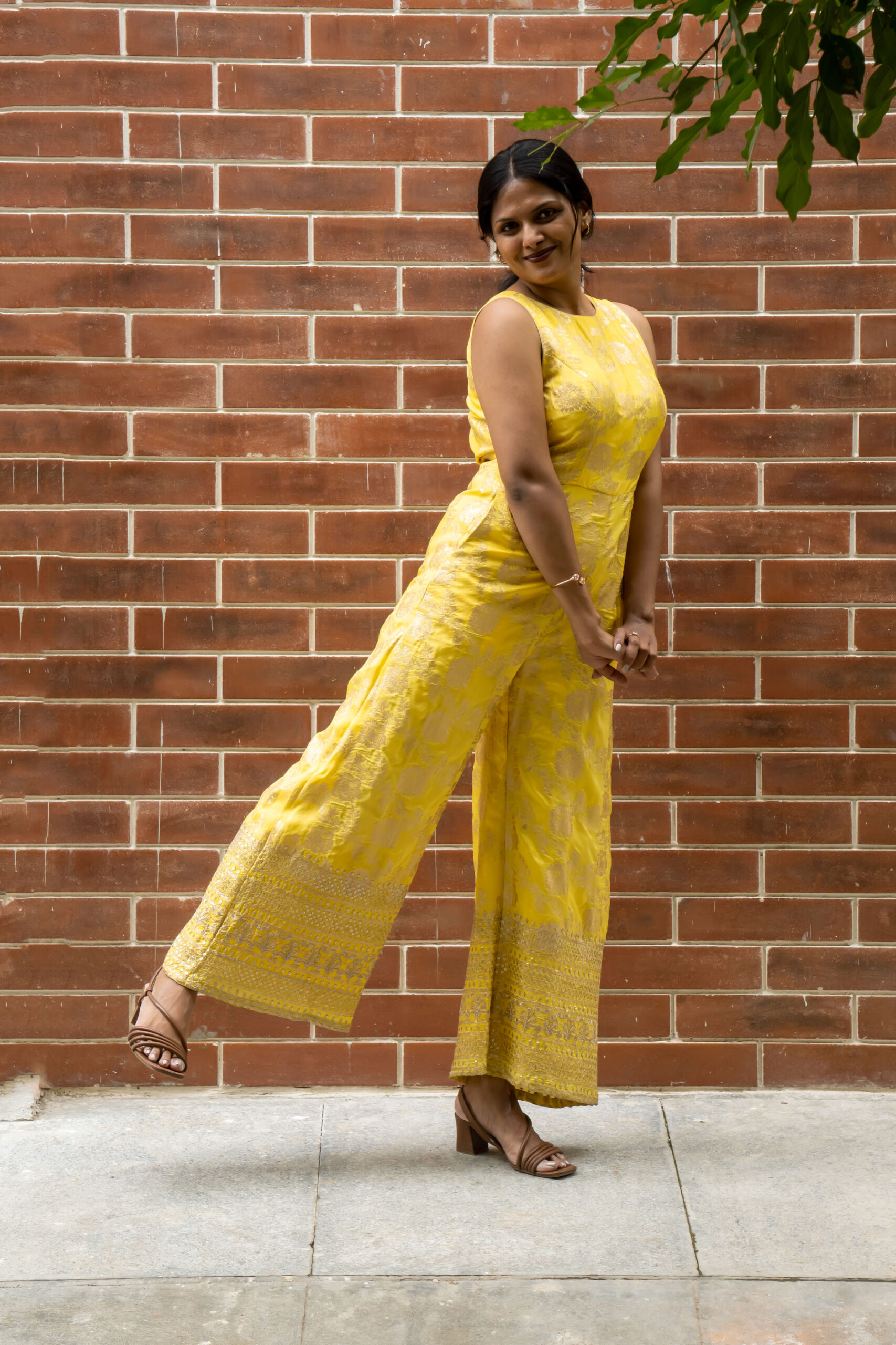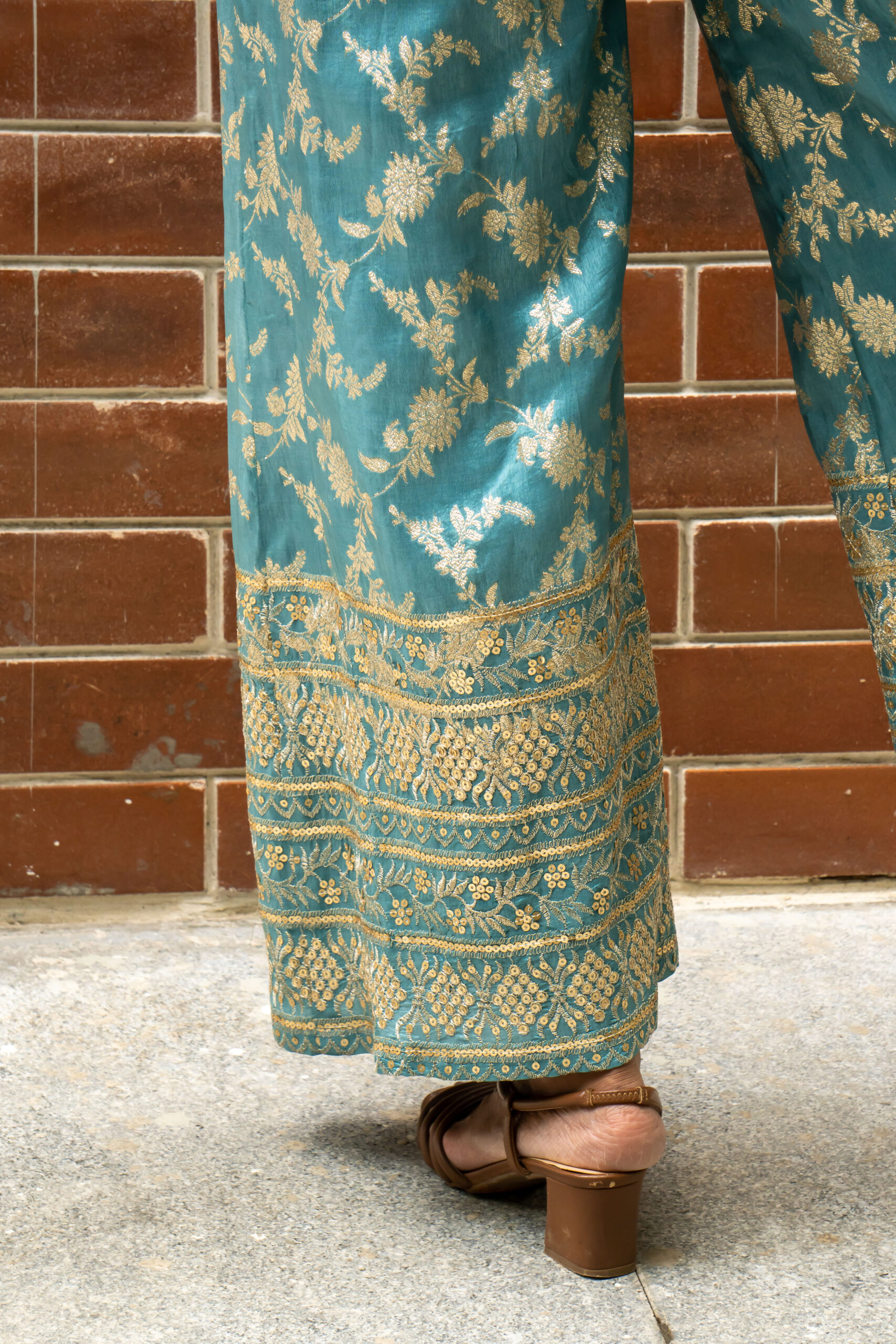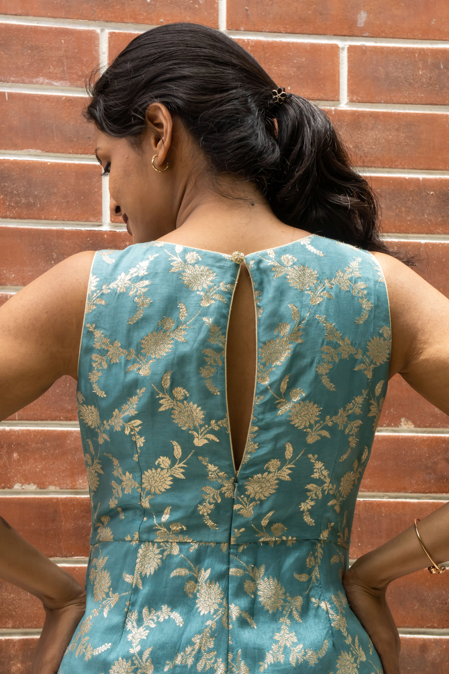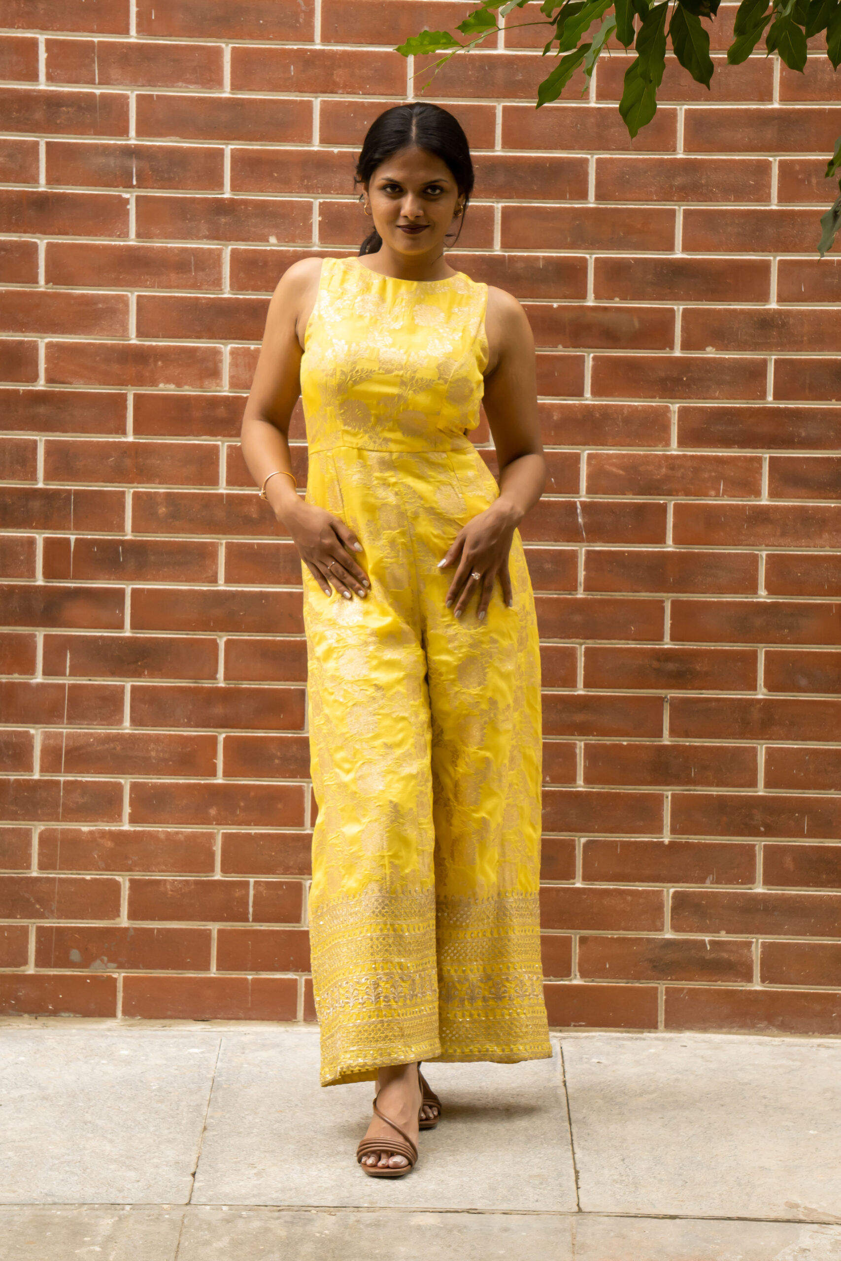 Make a statement in our stunning jumpsuit, crafted from rich Banarasi fabric. Featuring functional pockets and dramatic back keyhole slit with concealed zipper, this jumpsuit is perfect for special occasions or formal events. A perfect blend of elegance and comfort.