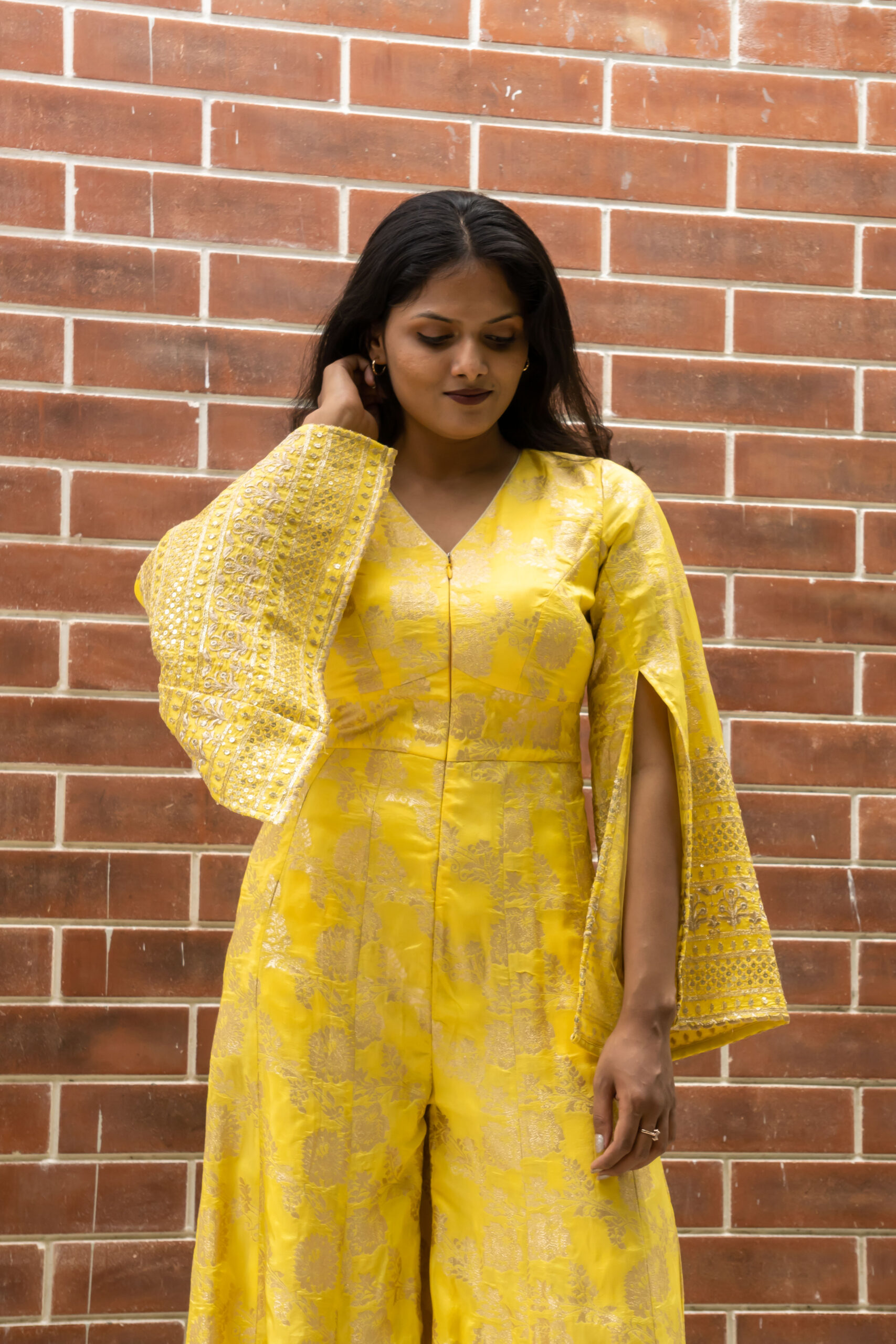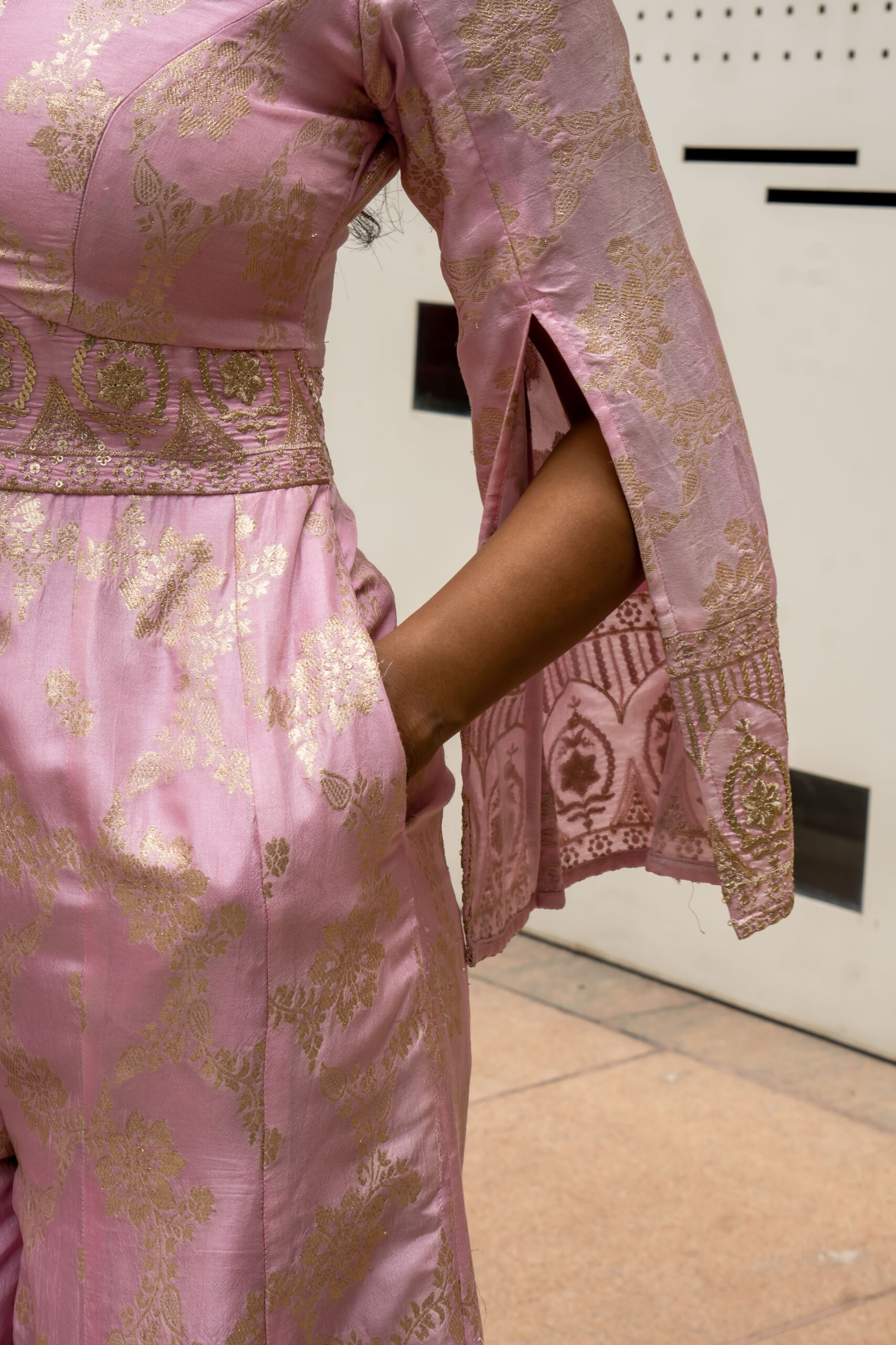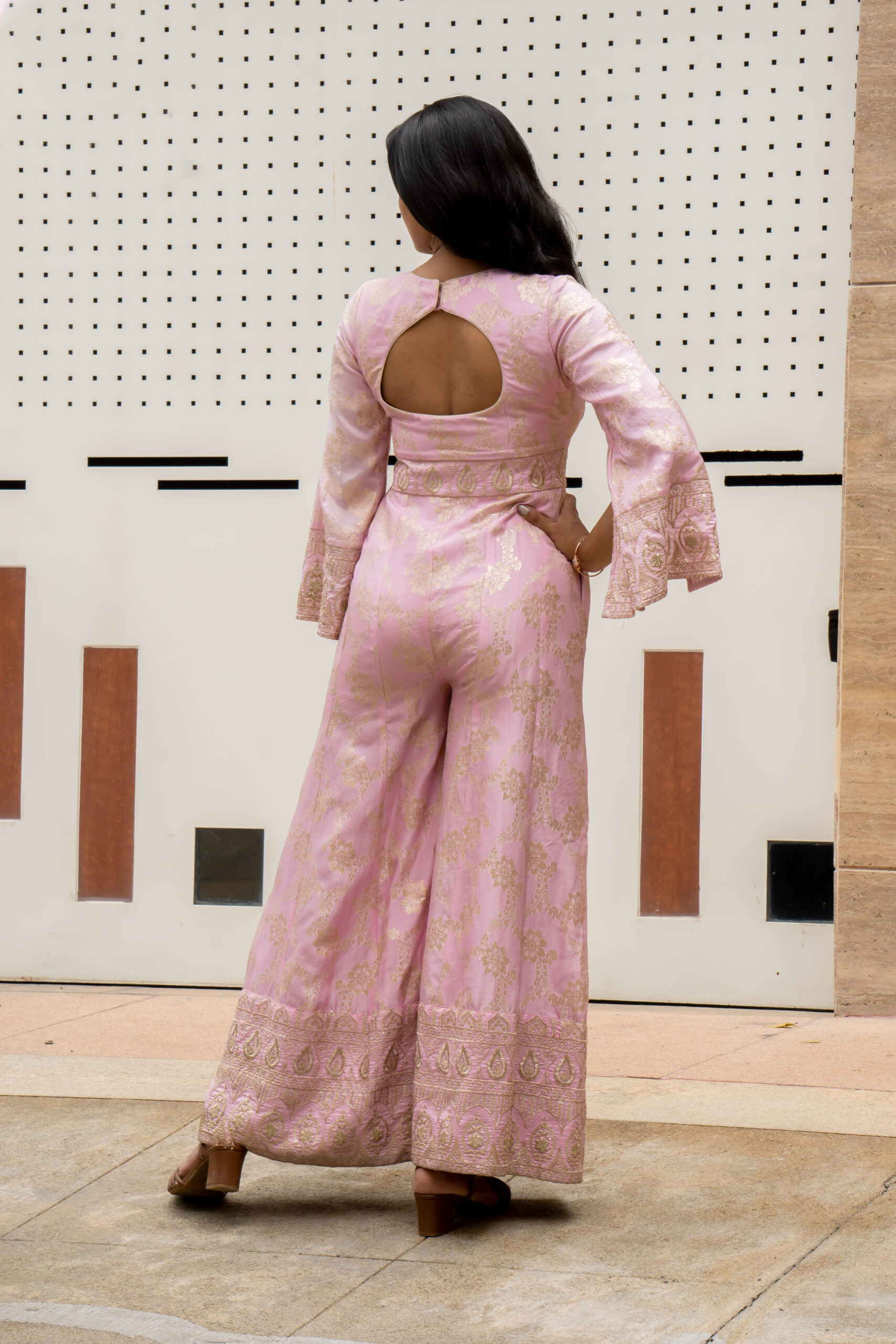 Make a statement in our stunning jumpsuit, crafted from rich Banarasi fabric. Featuring functional pockets, a front-open design for easy wear, and dramatic flared sleeves with a chic slit, this jumpsuit is perfect for special occasions or formal events. A perfect blend of elegance and comfort.