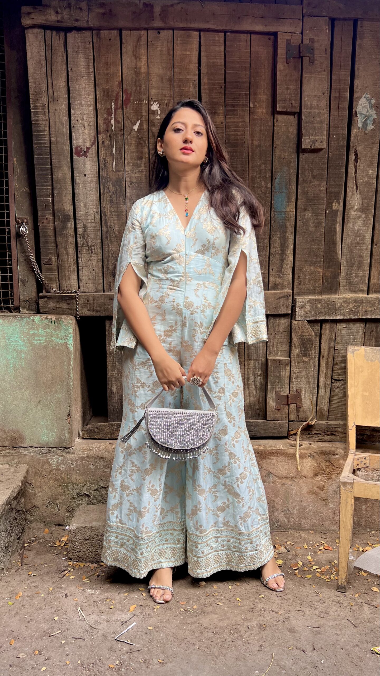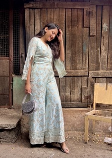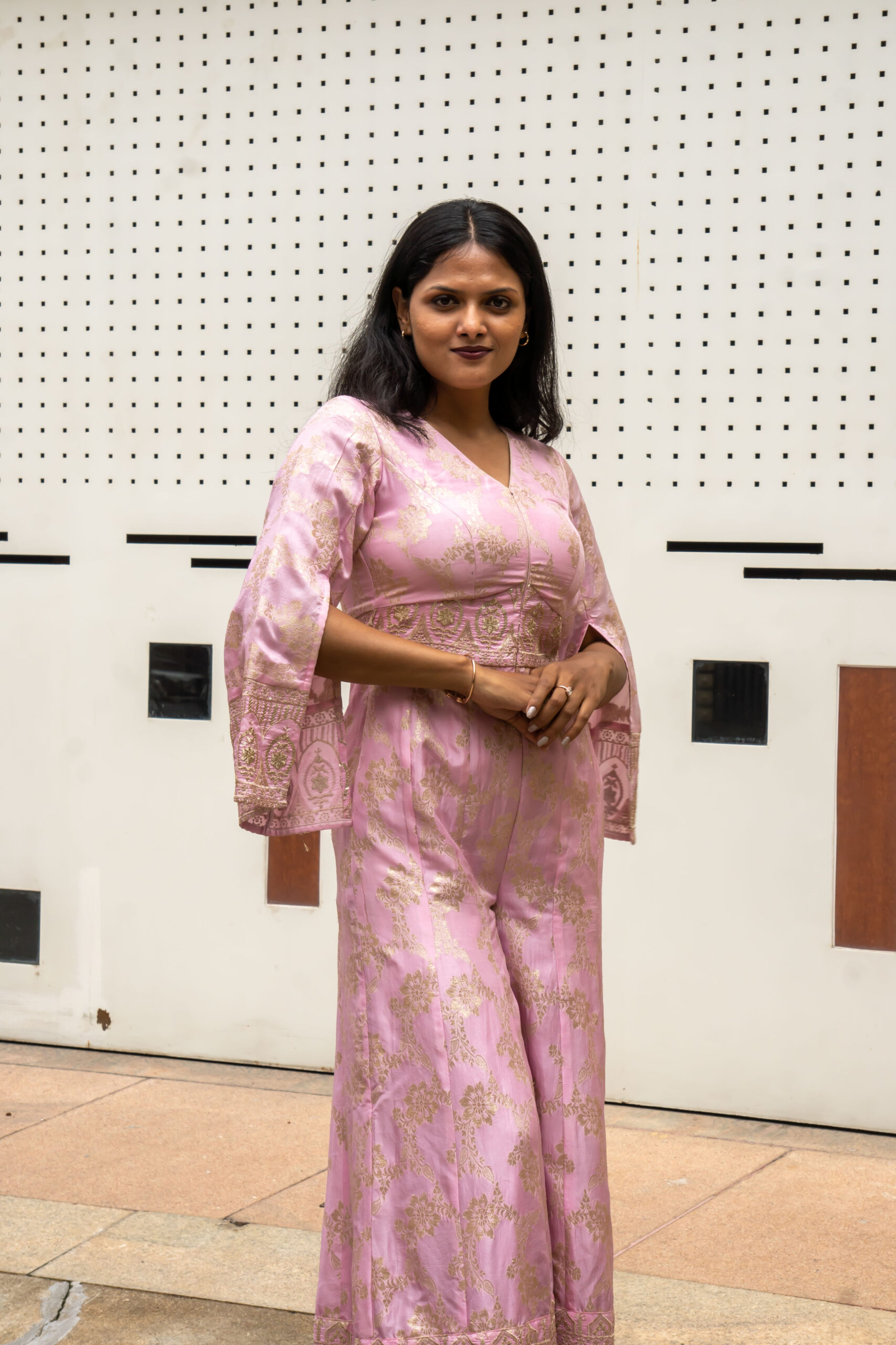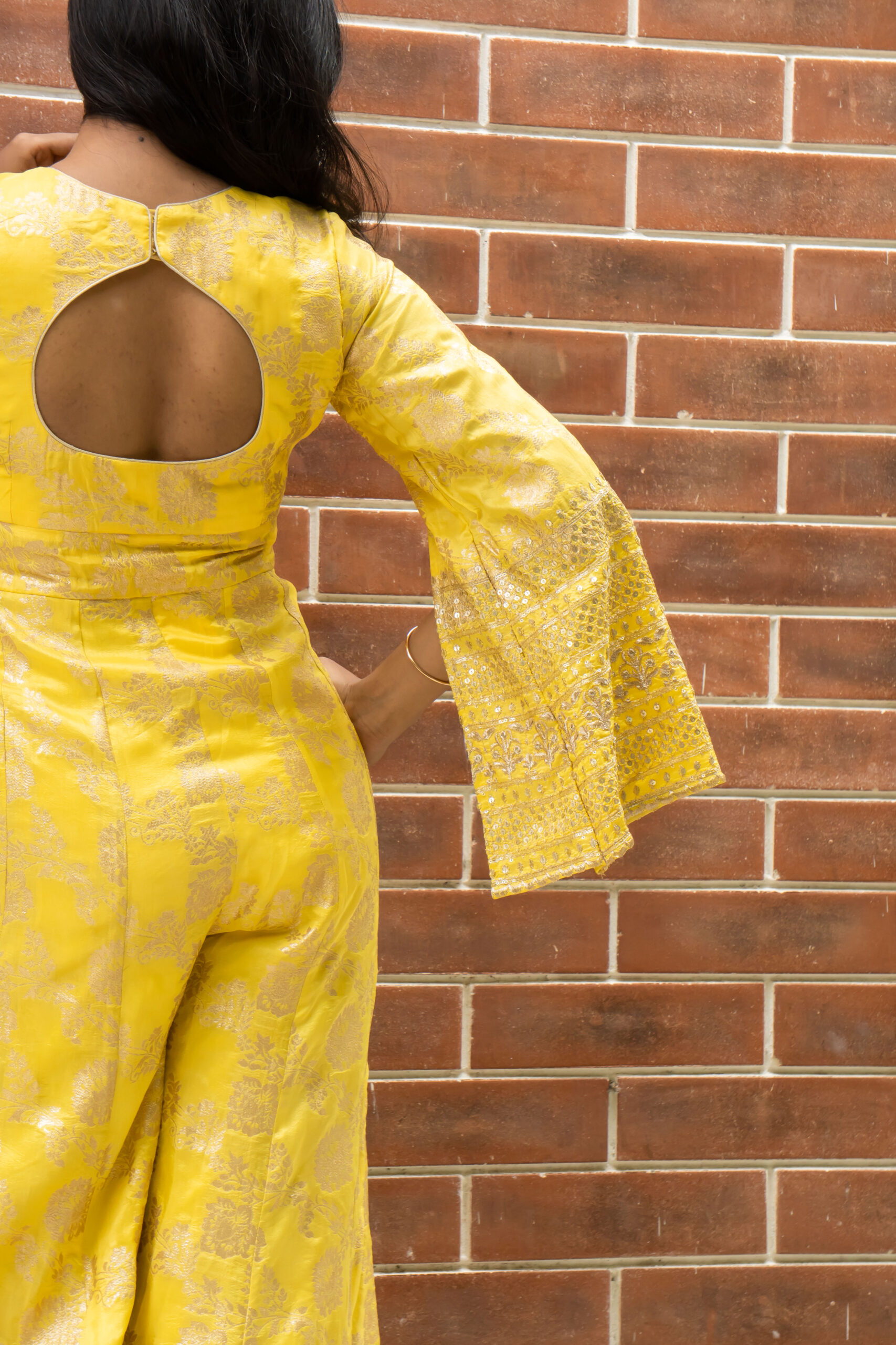 Make a statement in our stunning jumpsuit, crafted from rich Banarasi fabric. Featuring functional pockets, a front-open design for easy wear, and dramatic flared sleeves with a chic slit, this jumpsuit is perfect for special occasions or formal events. A perfect blend of elegance and comfort.