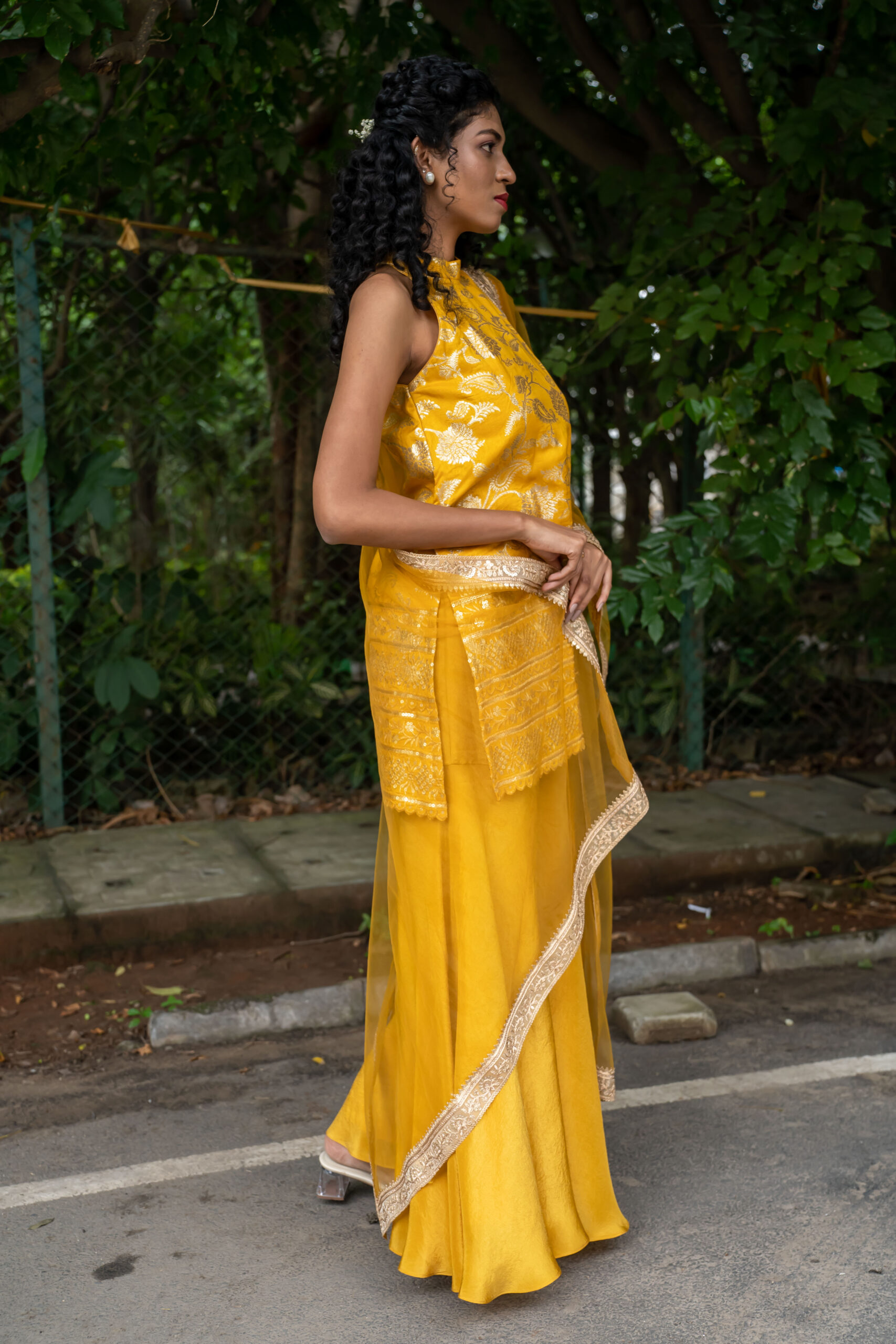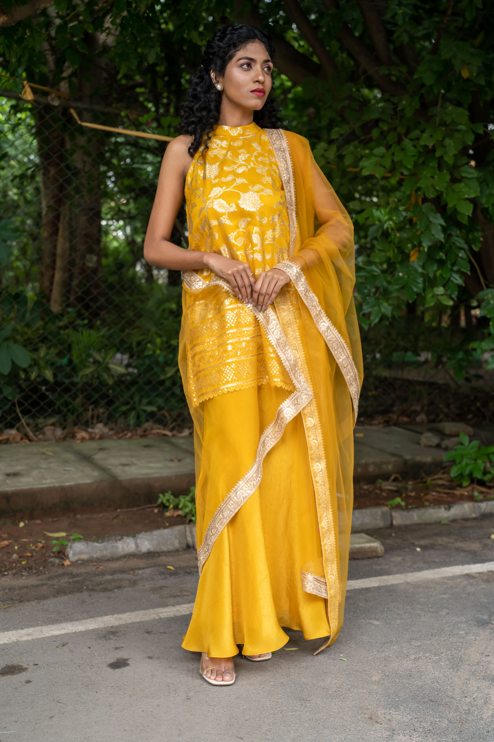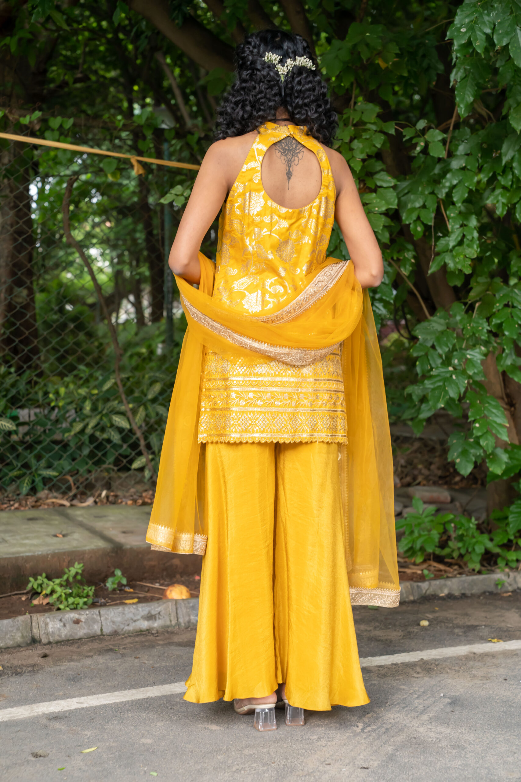 Shine bright in our stunning 3-piece co-ord set! The sleeveless halter neck kurta in heavily embroidered georgette fabric is paired with a shimmer tissue sharara in a beautiful circular cut. The net chunni with heavy lace embellishment completes the look, perfect for making a grand statement at any special occasion.