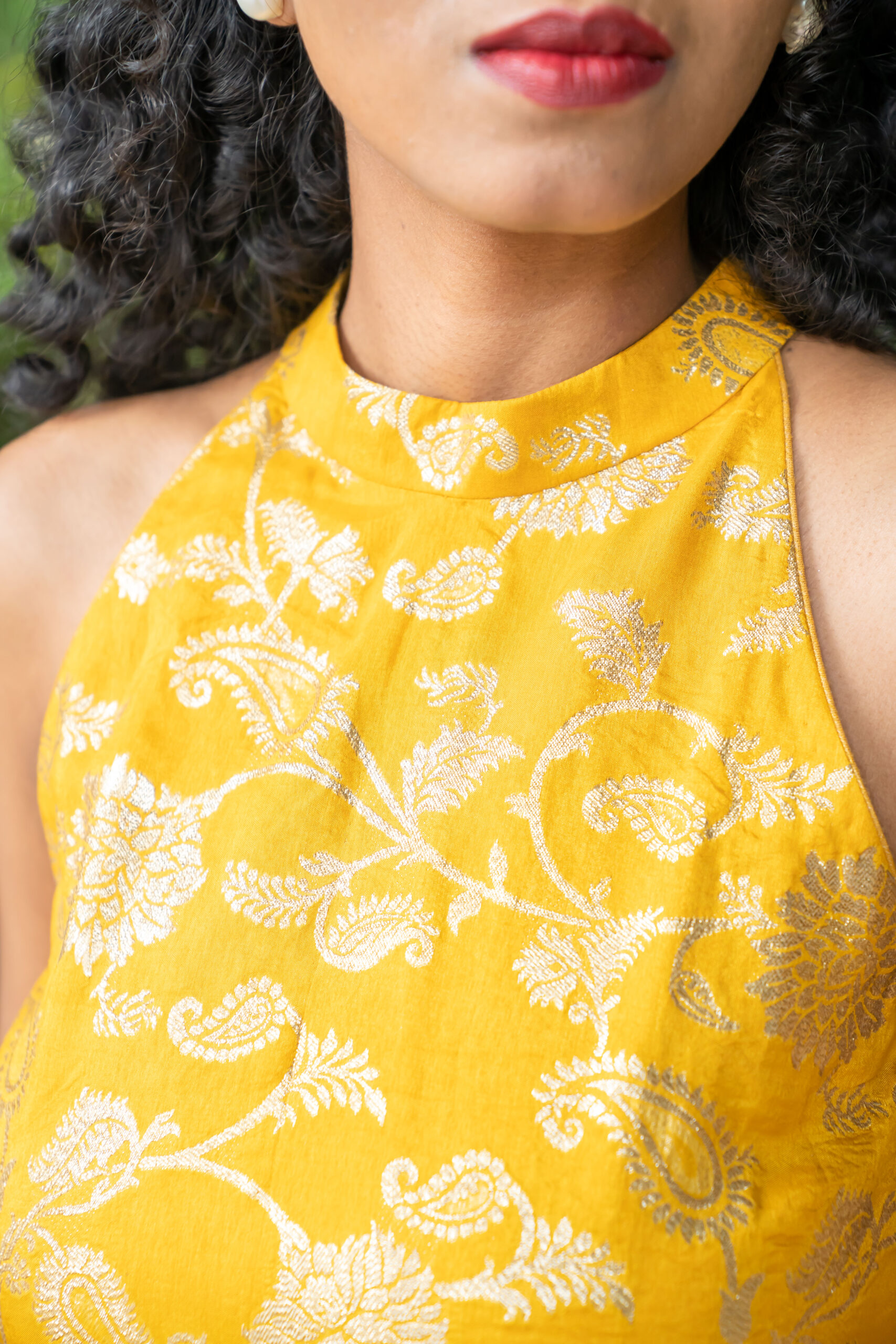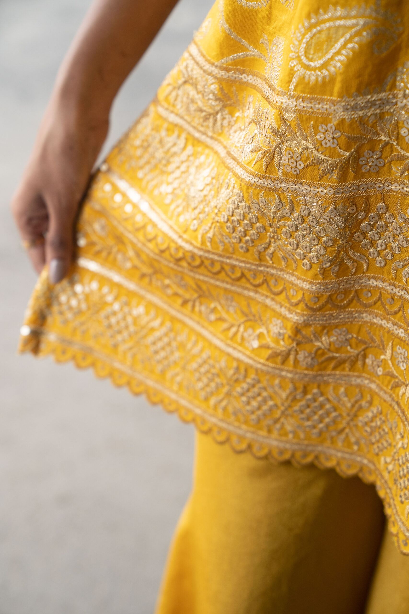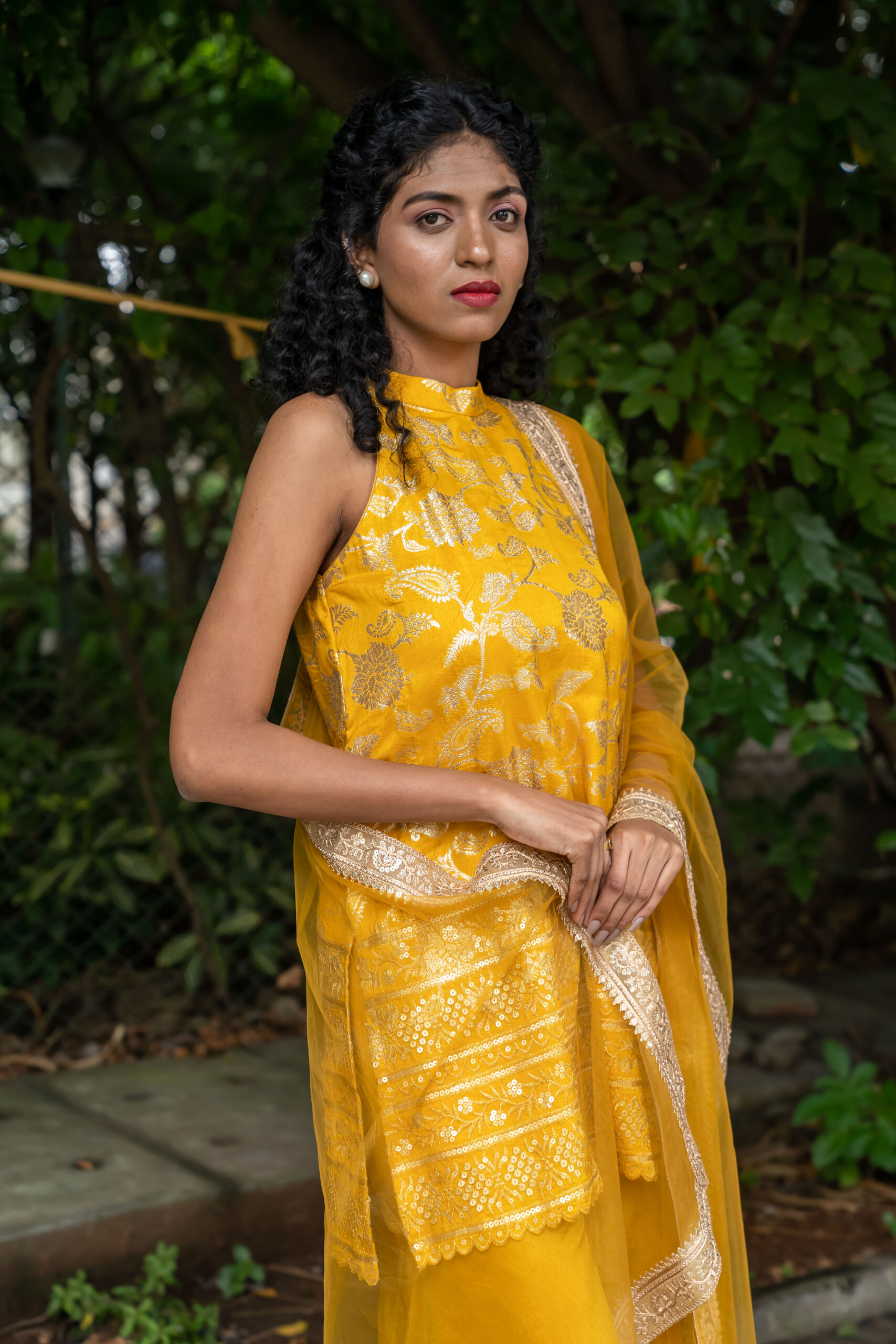 Shine bright in our stunning 3-piece co-ord set! The sleeveless halter neck kurta in heavily embroidered georgette fabric is paired with a shimmer tissue sharara in a beautiful circular cut. The net chunni with heavy lace embellishment completes the look, perfect for making a grand statement at any special occasion.