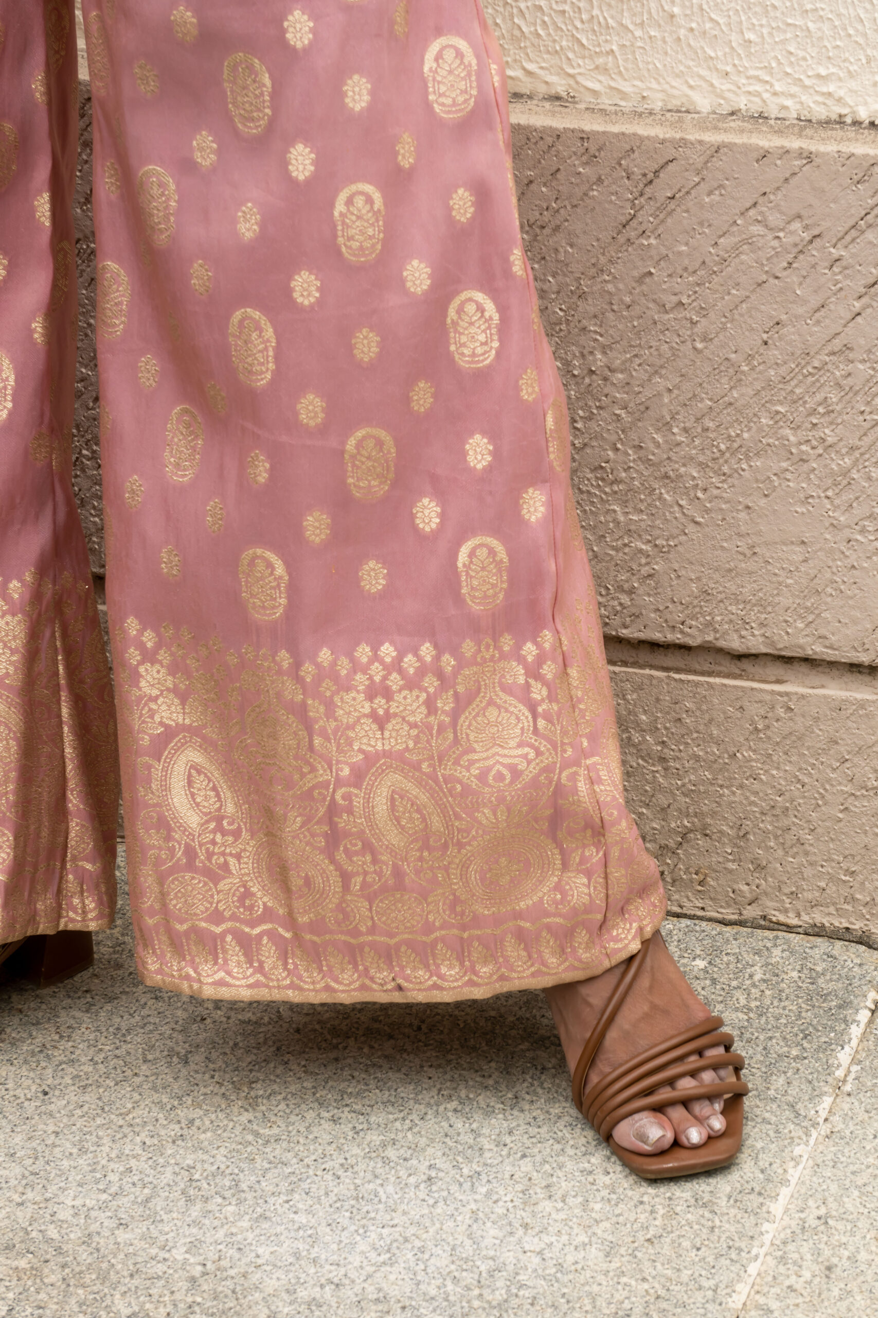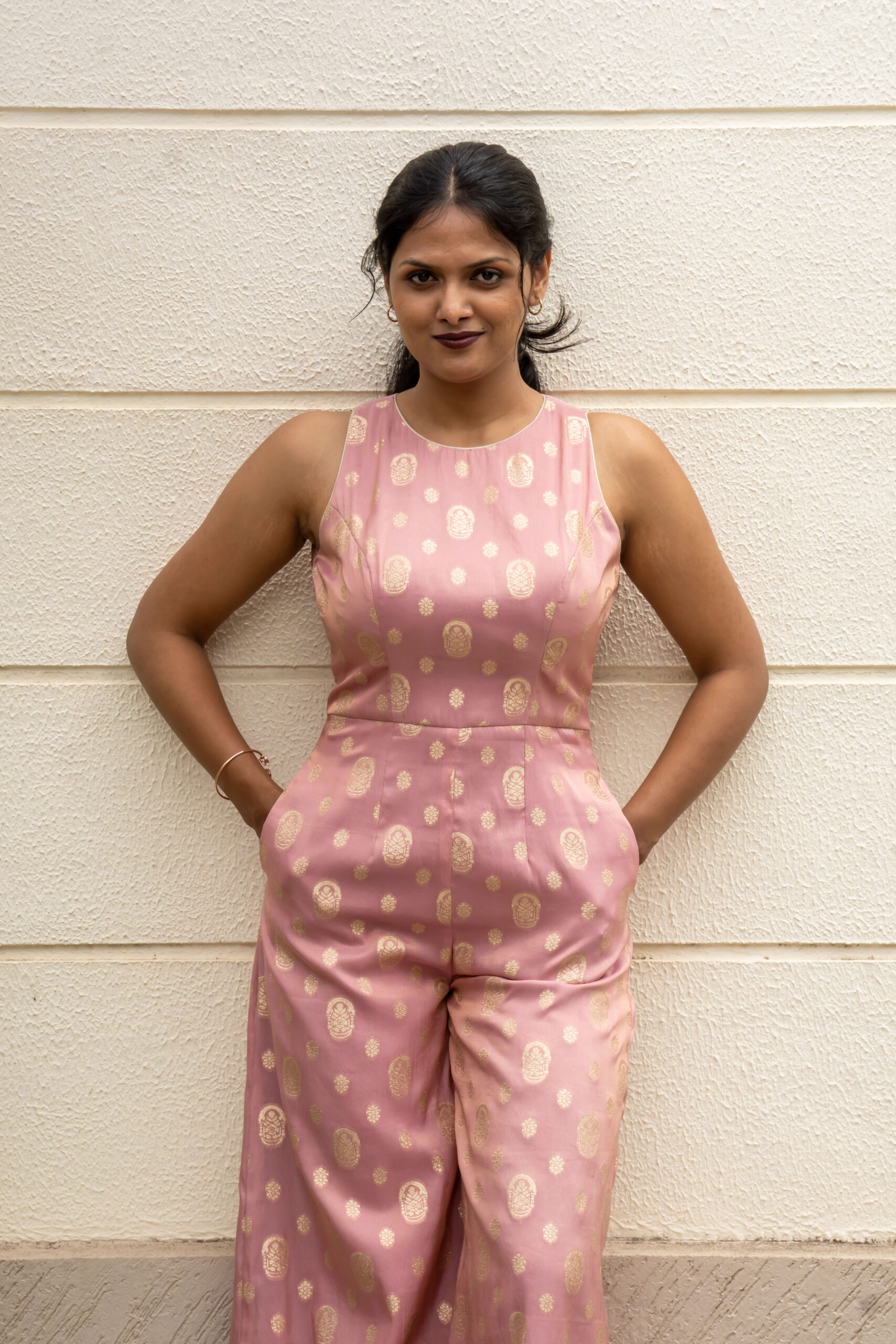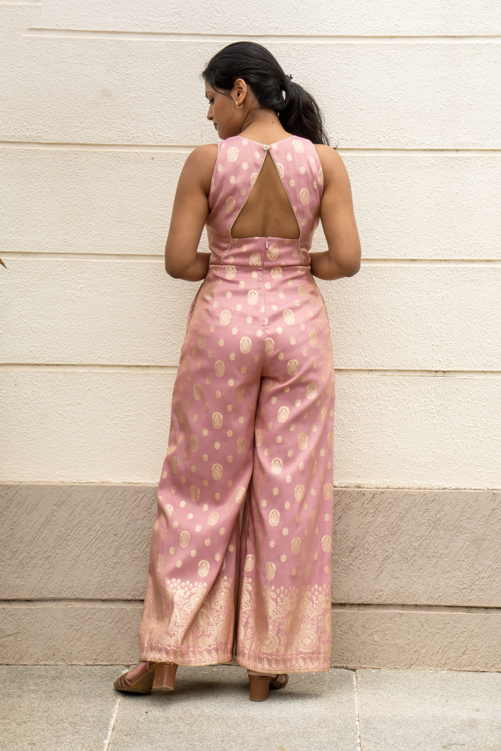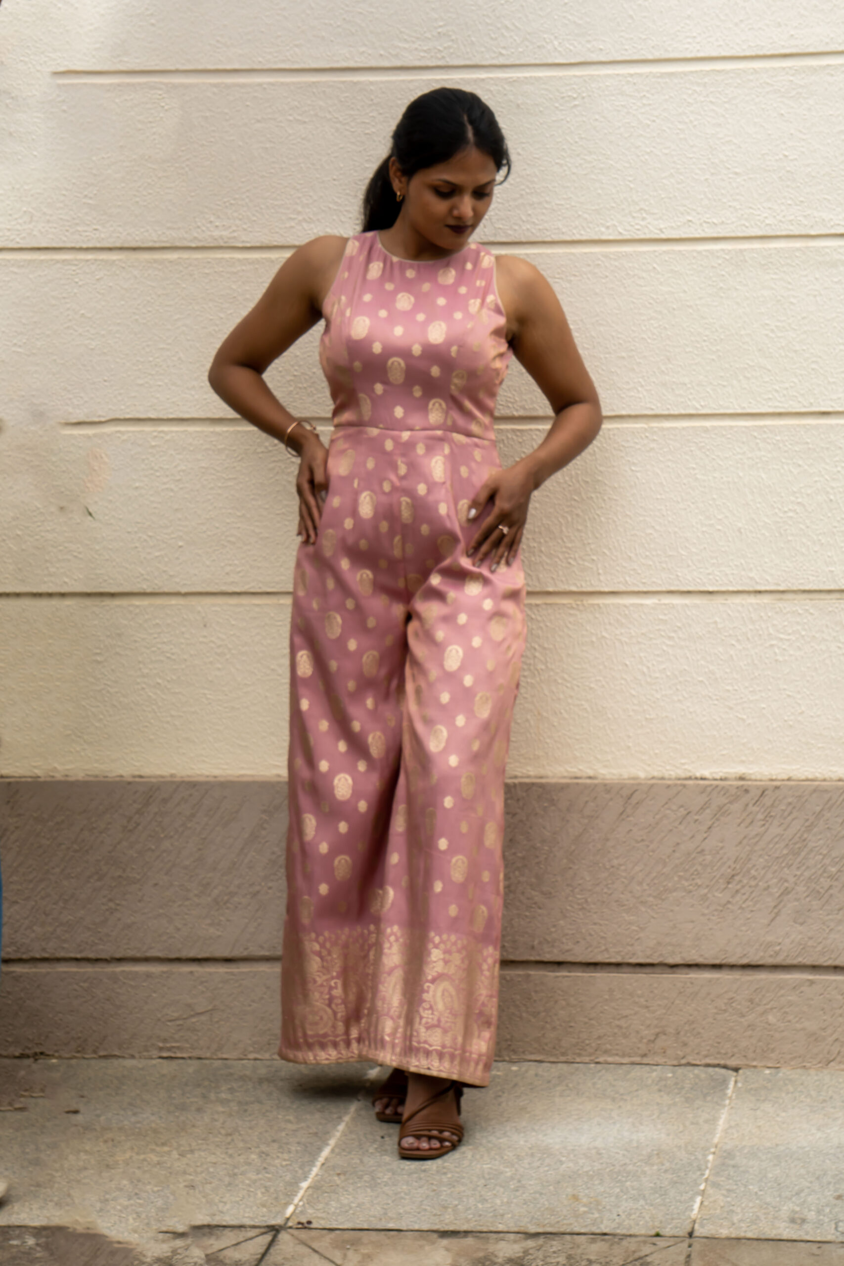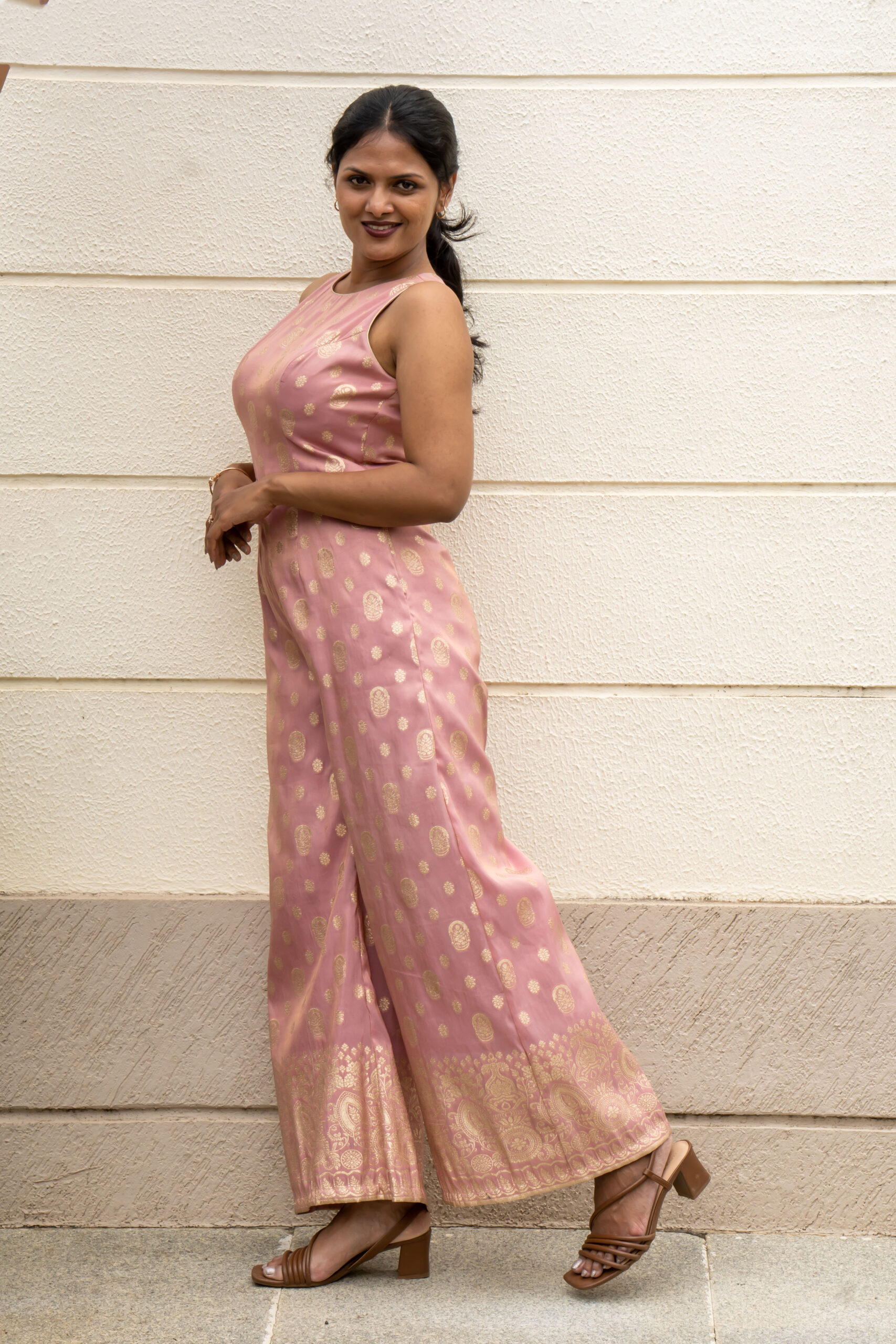 Make a statement in our stunning jumpsuit, crafted from rich Banarasi fabric. Featuring functional pockets, a comfortable back open zipper with a keyhole. This jumpsuit is perfect for special occasions or formal events. A perfect blend of elegance and comfort.