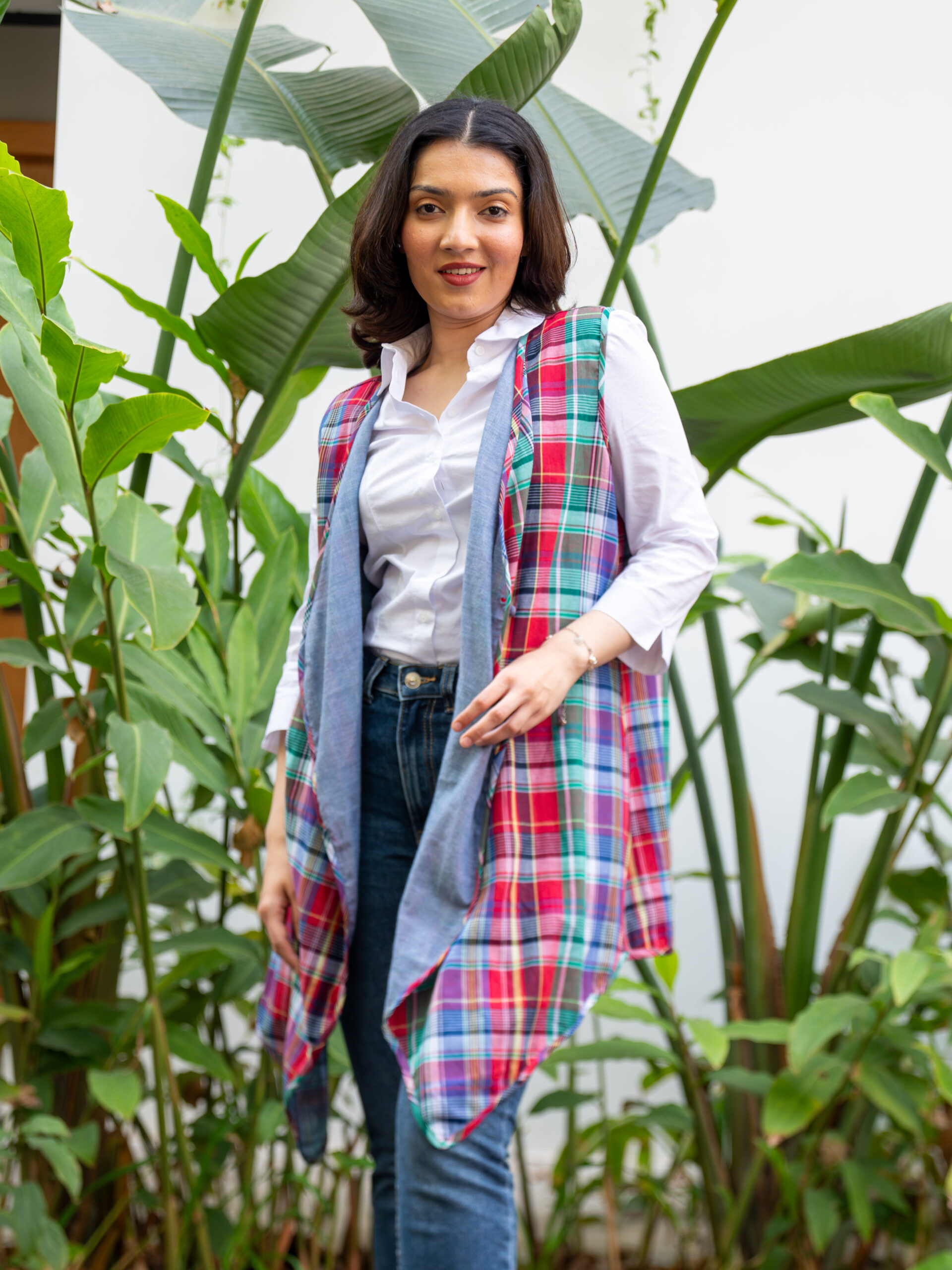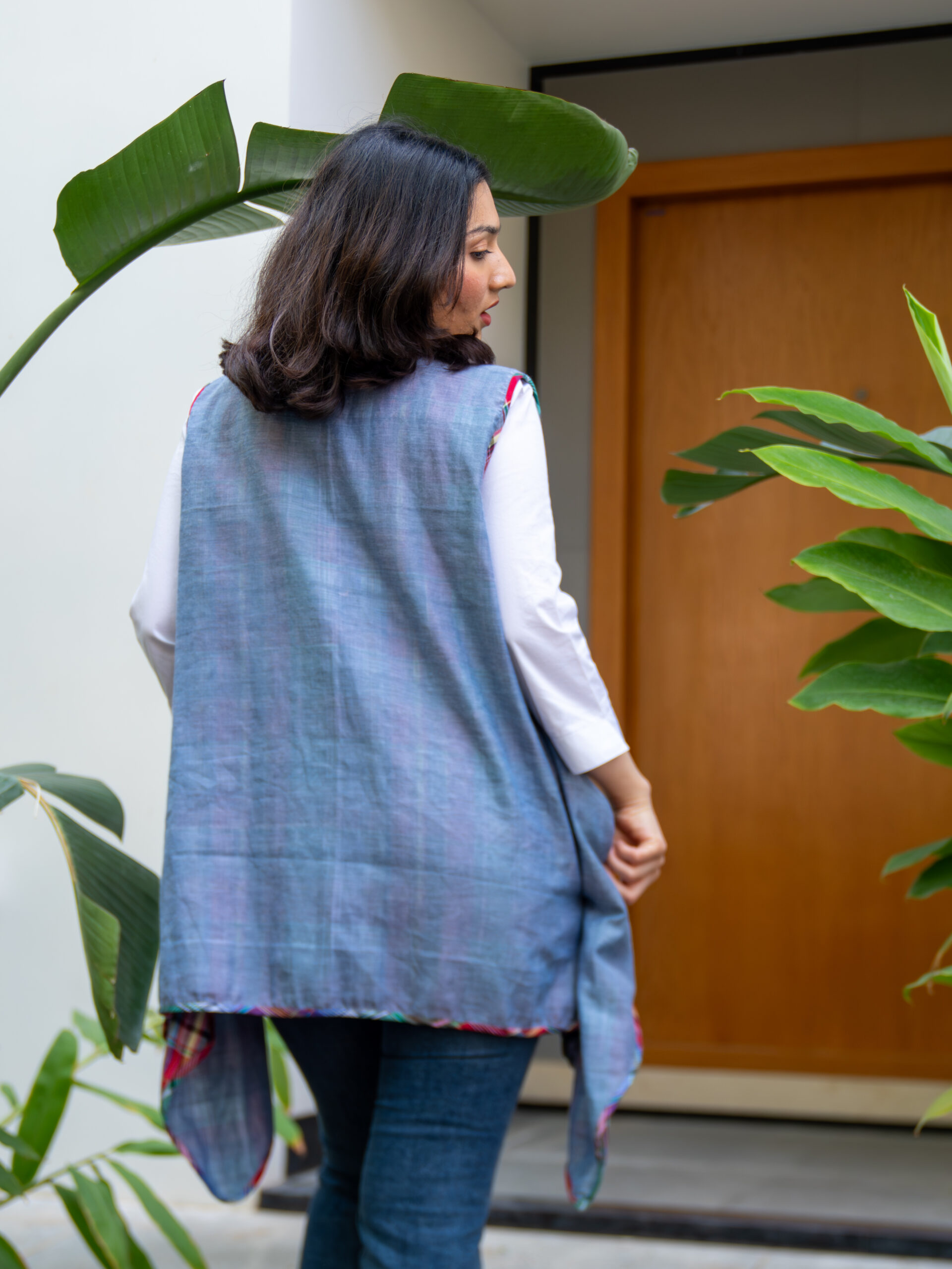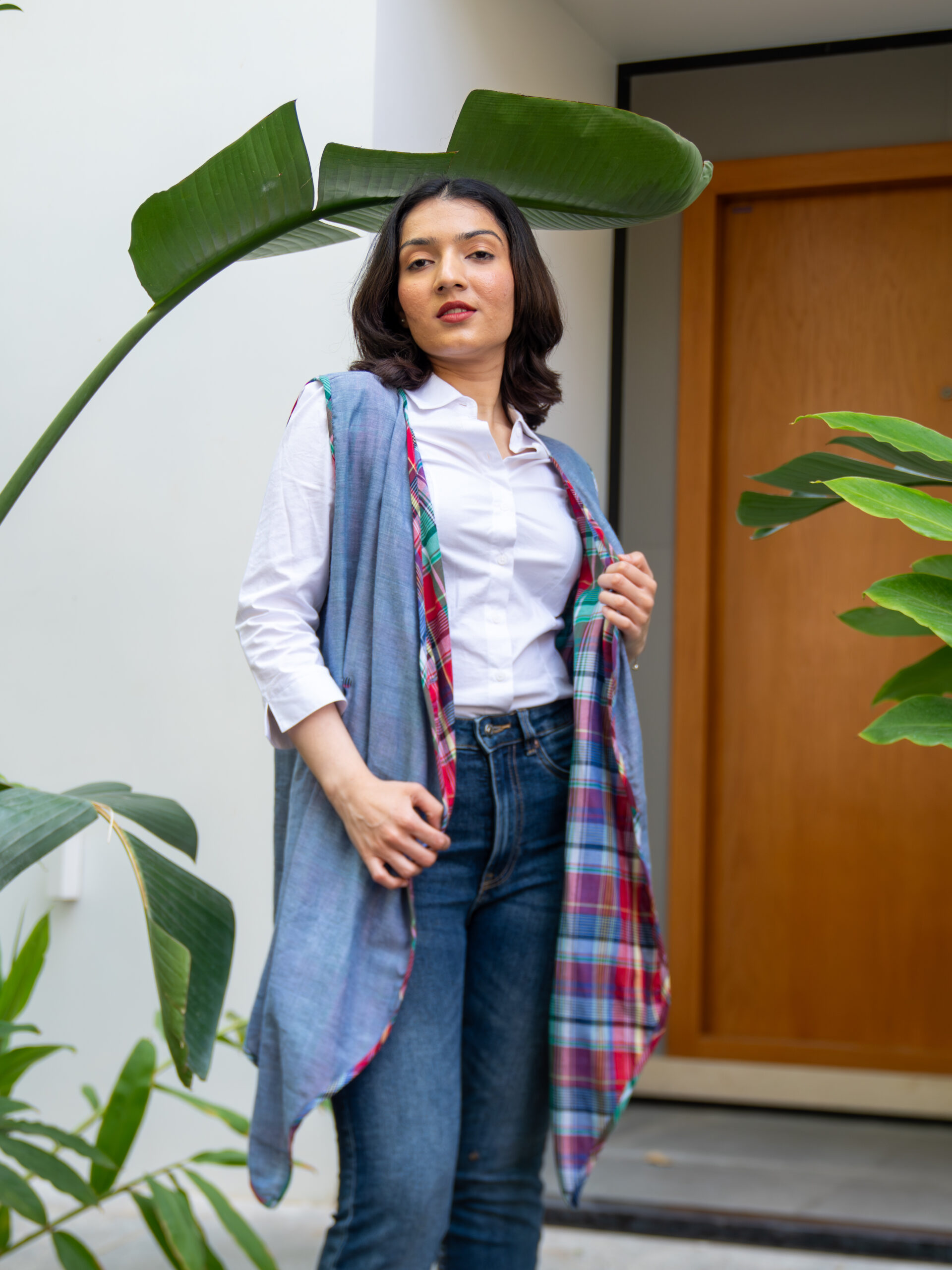 Introducing our versatile reversible throw jacket—an effortless layering piece designed for dynamic styling. Crafted in breathable cotton, it features a sleeveless silhouette with a dual-faced design: classic checks on one side and solid on the other, offering two distinct looks in one.