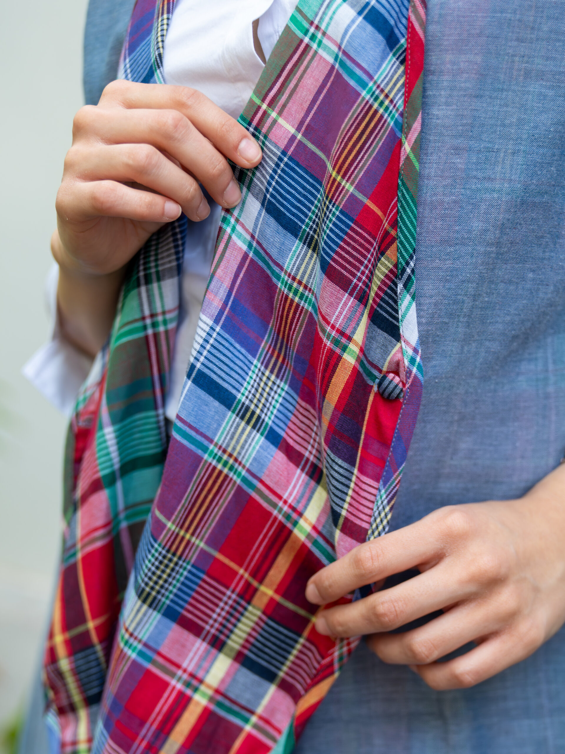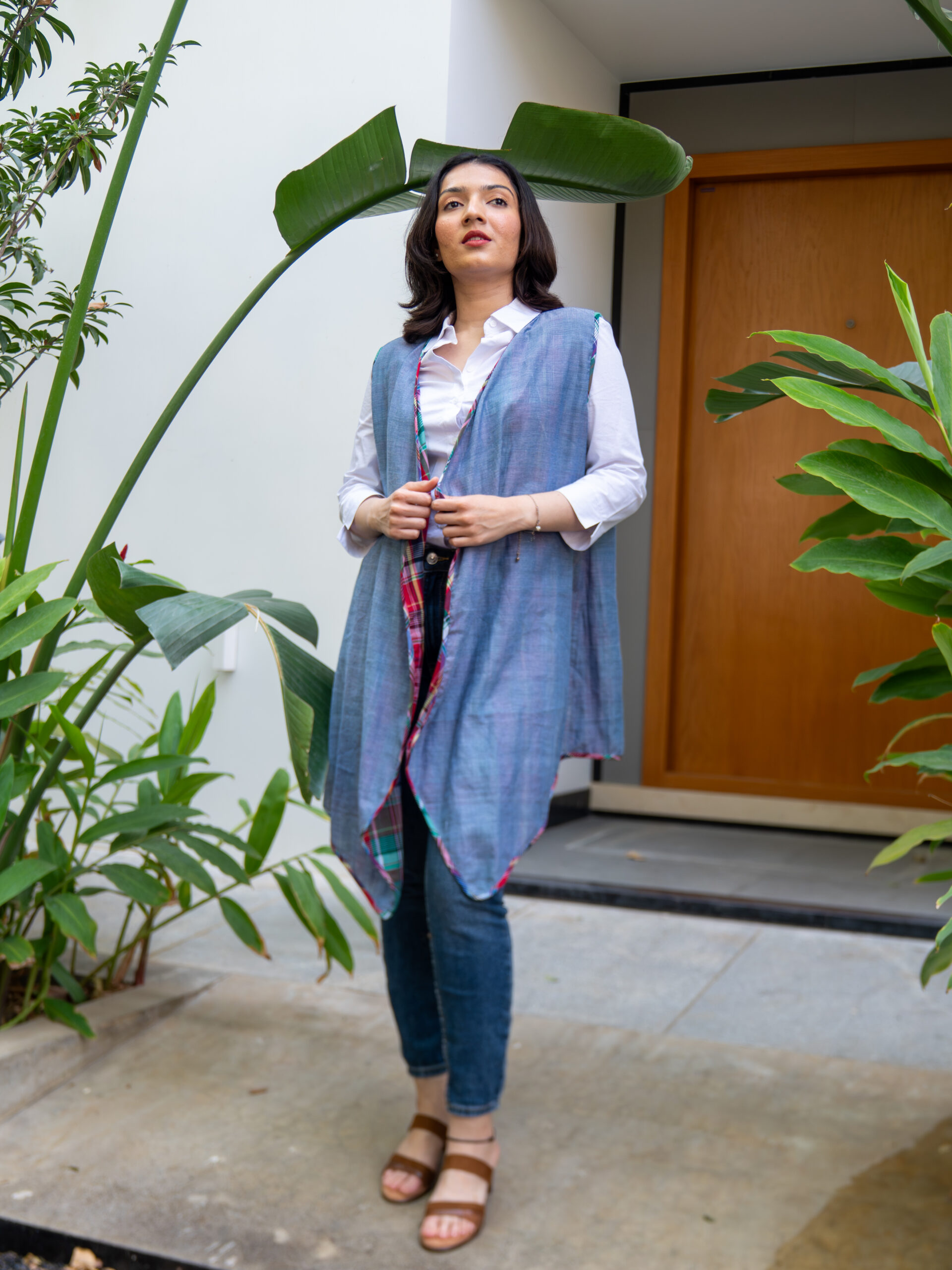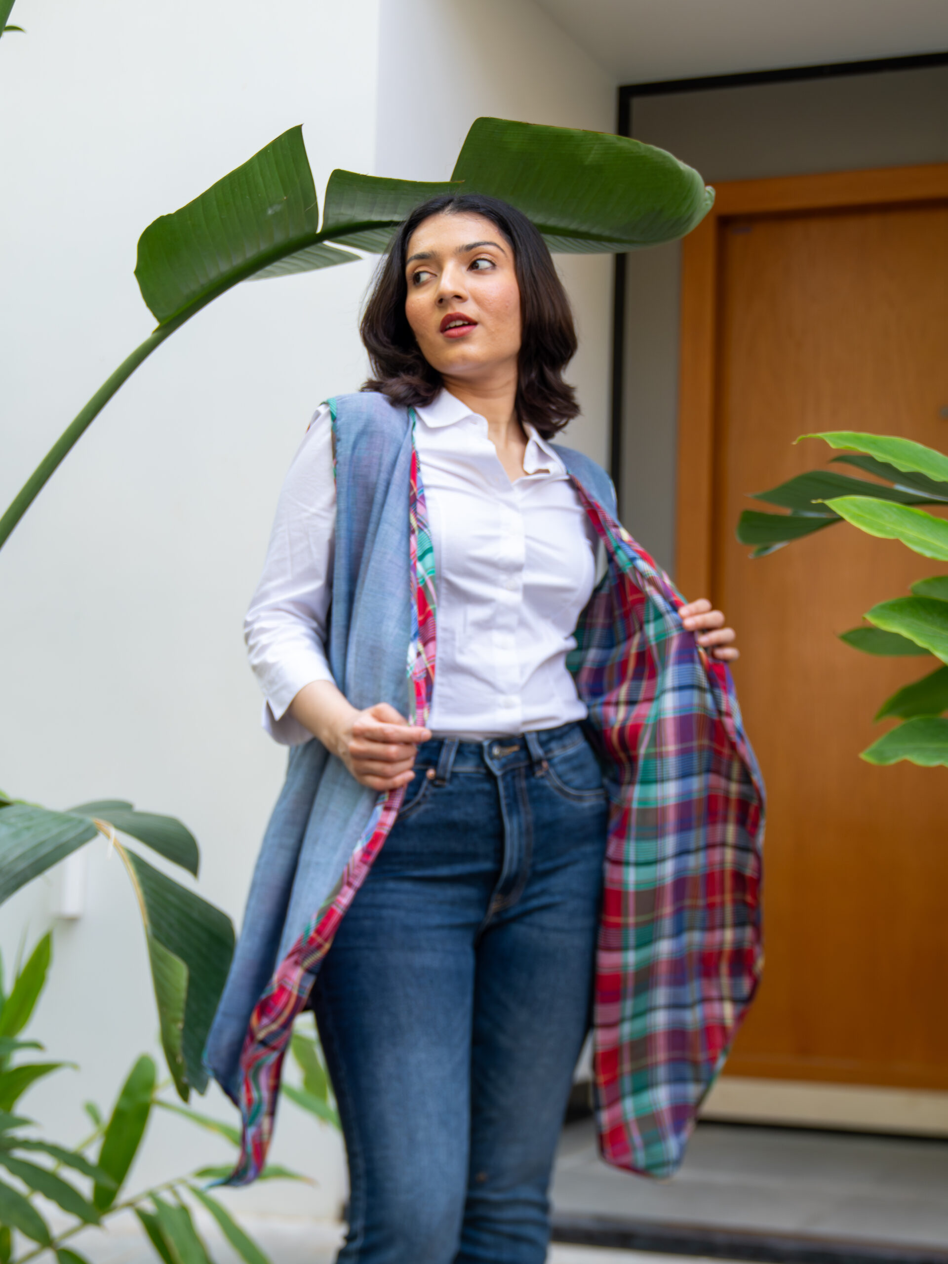 Introducing our versatile reversible throw jacket—an effortless layering piece designed for dynamic styling. Crafted in breathable cotton, it features a sleeveless silhouette with a dual-faced design: classic checks on one side and solid on the other, offering two distinct looks in one.