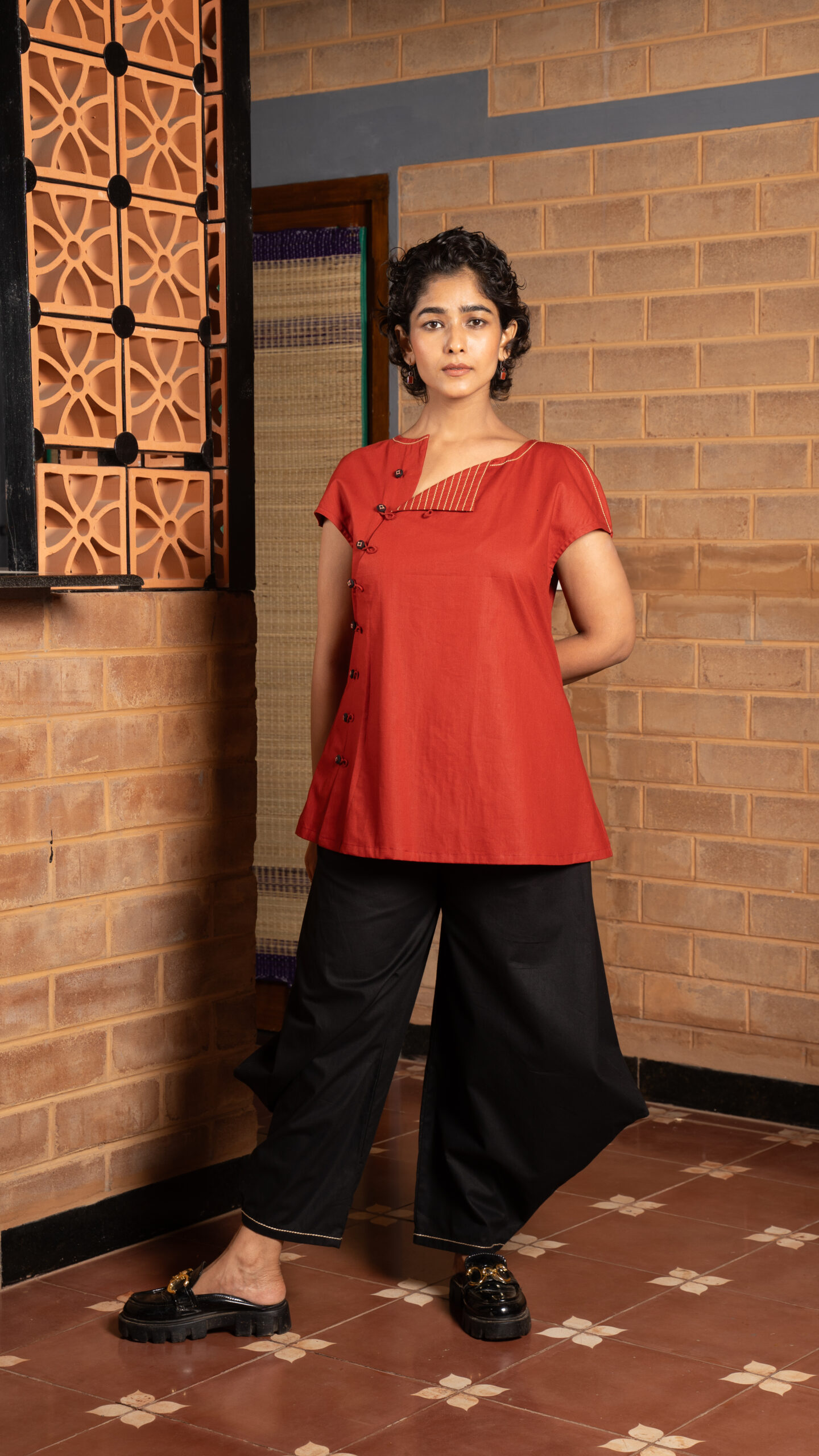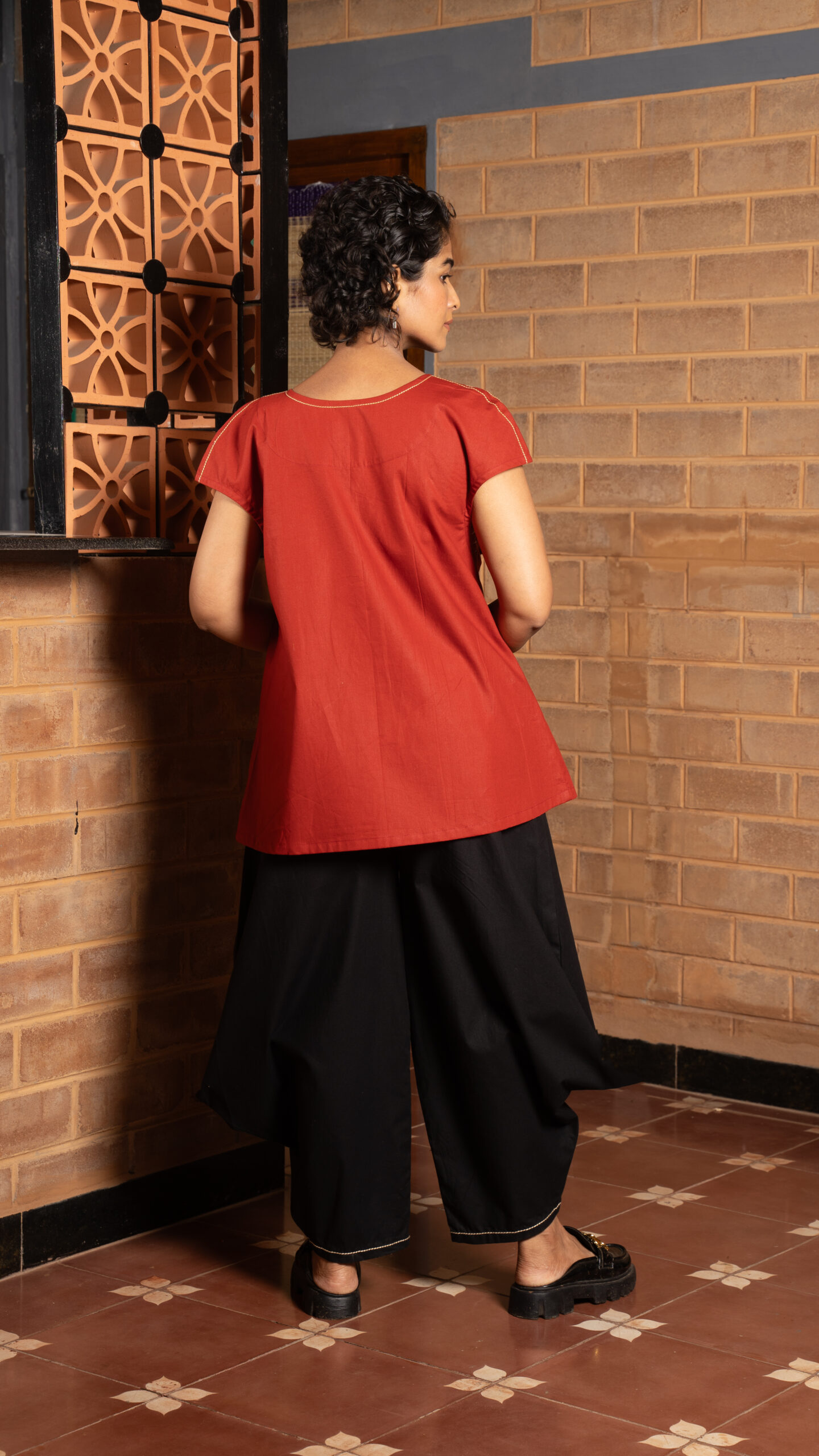 Our versatile Cotton Top, is designed for both style and comfort. It features handcrafted buttons and intricate Kantha embroidery details on the button flap, allowing it to be worn both ways. Kantha stitches run along the shoulders, adding a touch of traditional elegance to this modern piece. Perfect for any occasion, this top seamlessly blends timeless craftsmanship with contemporary fashion.