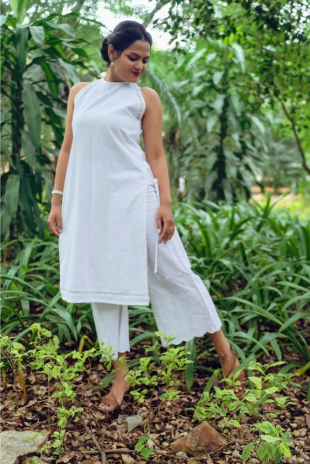 Introducing our cotton halter-neck kurta crafted from breathable, lightweight fabric for all-day comfort. It features delicate pearl lace detailing along the armholes, tie-up accents at the sides, lace fagoting at the hemline, and a keyhole with shell button closure at the back for an elegant finish.