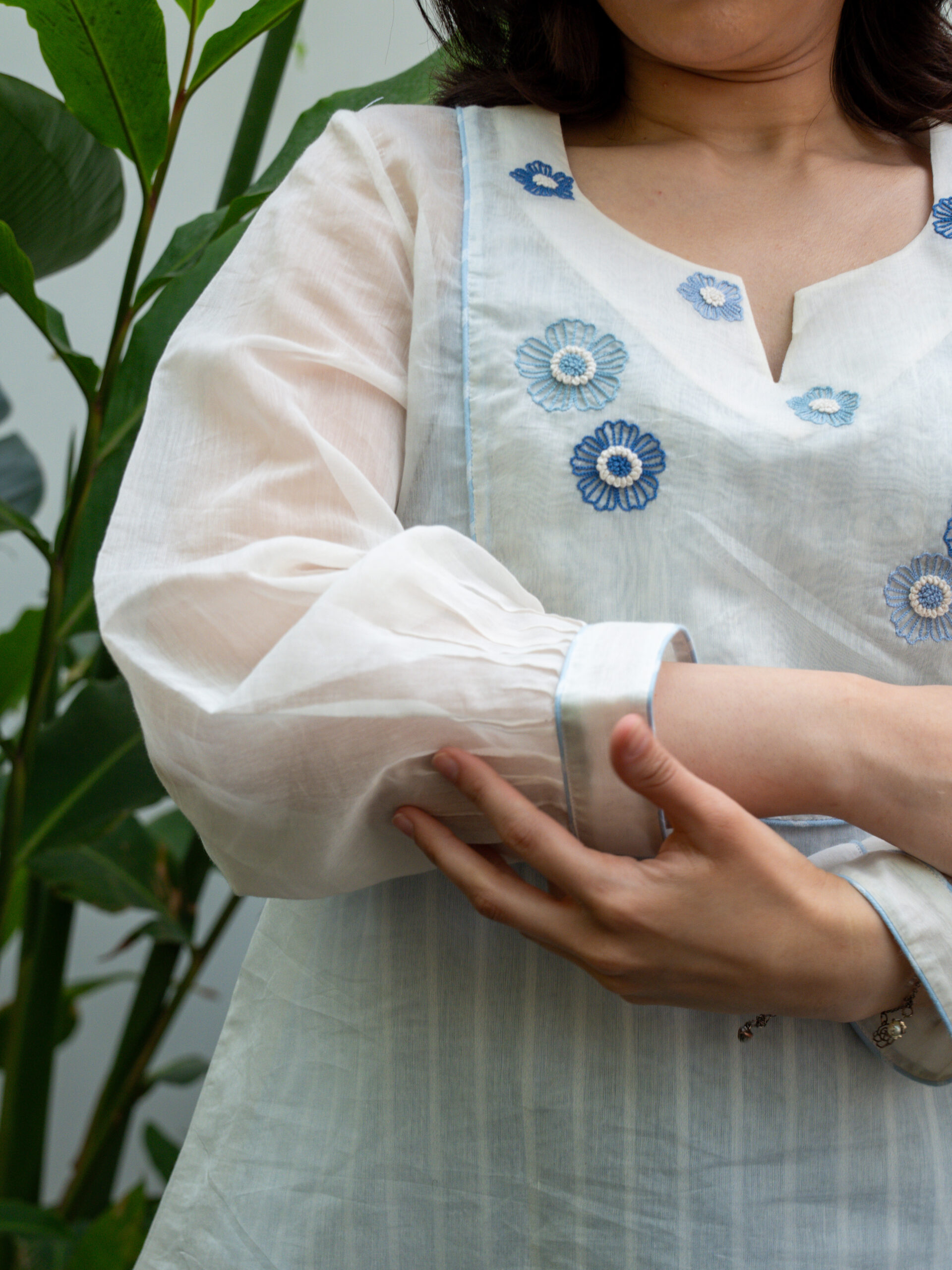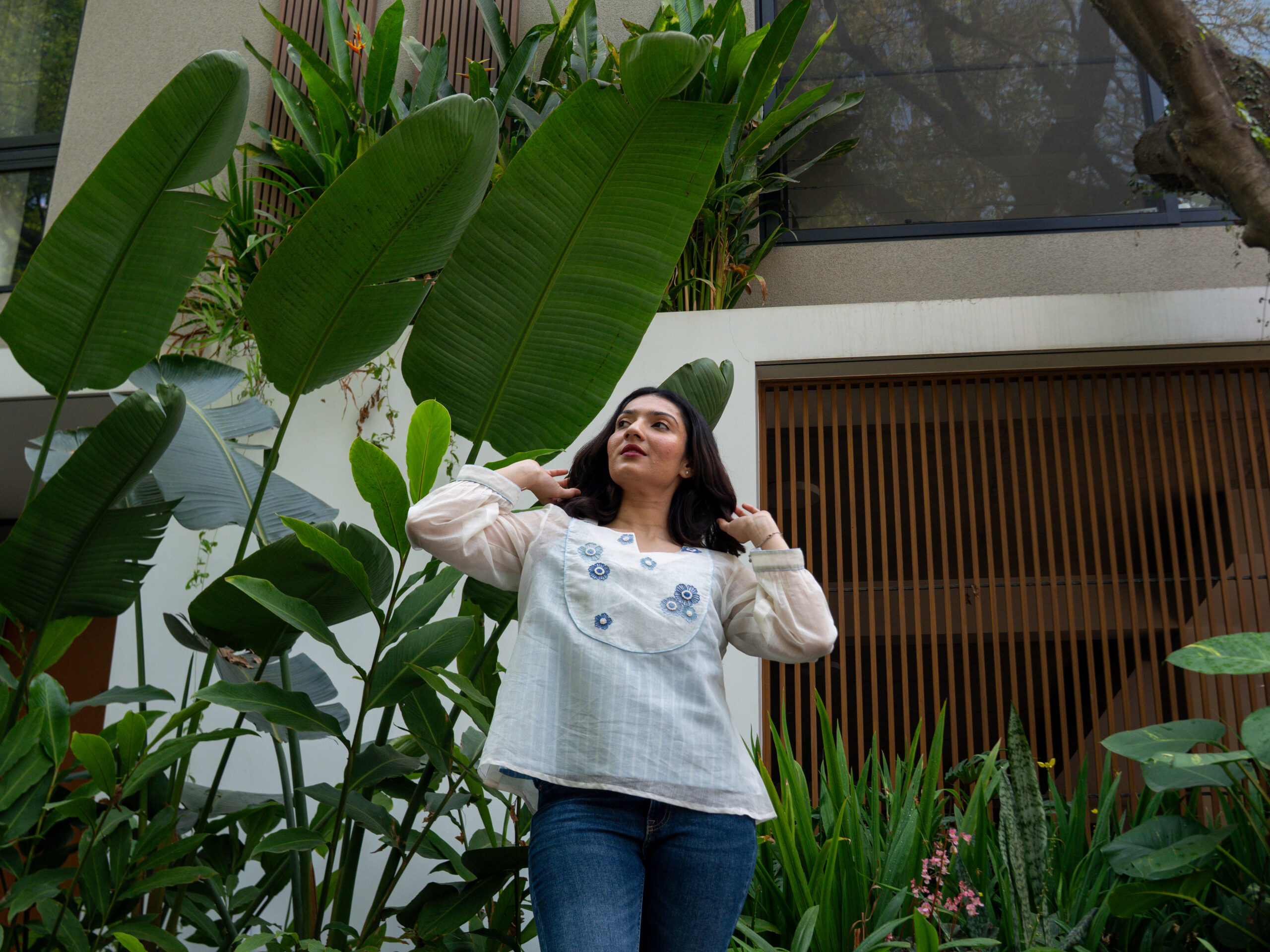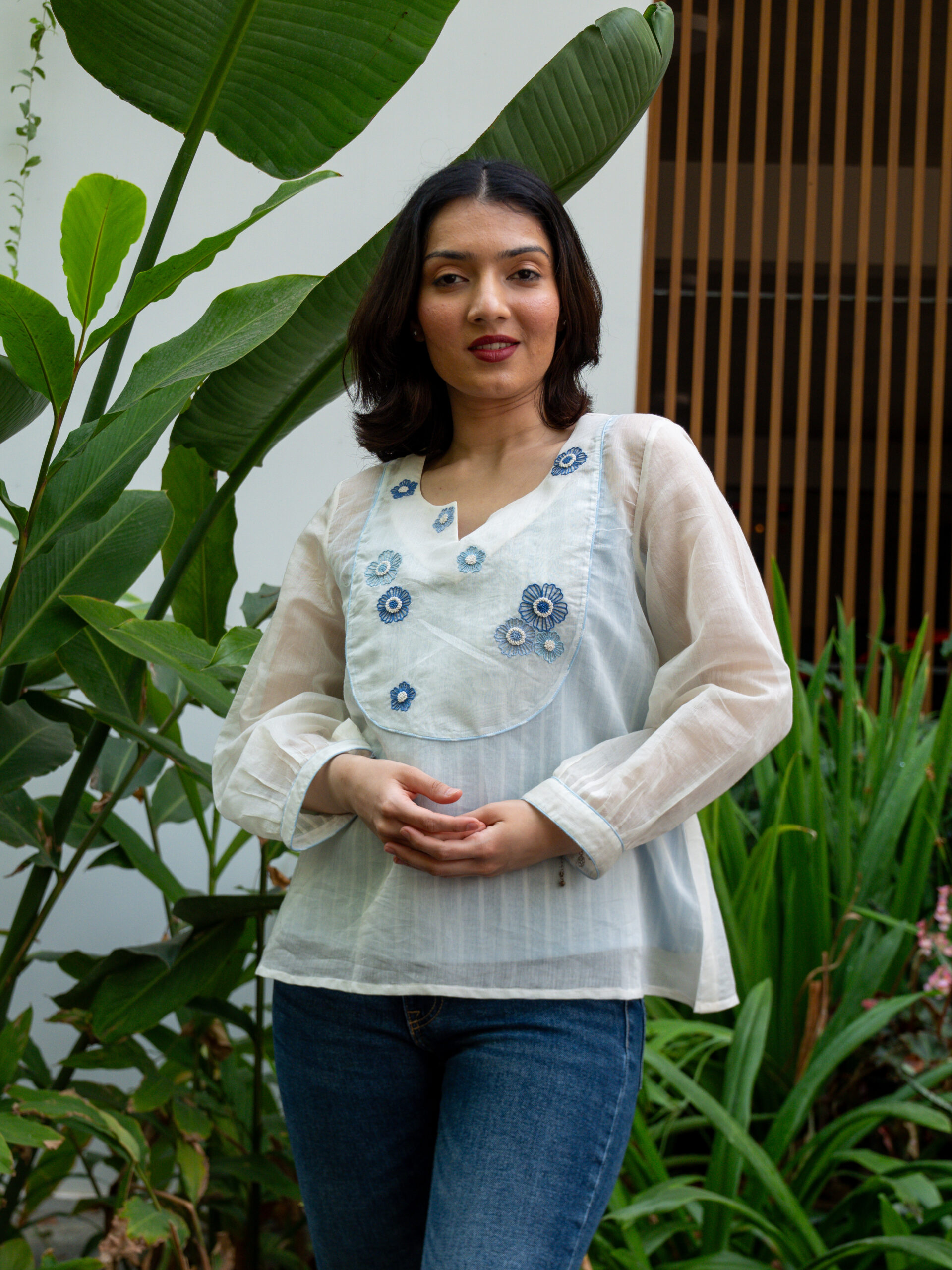 Introducing our delicately layered short top—light, airy, and breathable. The inner layer features an adjustable spaghetti-strap top crafted from blue cotton checkered fabric. The outer layer is made of sheer Chanderi cotton, adorned with fine hand fembroidery. Designed for a loose, relaxed fit, it includes puff sleeves with piping detail along the embroidered yoke and sleeve hem—blending elegance with everyday ease.