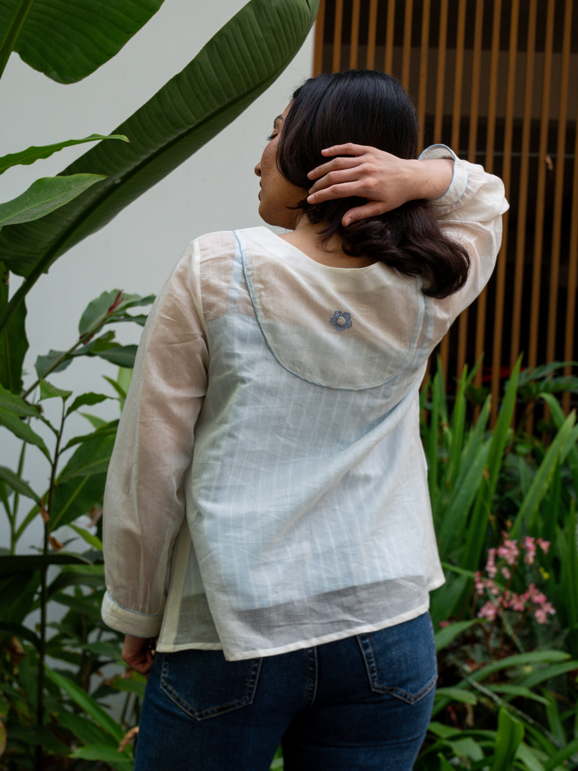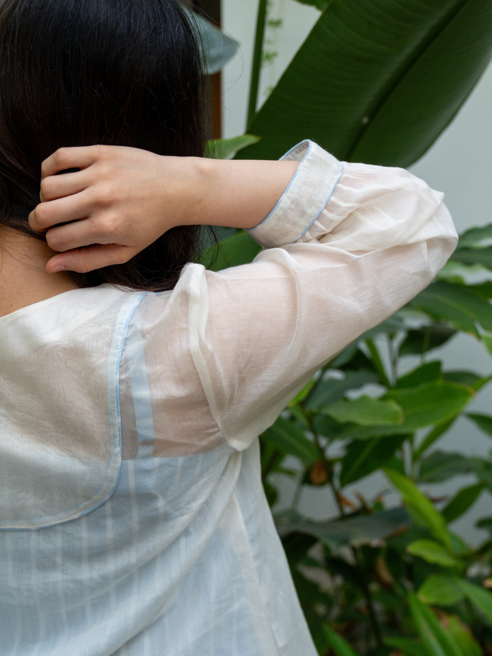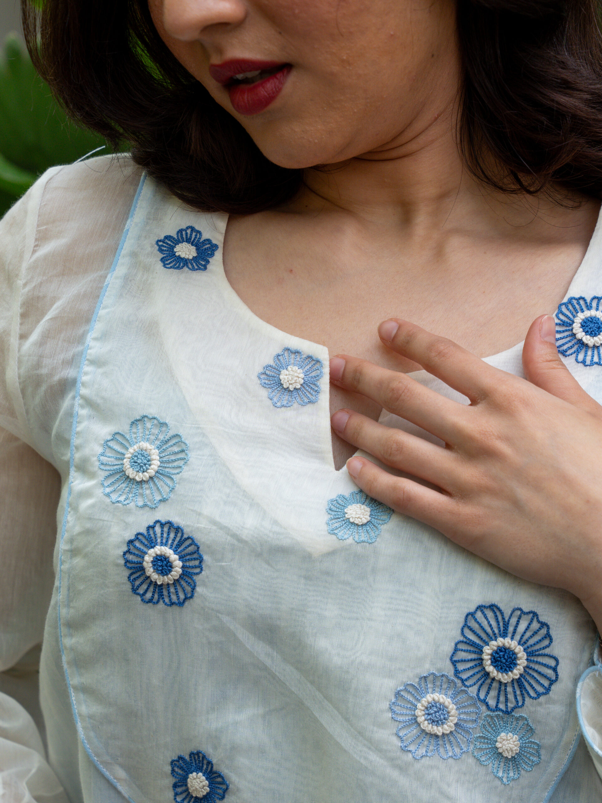 Introducing our delicately layered short top—light, airy, and breathable. The inner layer features an adjustable spaghetti-strap top crafted from blue cotton checkered fabric. The outer layer is made of sheer Chanderi cotton, adorned with fine hand fembroidery. Designed for a loose, relaxed fit, it includes puff sleeves with piping detail along the embroidered yoke and sleeve hem—blending elegance with everyday ease.
