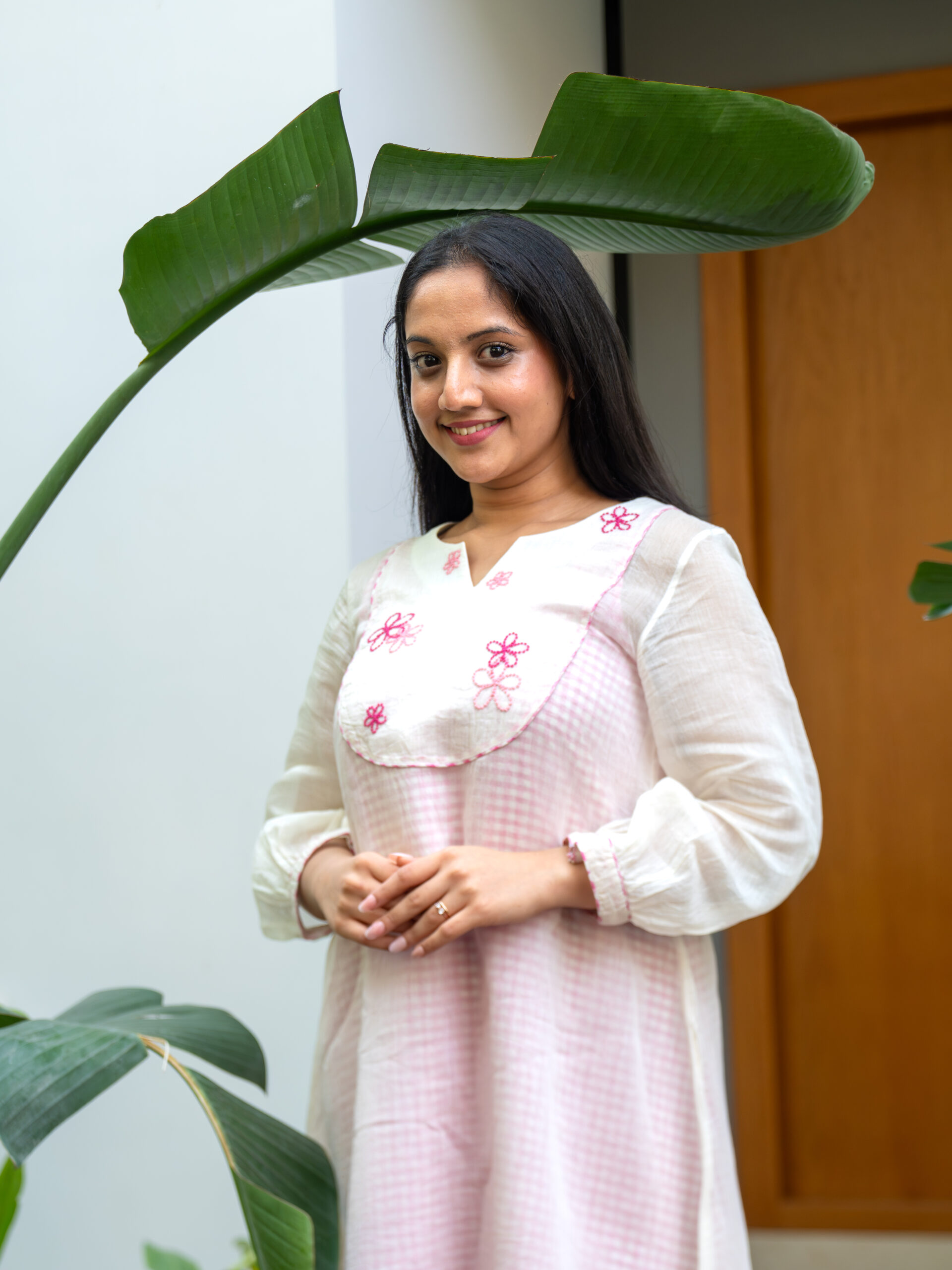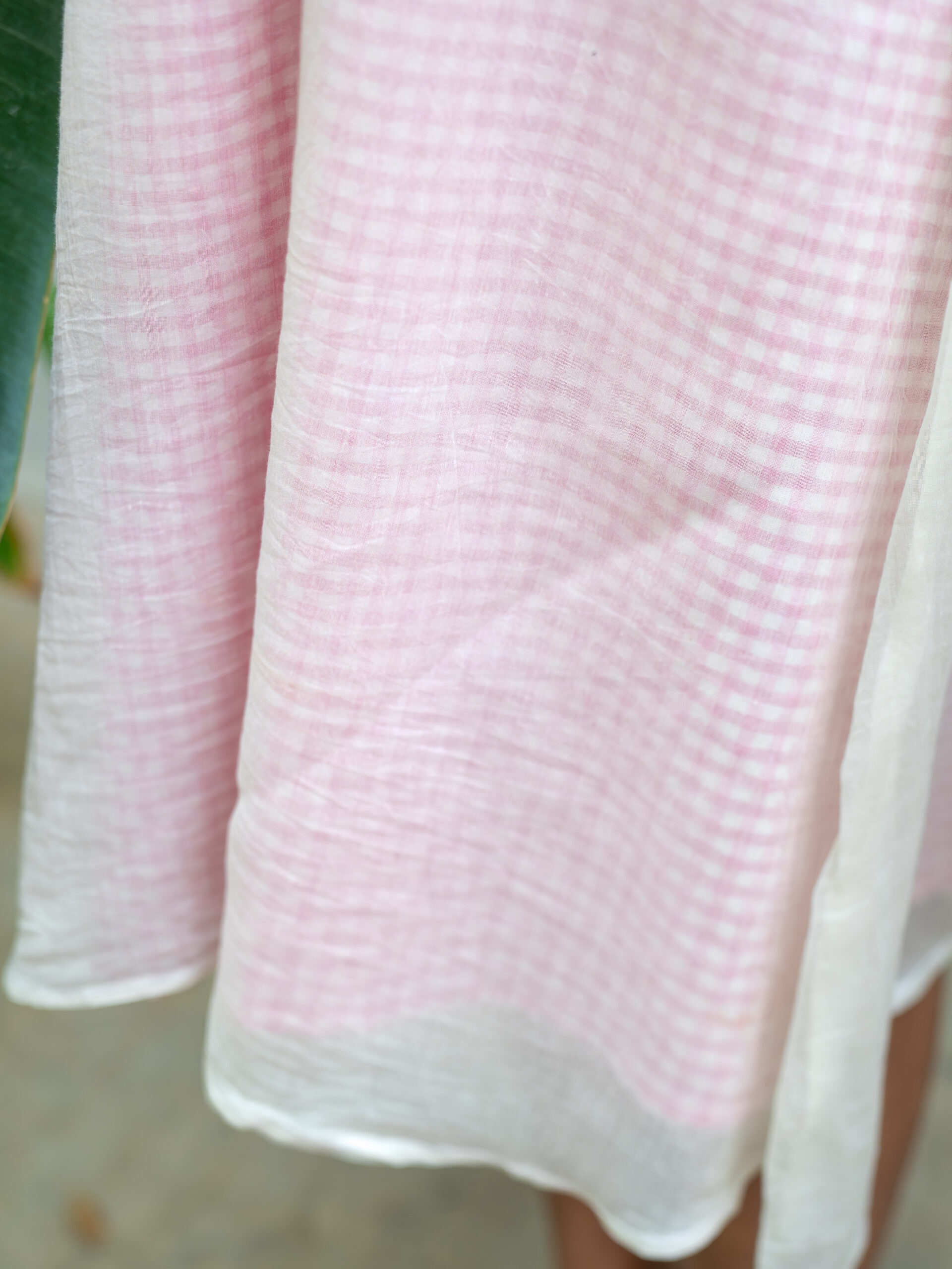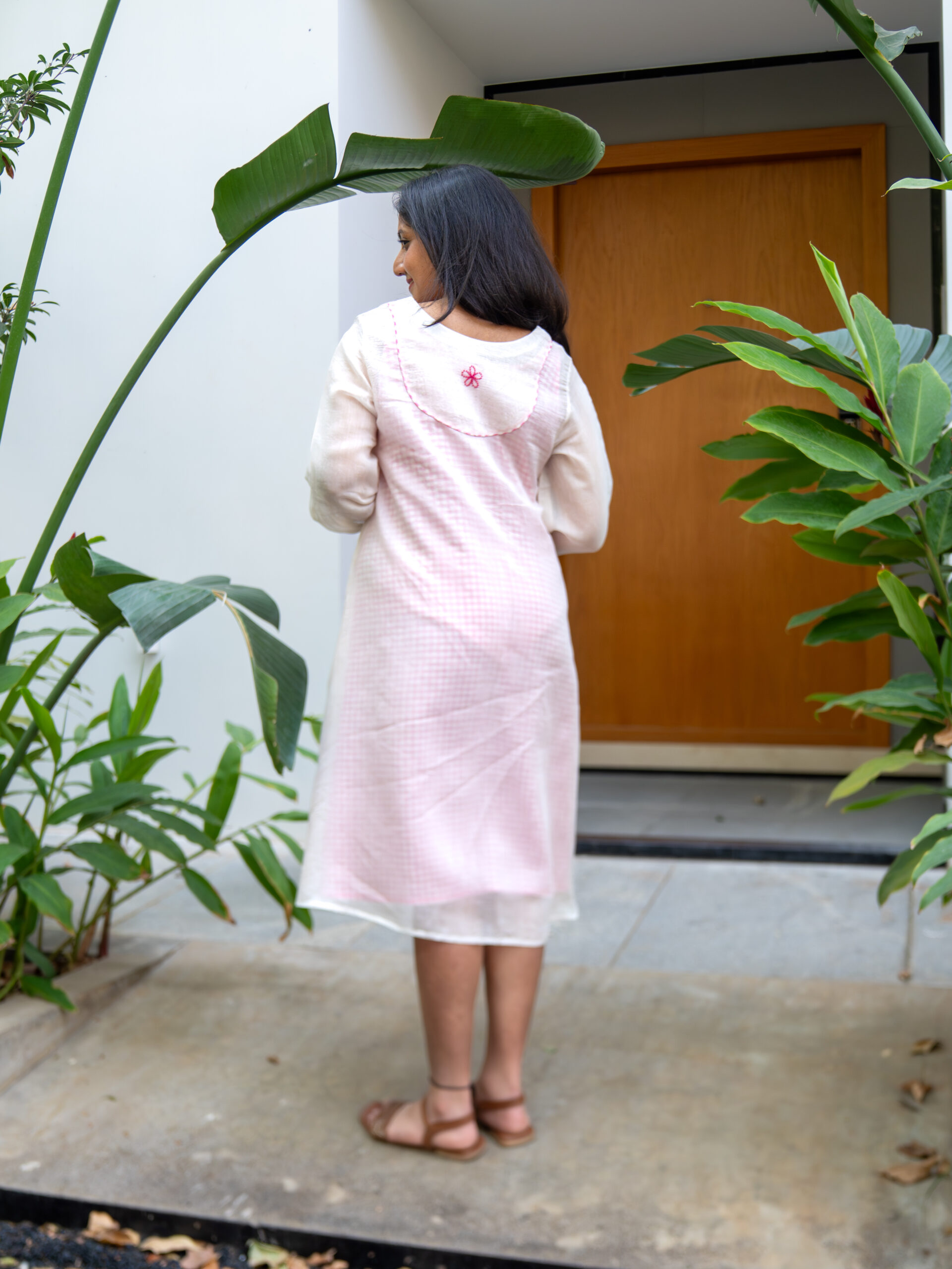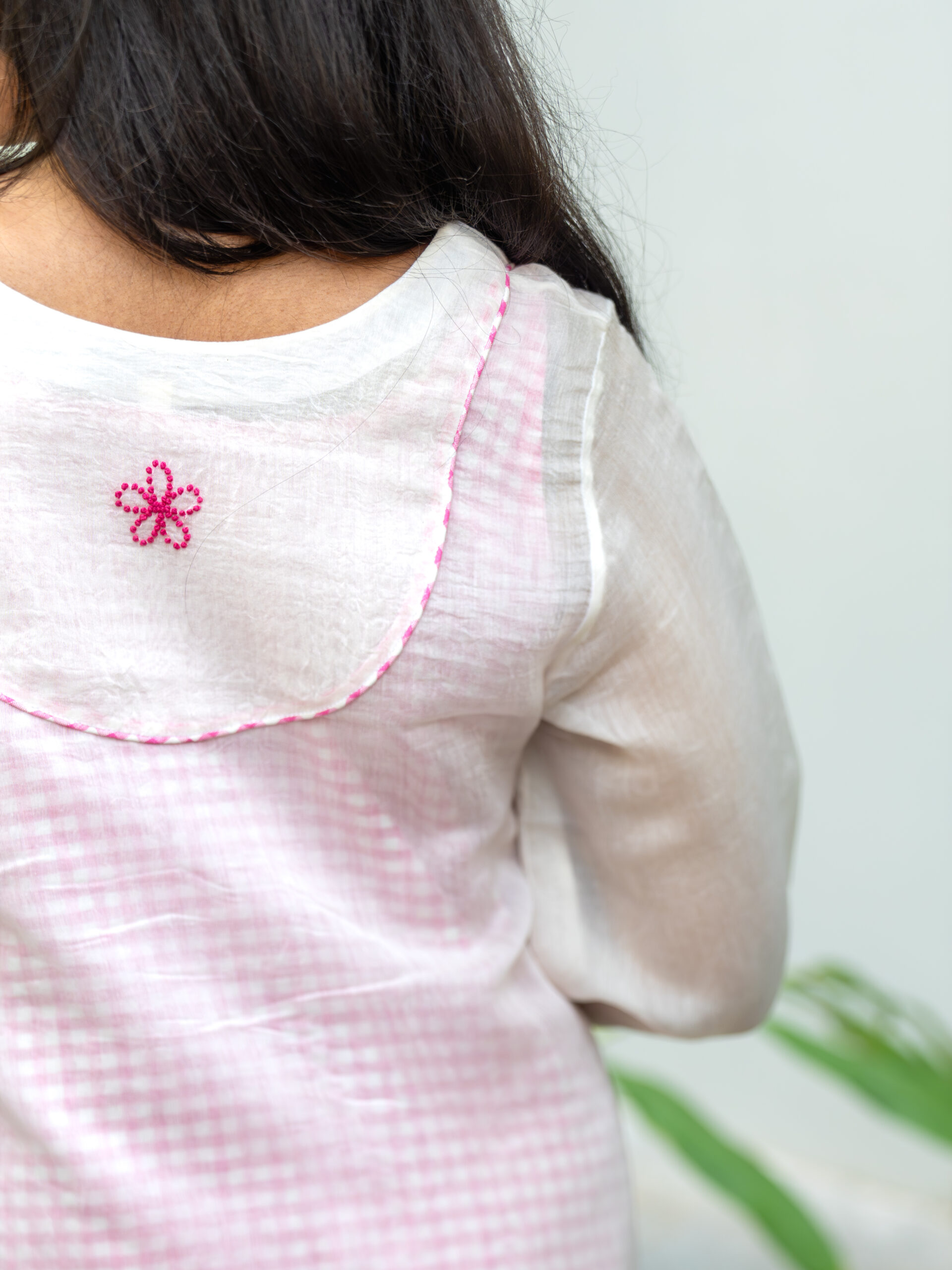 Introducing our delicately layered short dress—light, airy, and breathable. The inner layer features a short dress crafted from pink gingham checkered cotton. The outer layer is made of sheer Chanderi cotton, adorned with fine hand embroidery. Designed for a loose, relaxed fit, it includes puff sleeves with piping detail along the embroidered yoke and sleeve hem—blending elegance with everyday ease.
