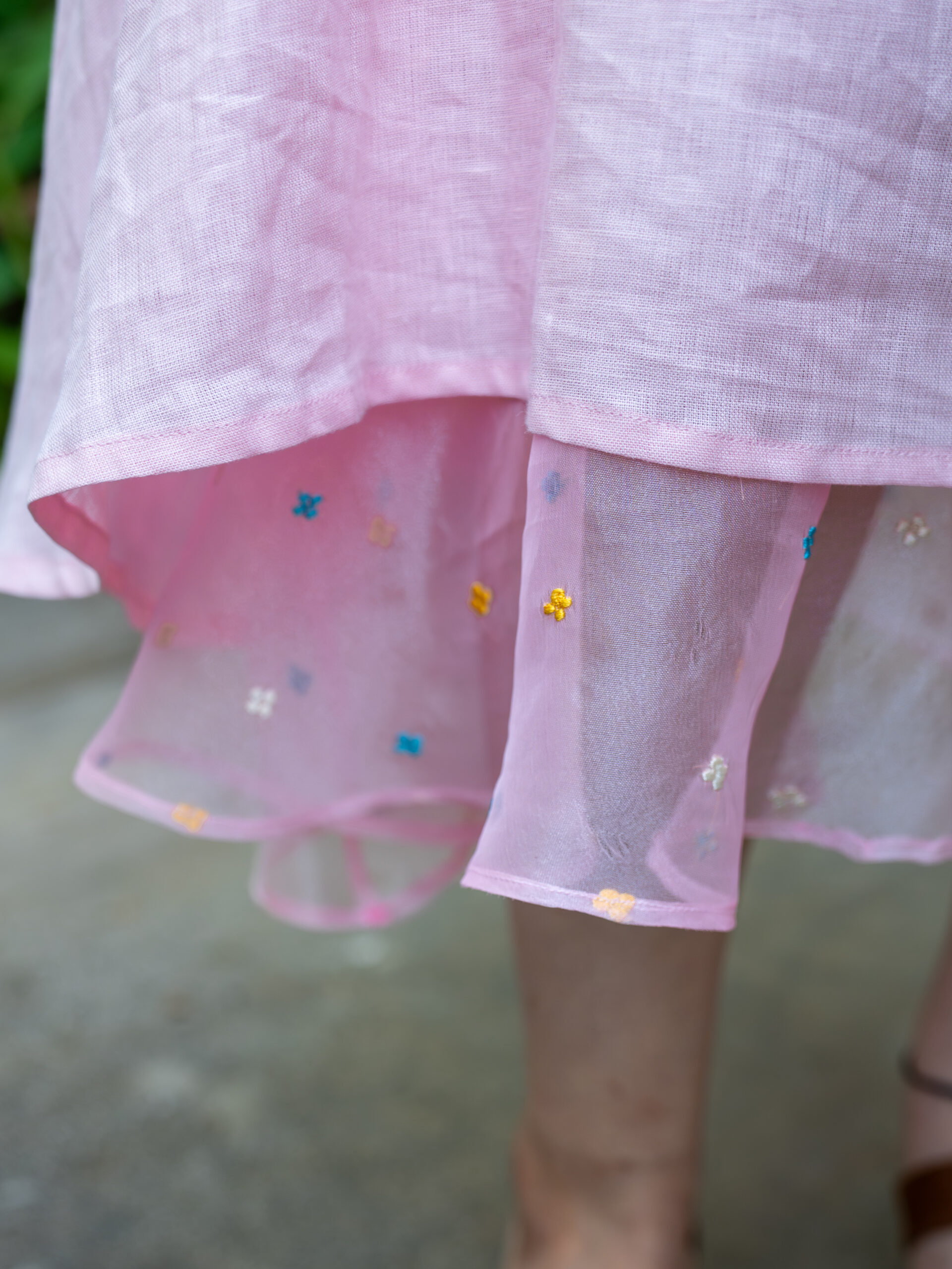 The layered construction adds subtle depth, with a delicate underlayer peeking through to enhance its graceful movement. Thoughtfully designed with functional pockets, accented by button-embellished details, it blends utility with quiet charm.