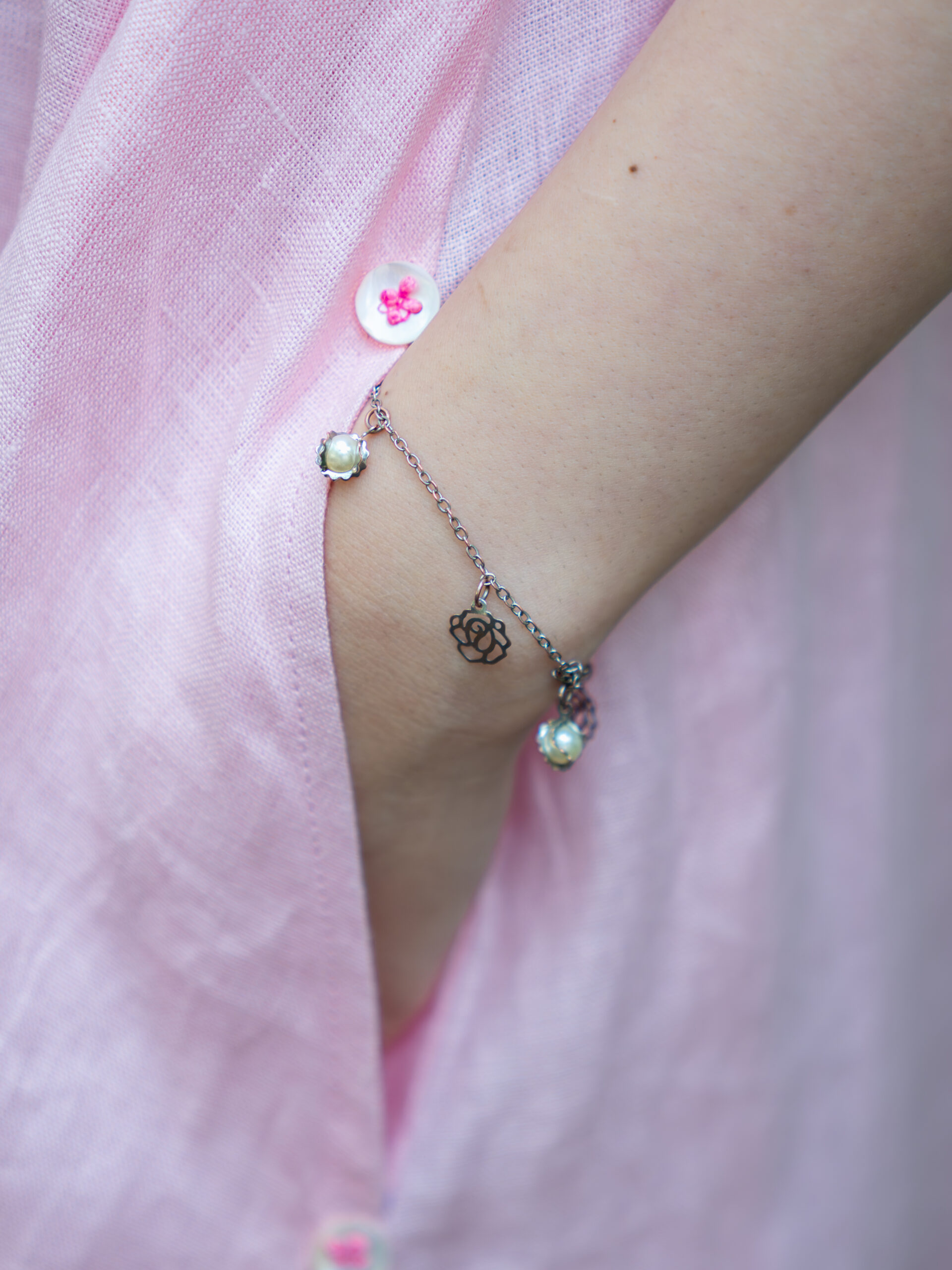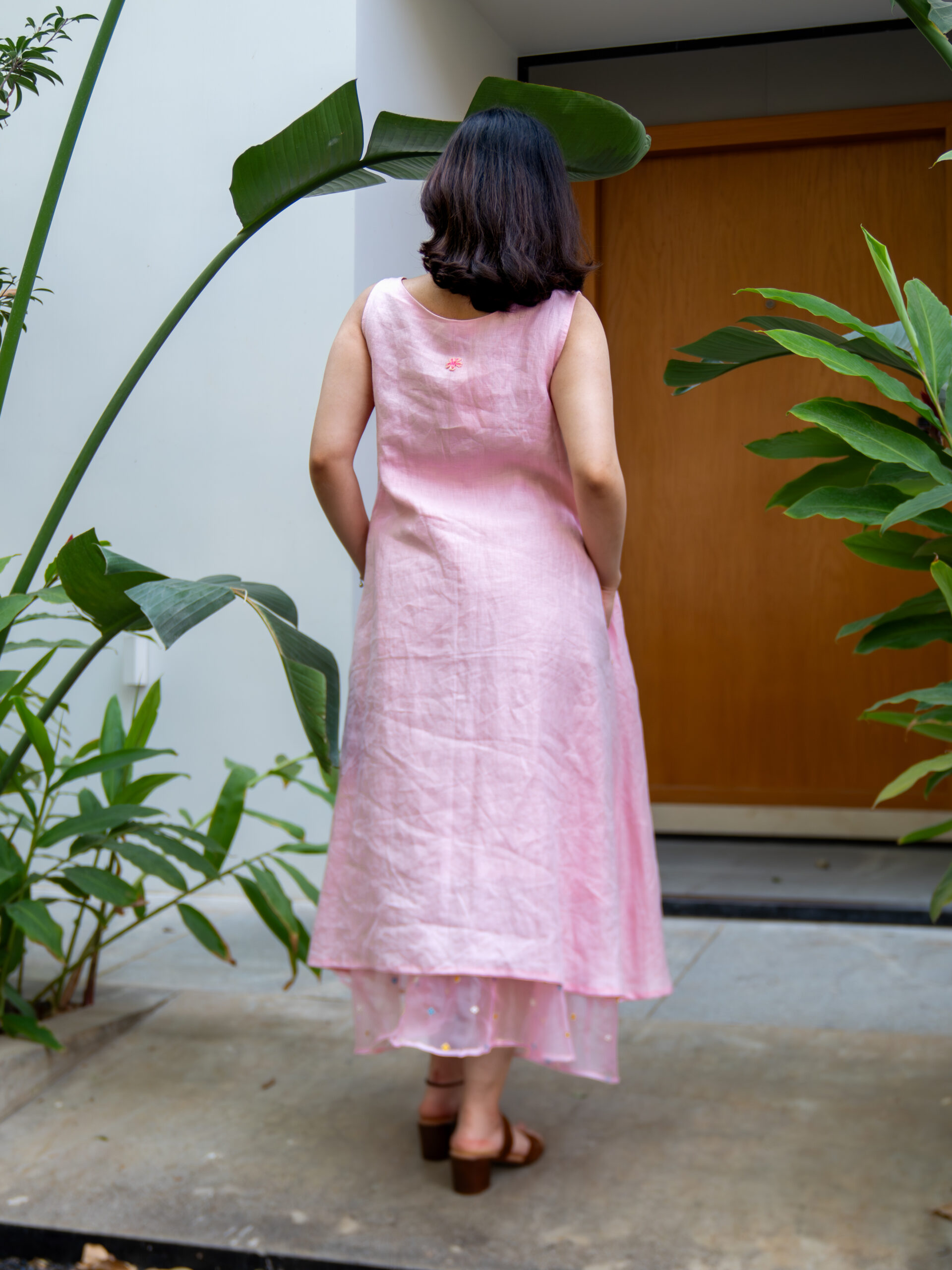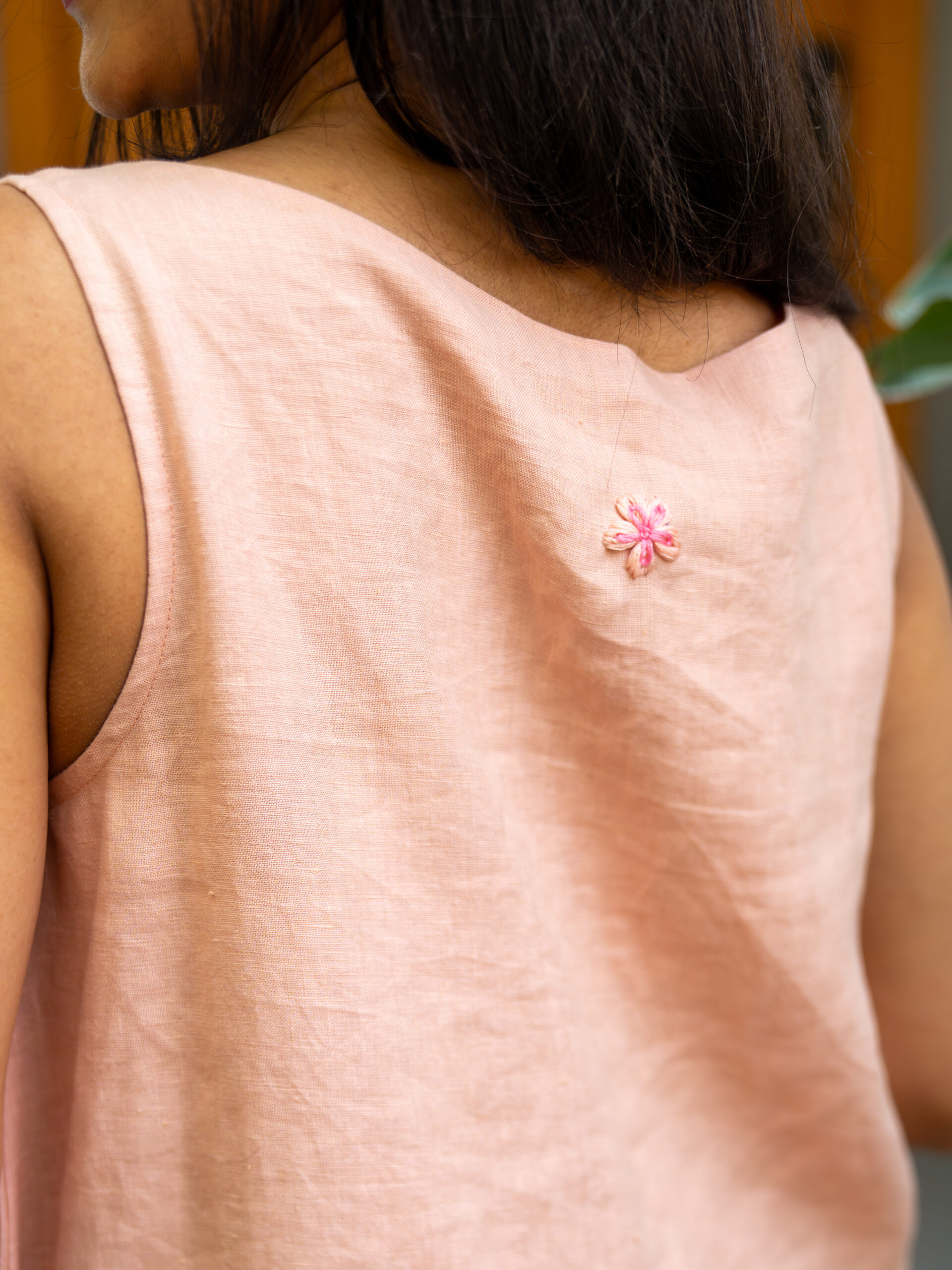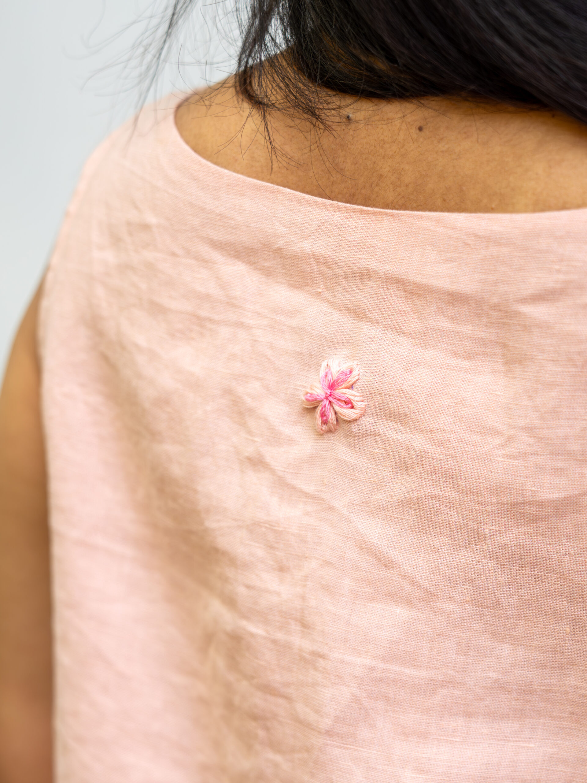 At the back, a hand-embroidered floral motif lends a touch of artisanal beauty—an intimate detail that elevates the piece. Easy, elegant, and endlessly wearable.