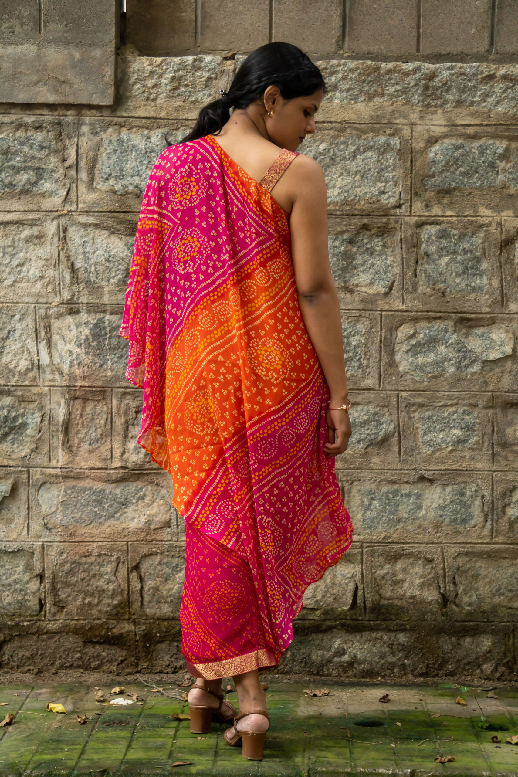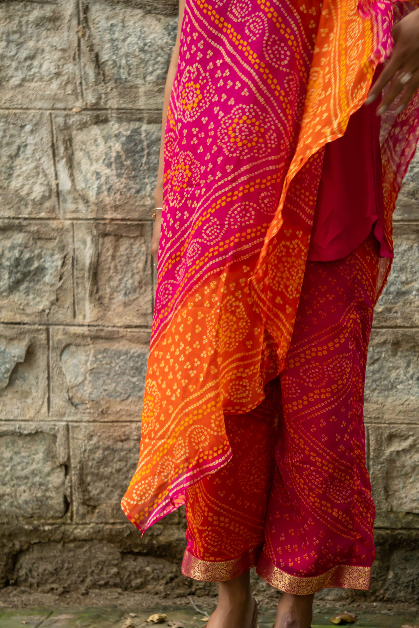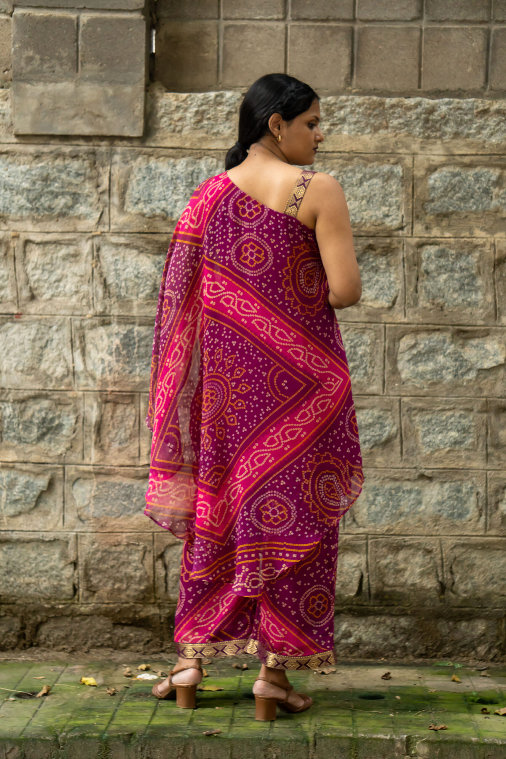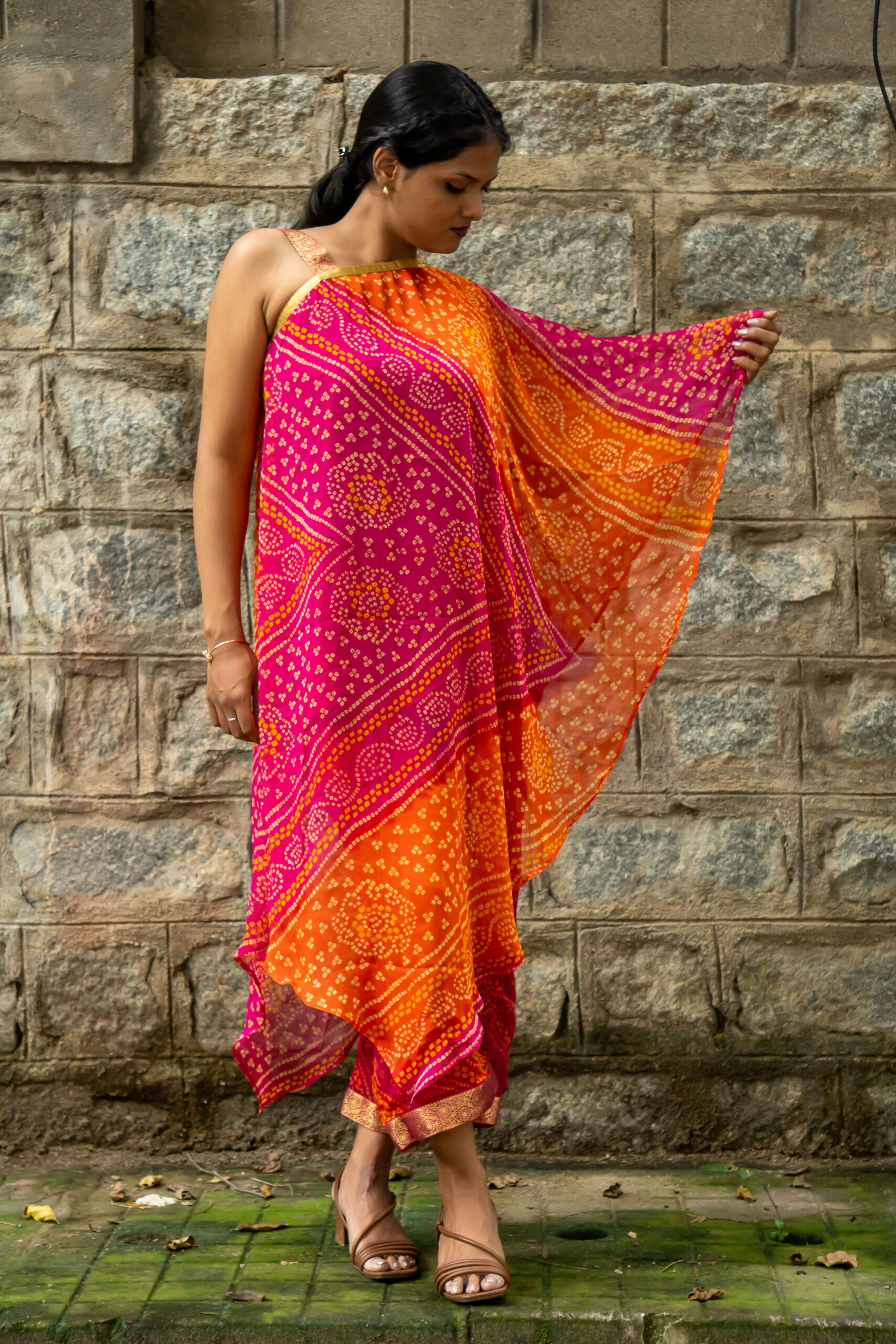 Elevate your ethnic style with our stunning kaftan bottom set, lovingly upcycled from an ombre dyed bandhani georgette saree. The one-shoulder neckline and asymmetric hemline add a modern twist to this traditional ensemble, while the flared pants create a dramatic flair. Perfect for special occasions or cultural celebrations, this unique piece is sure to make you stand out with its intricate bandhani print and beautiful ombre hues.