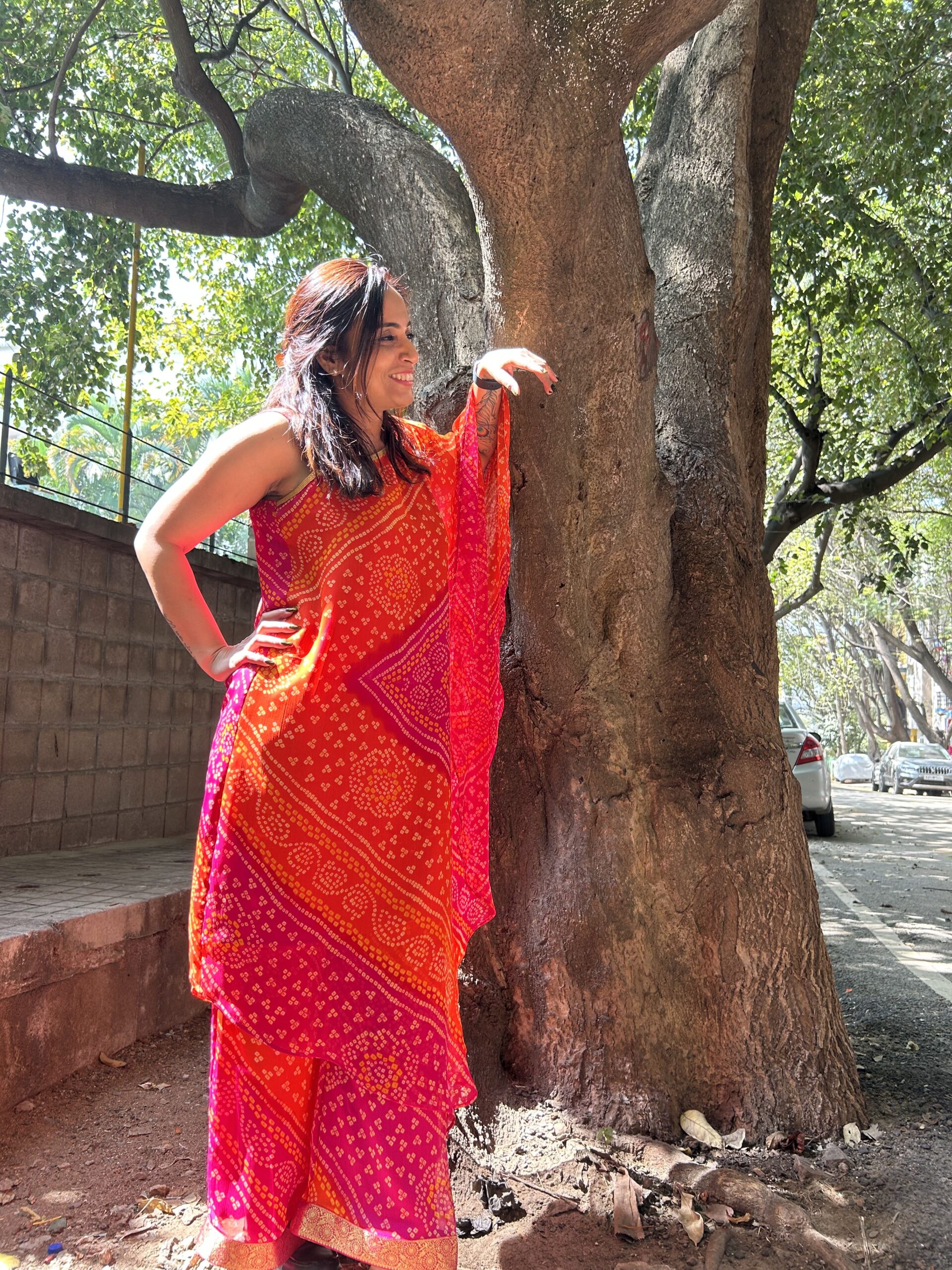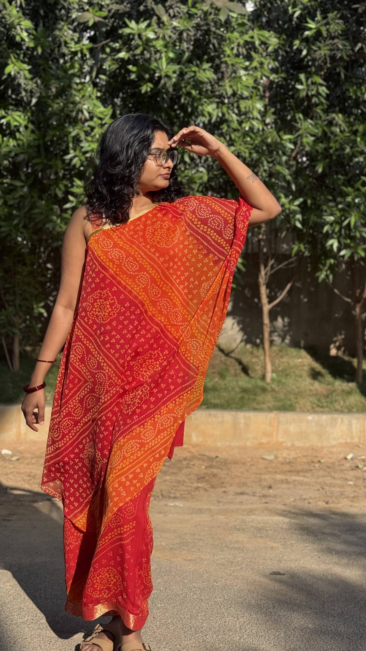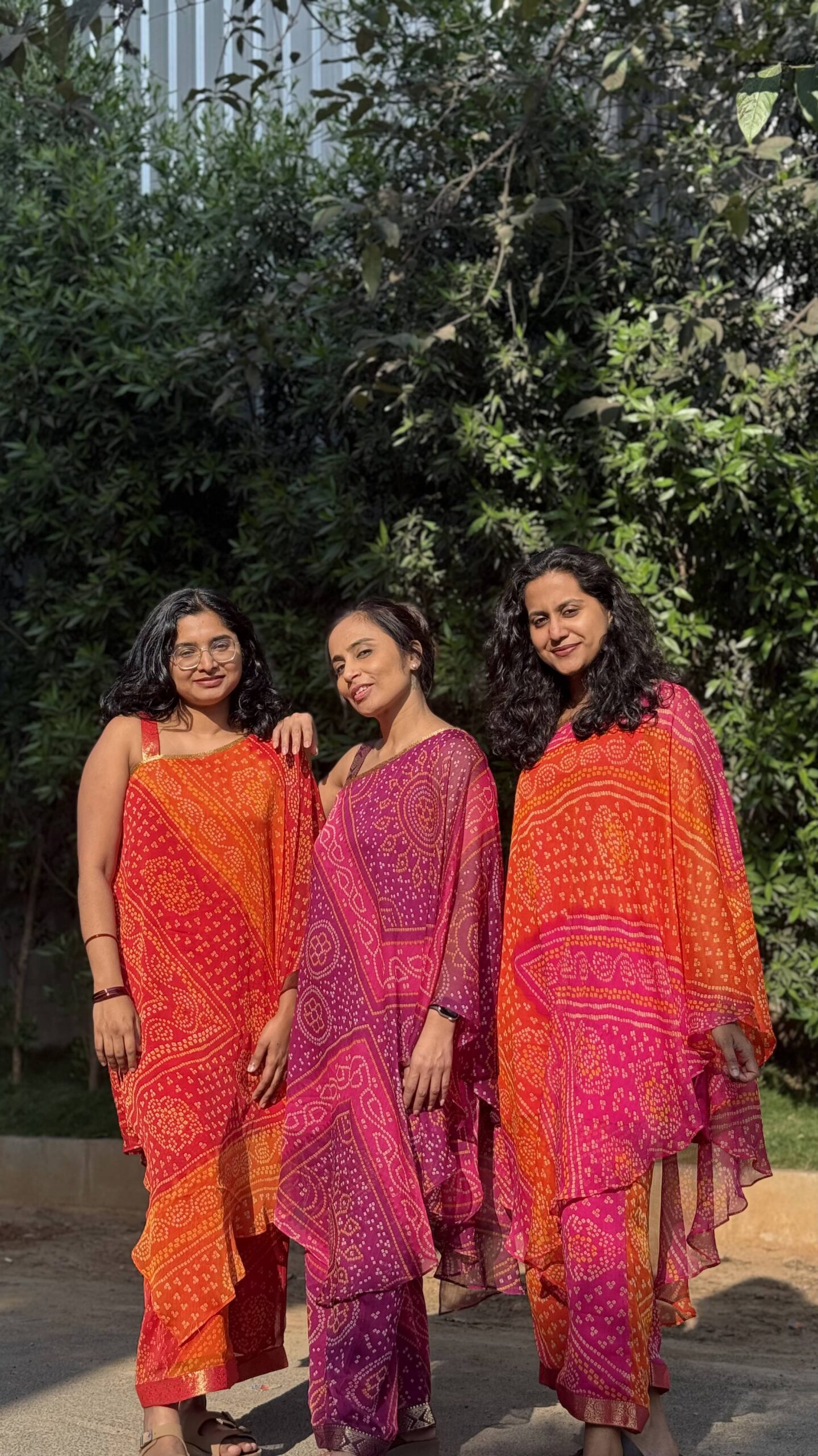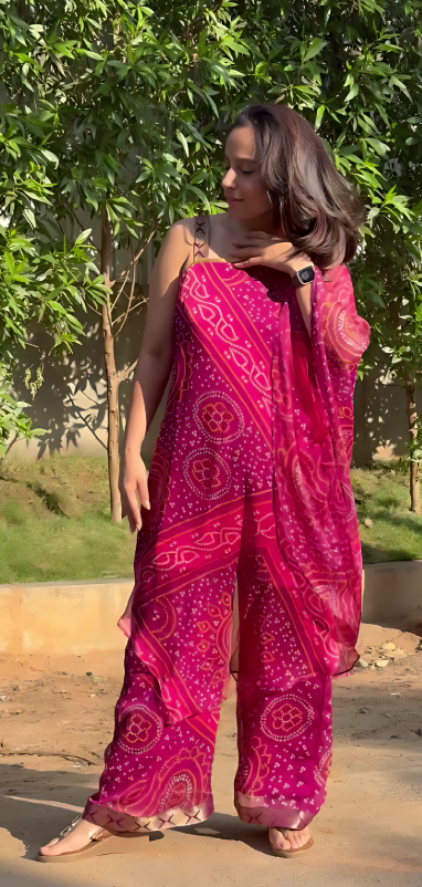 Elevate your ethnic style with our stunning kaftan bottom set, lovingly upcycled from an ombre dyed bandhani georgette saree. The one-shoulder neckline and asymmetric hemline add a modern twist to this traditional ensemble, while the flared pants create a dramatic flair. Perfect for special occasions or cultural celebrations, this unique piece is sure to make you stand out with its intricate bandhani print and beautiful ombre hues.