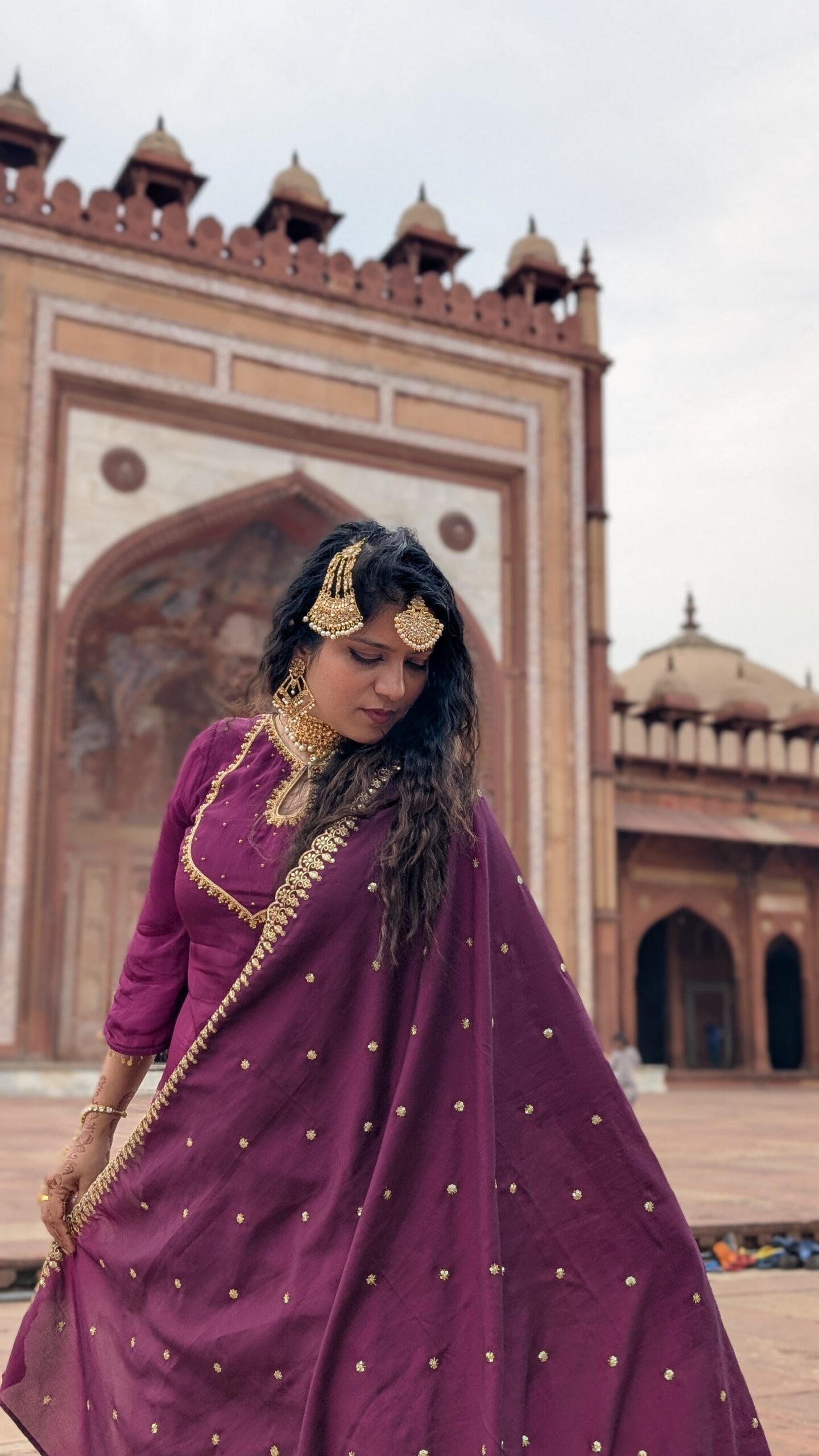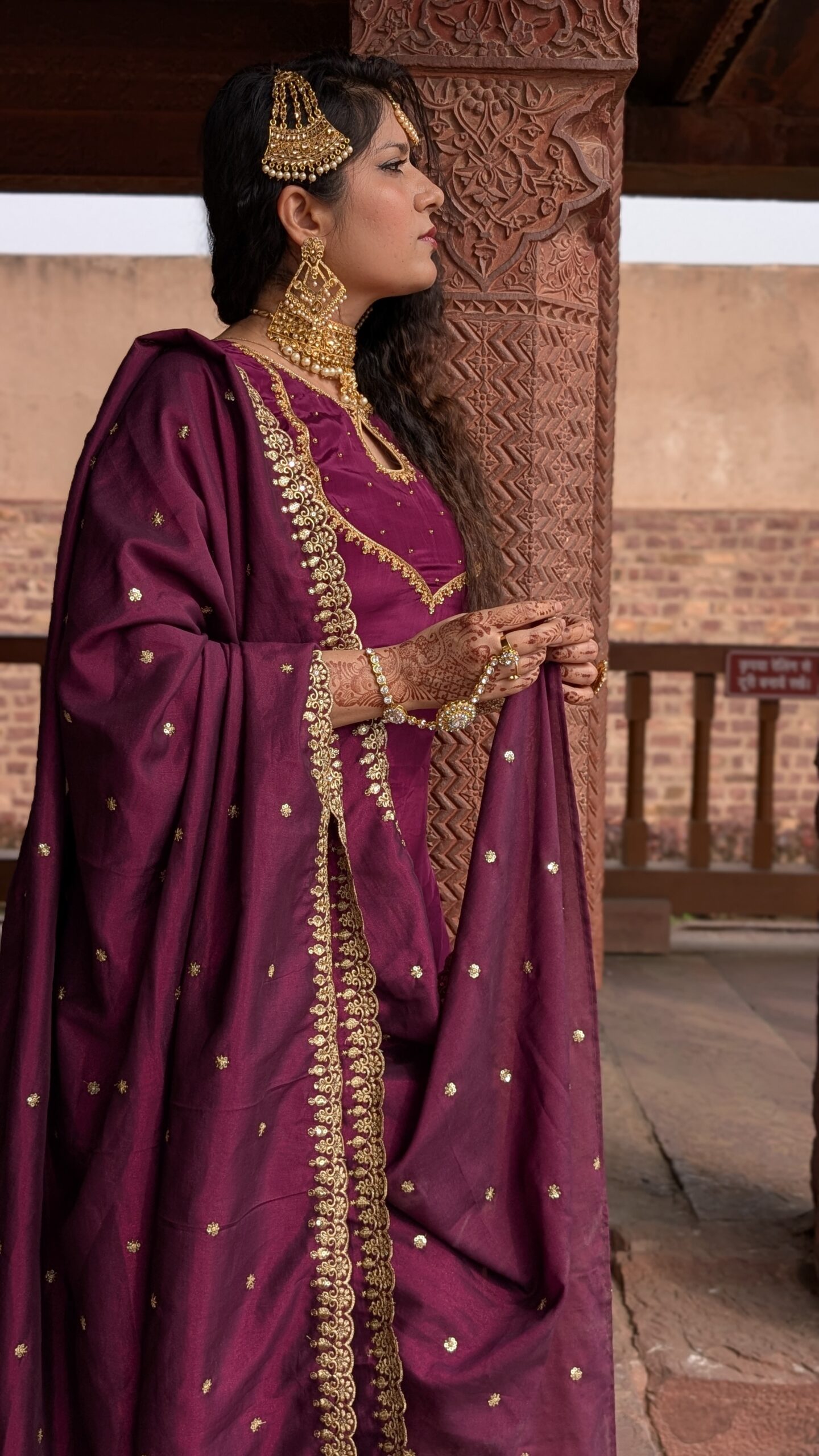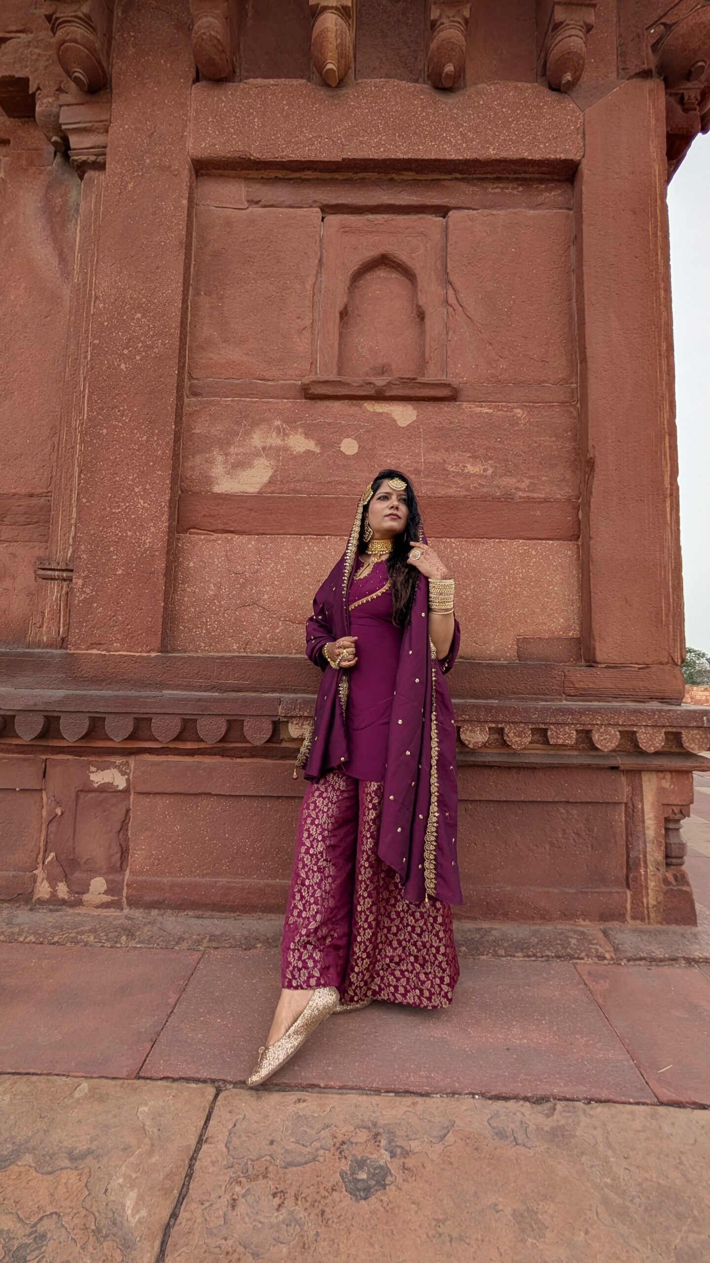 Elevate your ethnic style with our stunning 3-piece kurta bottom set! The crepe silk kurta features a beautifully hand-embroidered neckline, while the flared pants in Banarasi fabric with a kali pattern adding a touch of drama and elegance. Perfect for special occasions or festive gatherings, this ensemble is sure to make you shine!