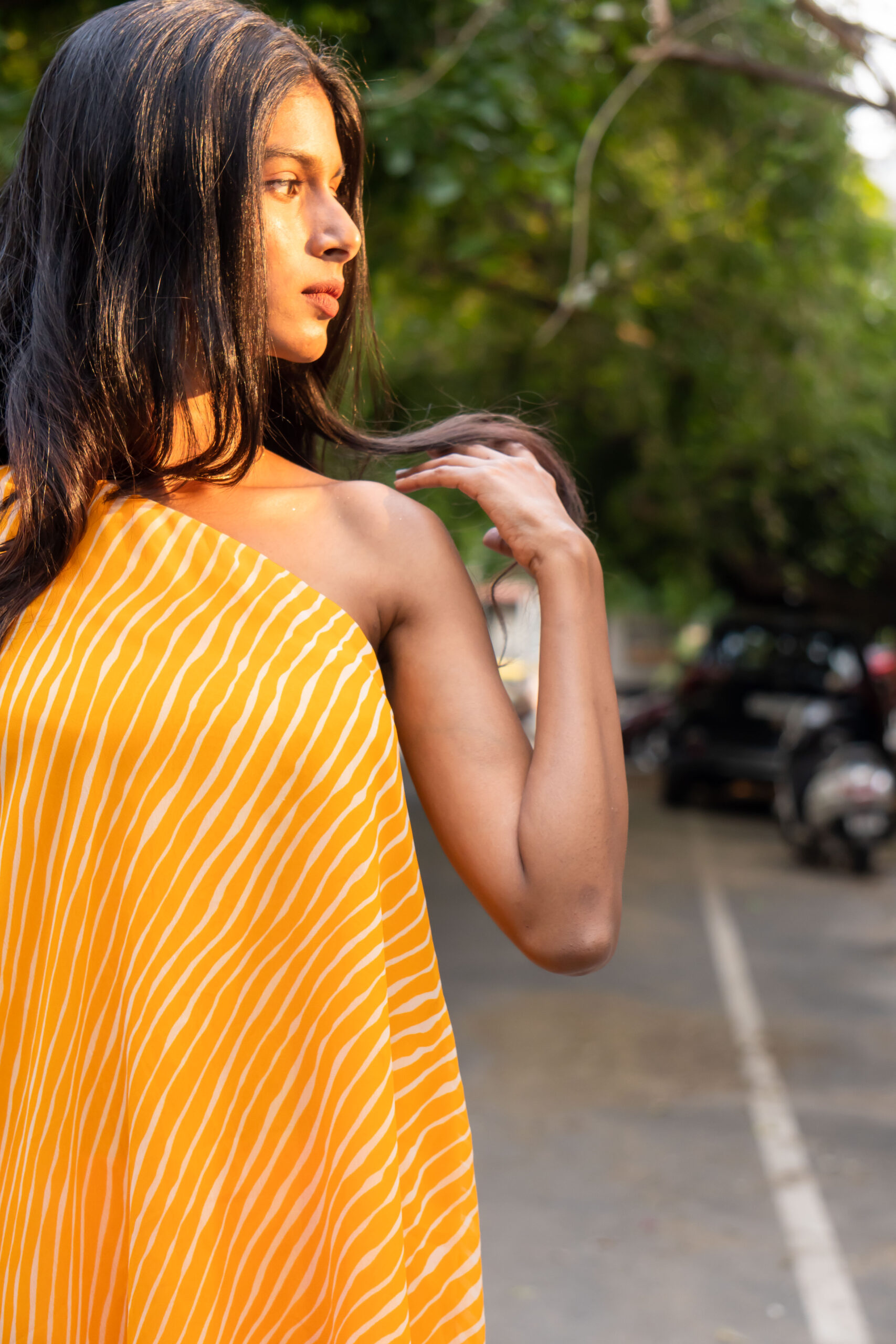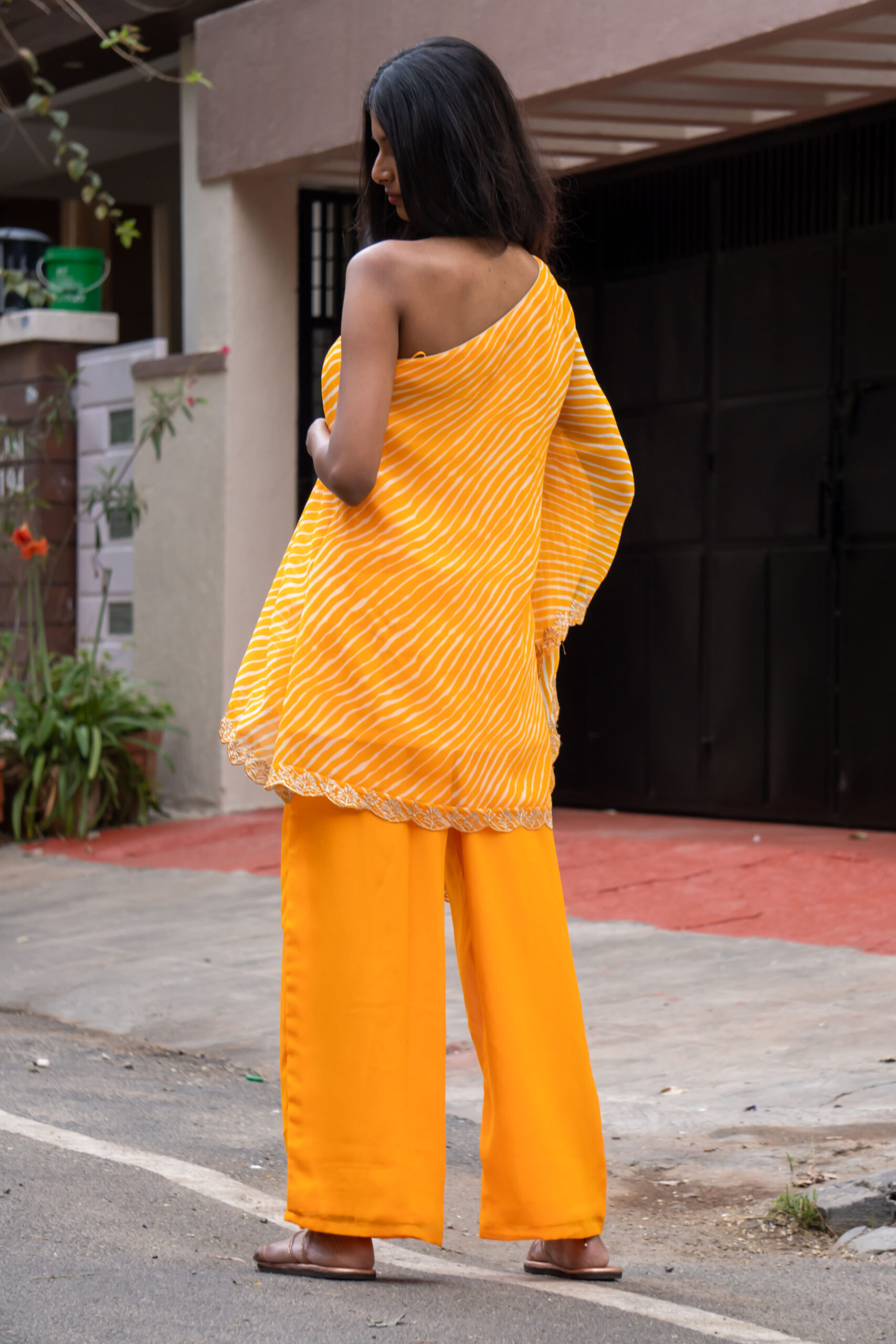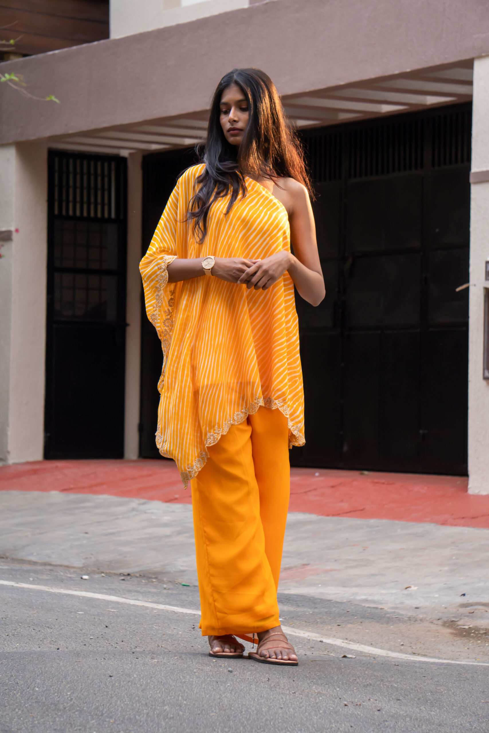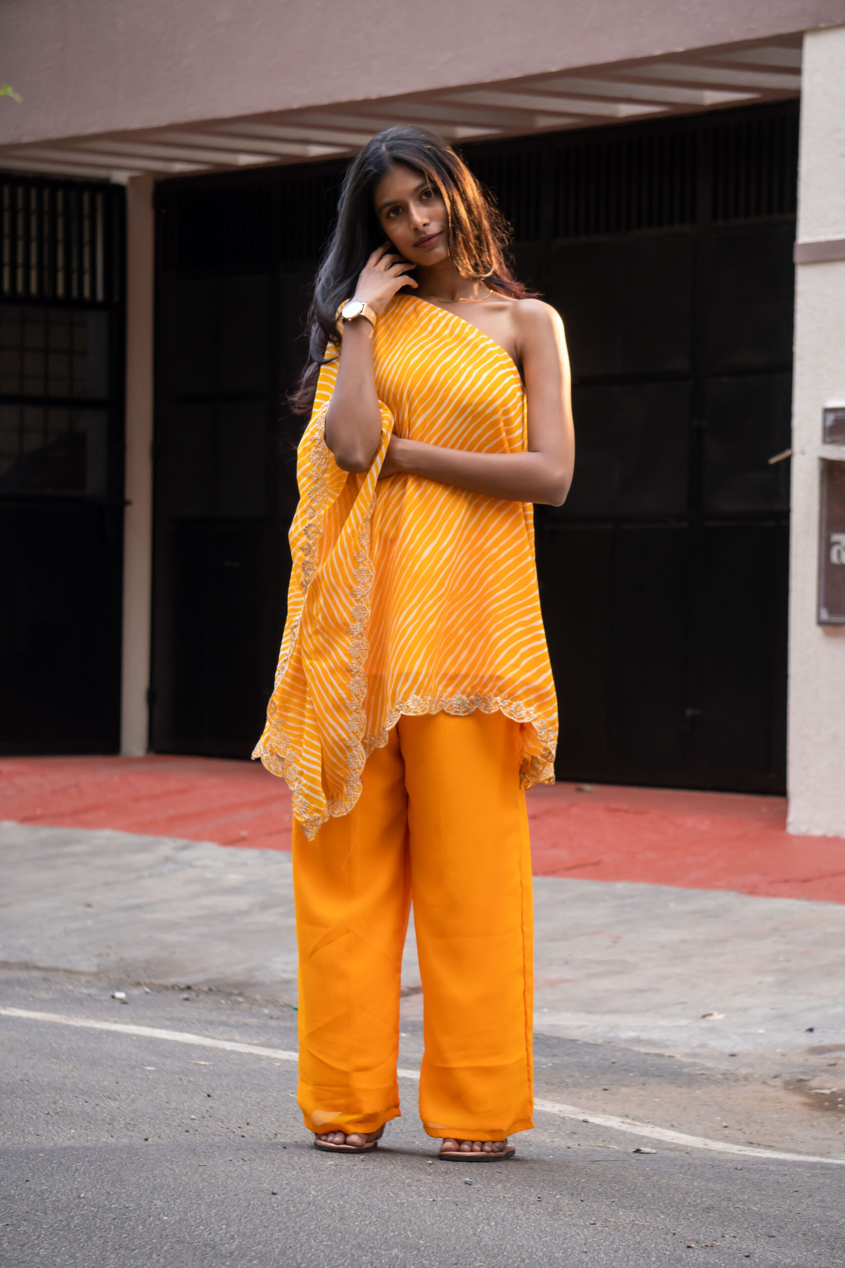 Shine bright at your next celebration with our stunning asymmetric neck kaftan, beautifully upcycled from a yellow georgette lehariya saree. Paired with a flowy georgette flared pant, this outfit is perfect for haldi ceremonies, festive gatherings, or special occasions. The vibrant yellow hue and intricate lehariya print make it a showstopper that’s sure to make you feel like a ray of sunshine